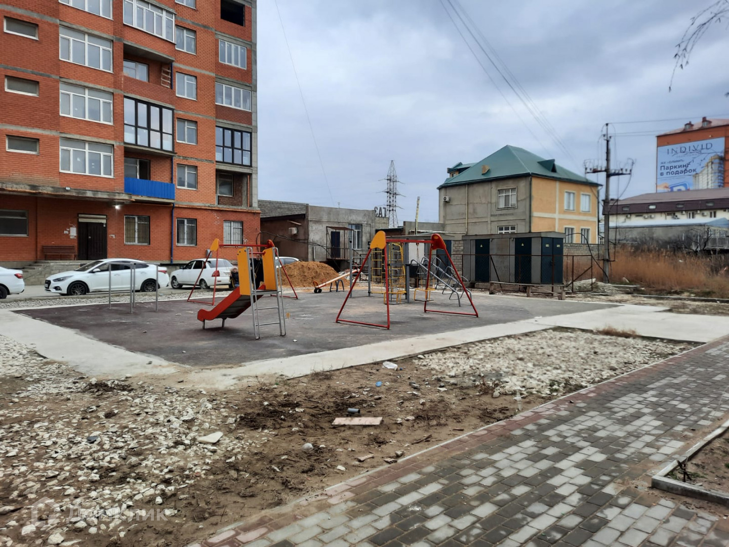 Благоустроенный двор с детской площадкой и асфальтированные парковочные места для вашего авто.