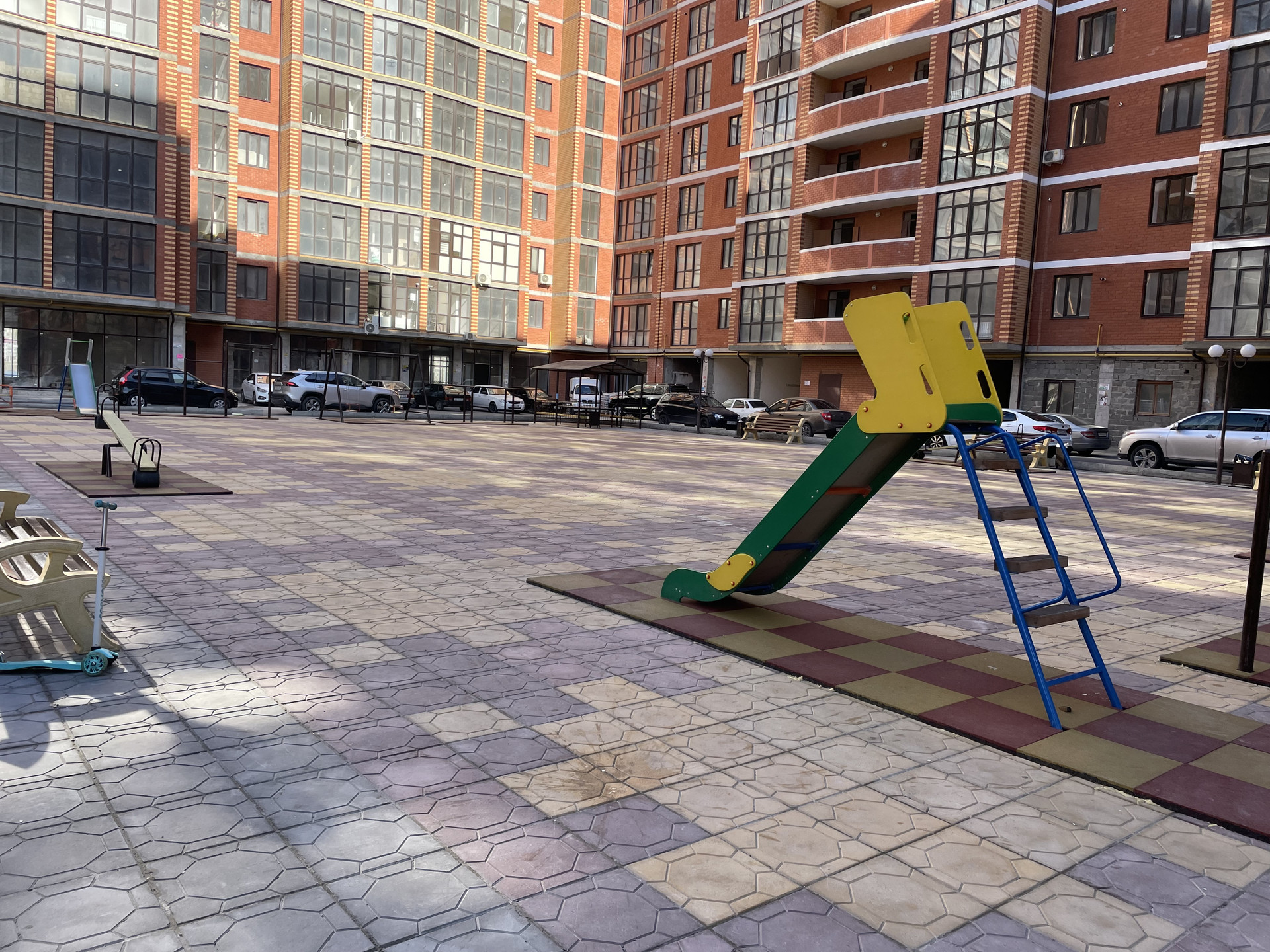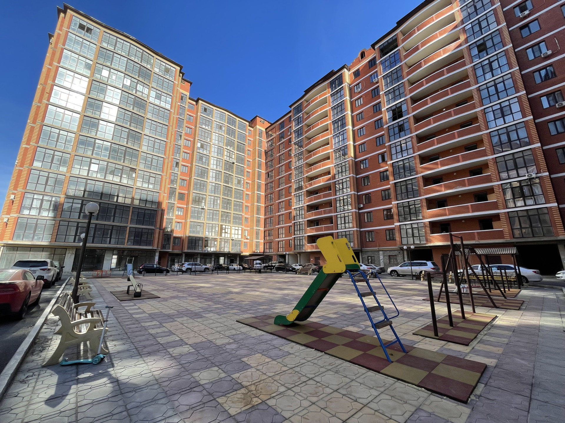 ✅ Перед домом имеется огромный двор, детская площадка, подростковая площадка, гостевой паркинг. А так же имеется подземный паркинг.