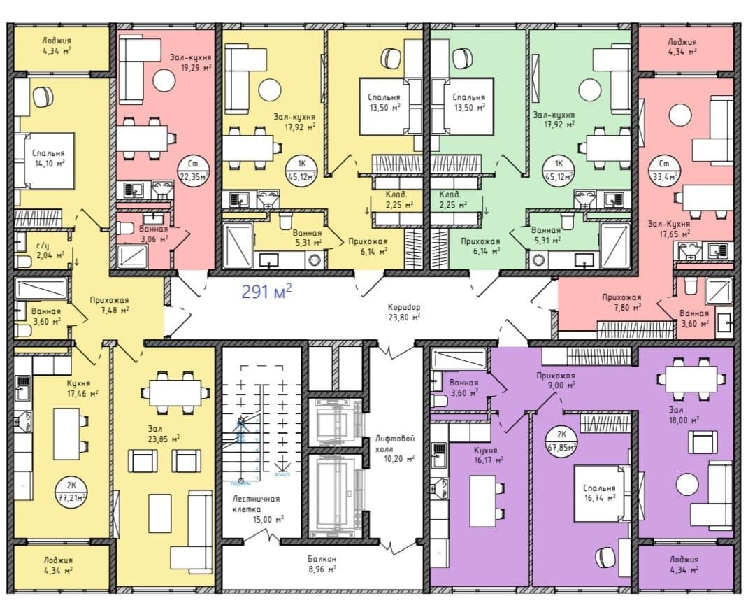 Дома 12 этажей, есть однокомнатная, двухкомнатная и студия.