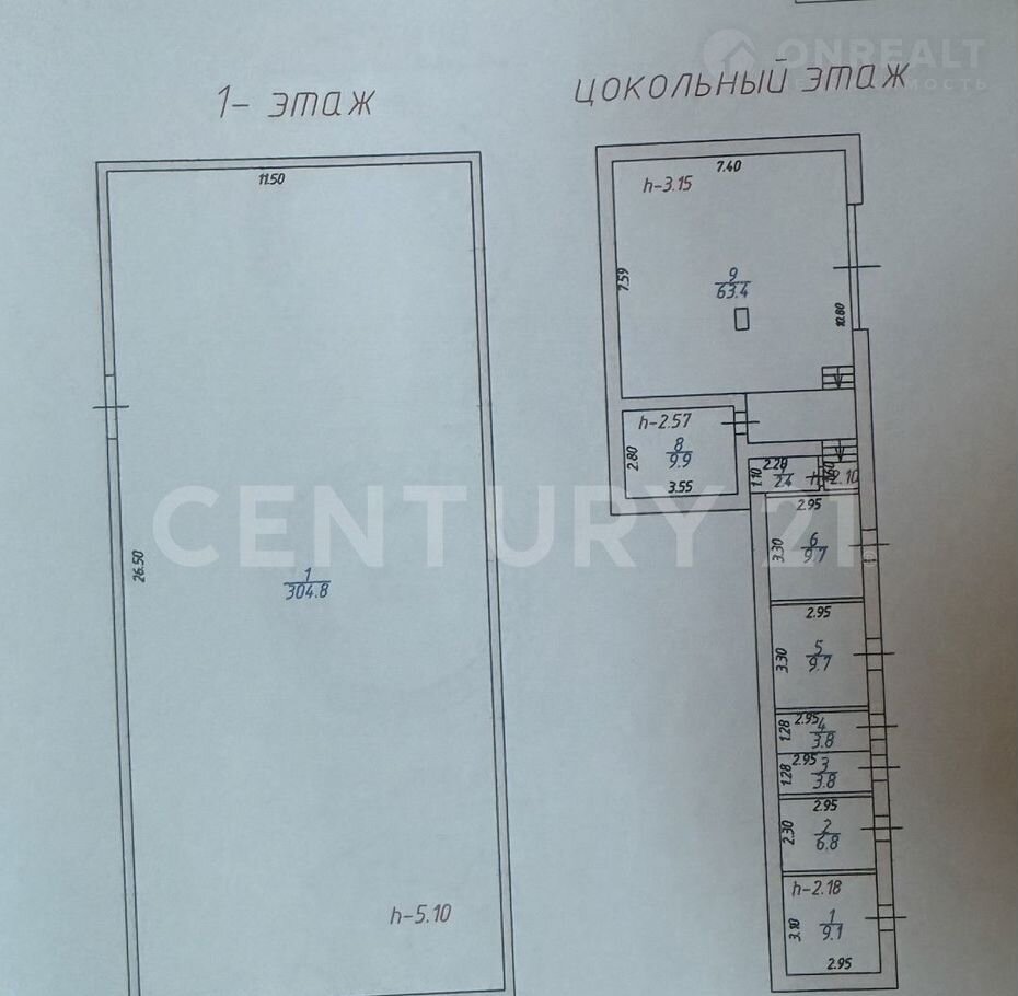 1-й этаж: площадь 306 кв. м, с высокими потолками 5,1 м, идеально подходит для торговли или офиса.