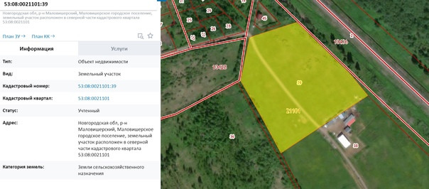 - Площадь участка 26 881 кв.м., категория земель: земли сельскохозяйственного назначения, разрешенное использование: для сельскохозяйственного производства, кадастровый номер 53:08:0021101:39.