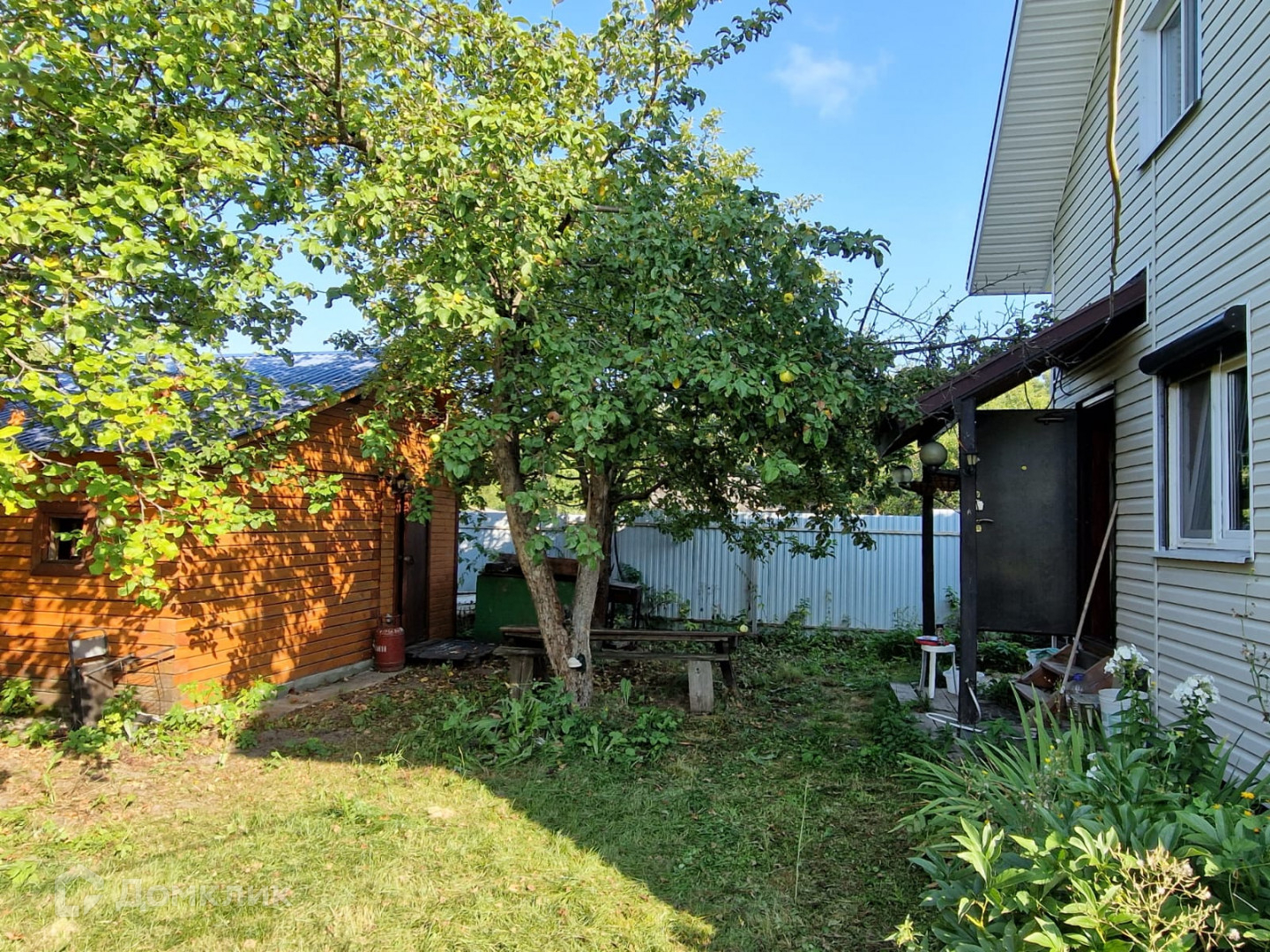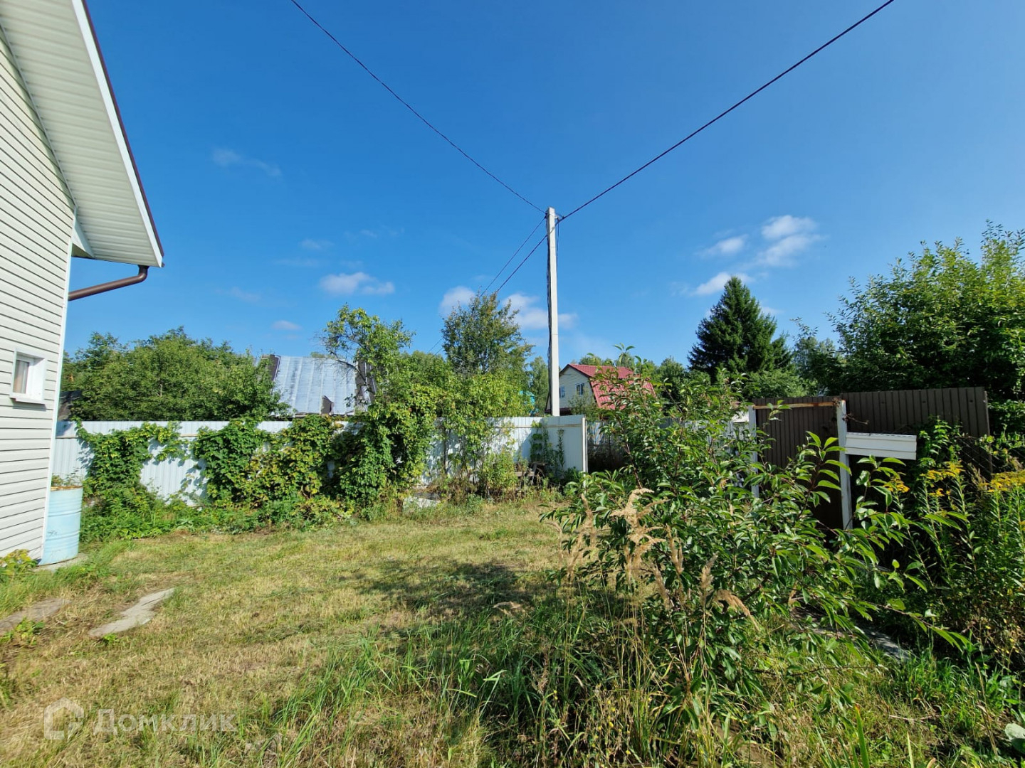 Участок огорожен забором из рабицы и профнастила.