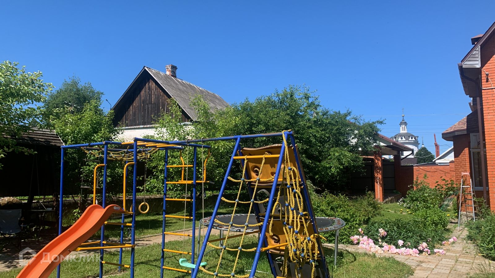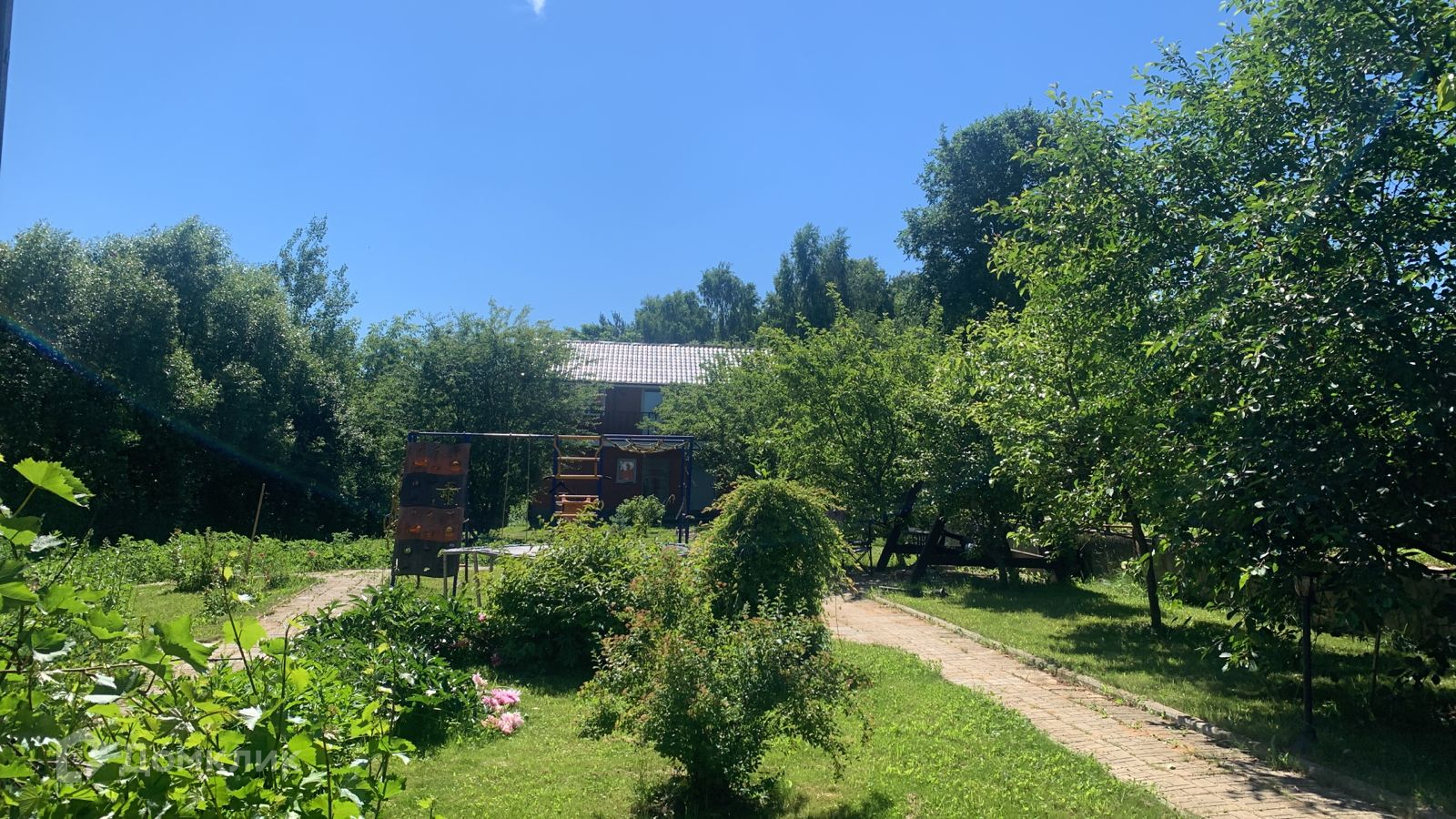 На участке растут цветы, плодовые деревья, газон.