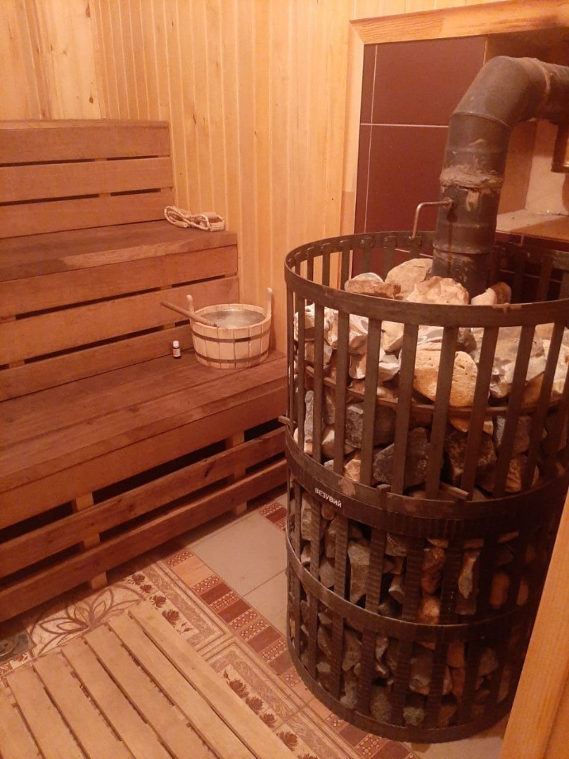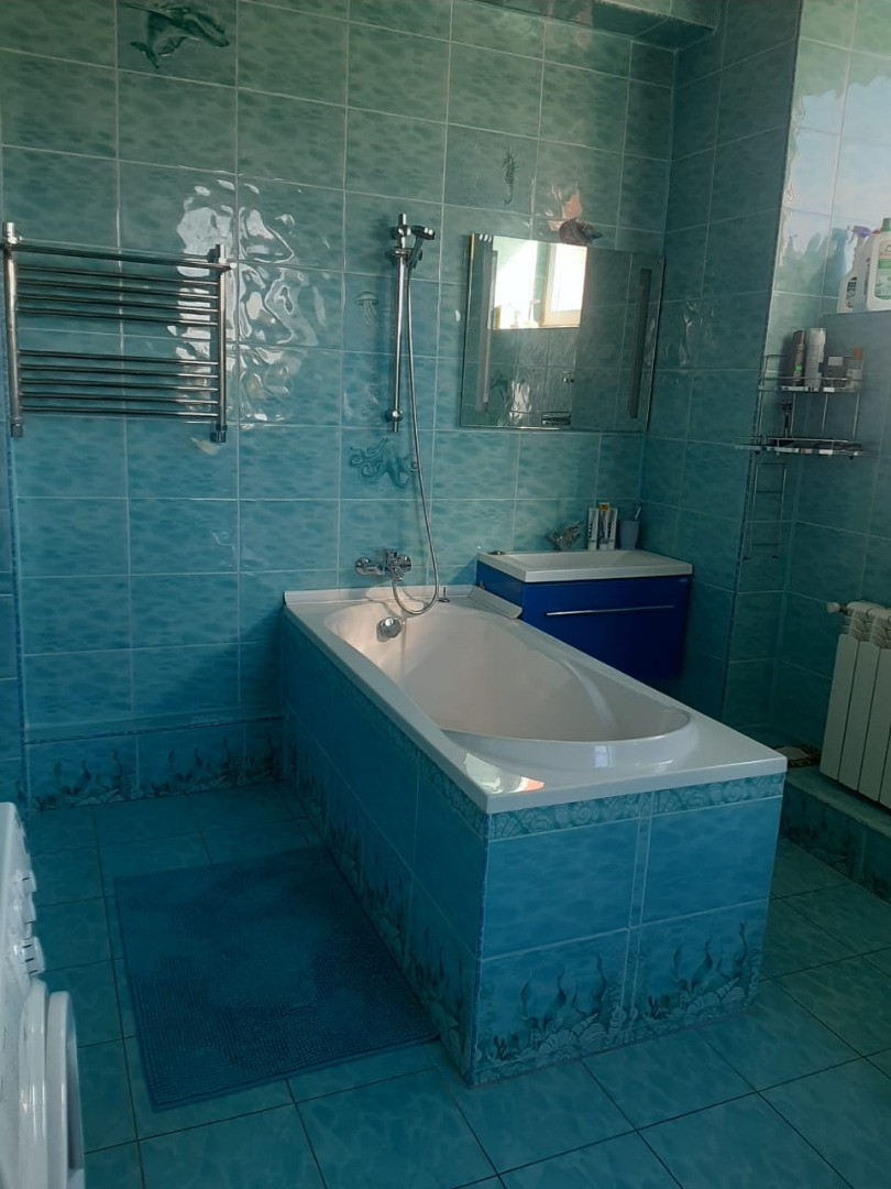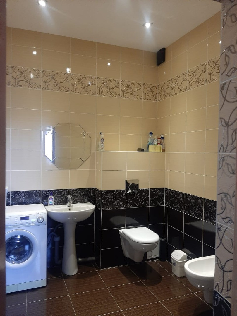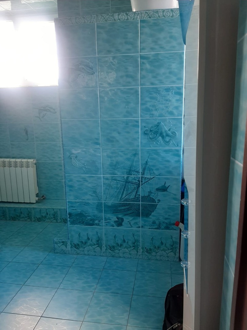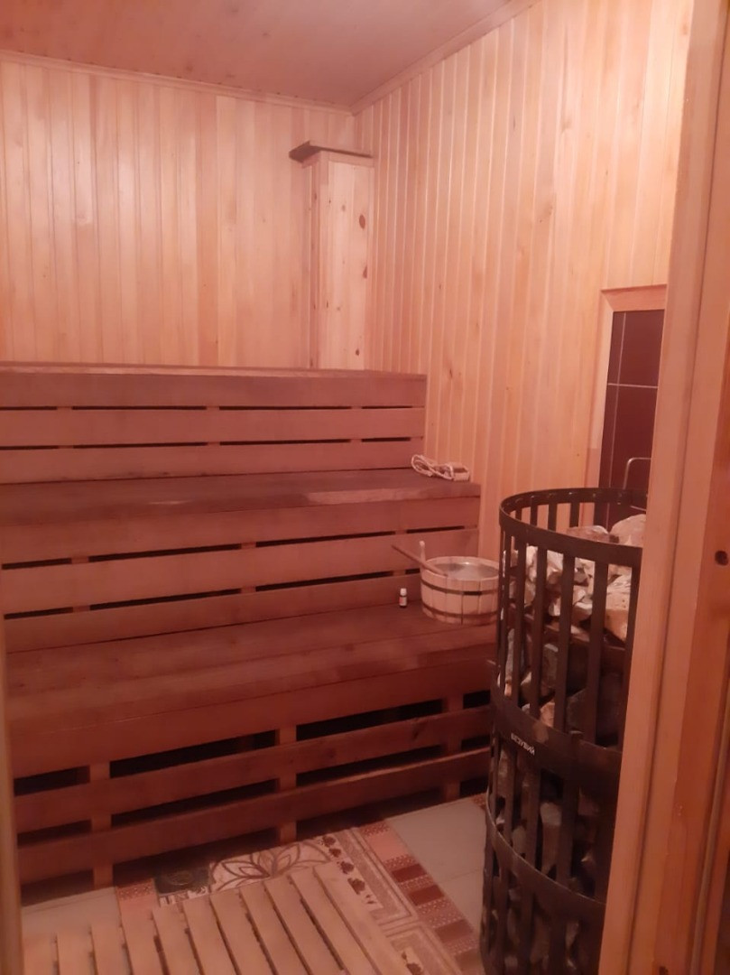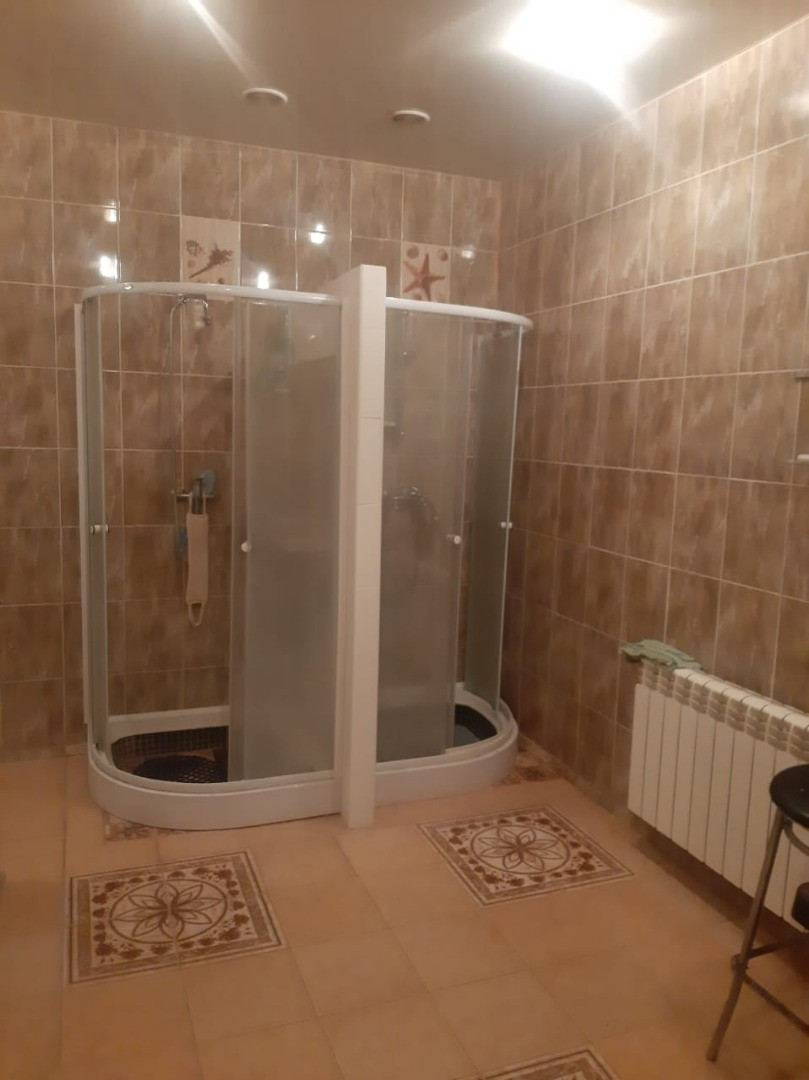 На первом этаже шикарная гостиная с выходом на террасу, санузел ( ванна/ душ/ унитаз), бойлерная. Есть баня с двумя душевыми кабинами.