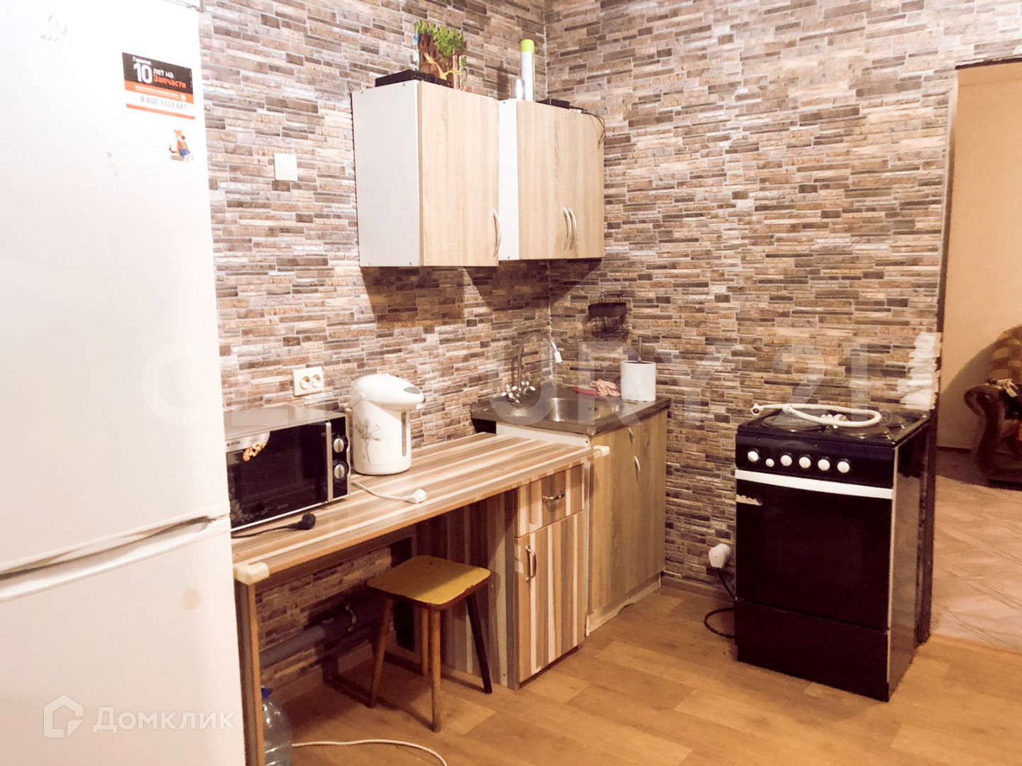 Комната разделена на прихожую/зал и кухня/жилая комната. В комнате остается: стенка, мягкая мебель, кровать, несколько шкафов на кухне, холодильник.