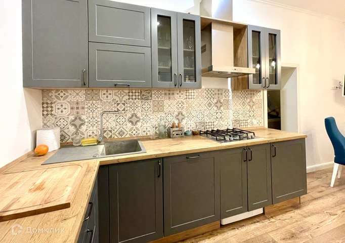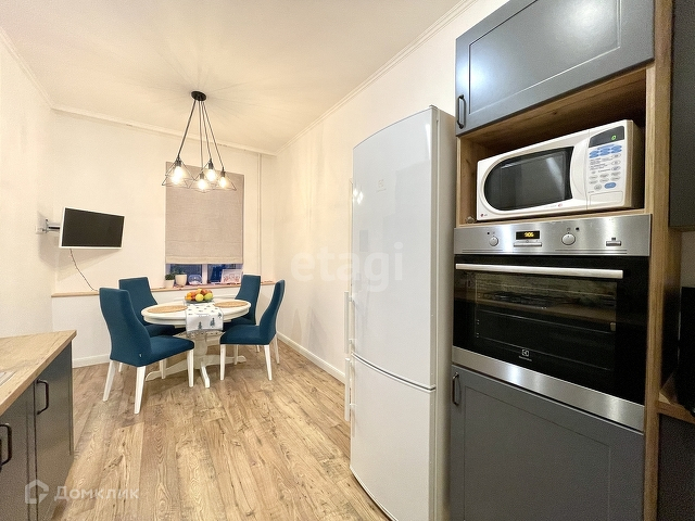 Кухонная зона не загромождена. Вас ждут стильные фасады встроенного гарнитура и ультрасовременная бытовая техника для приготовления любых блюд.