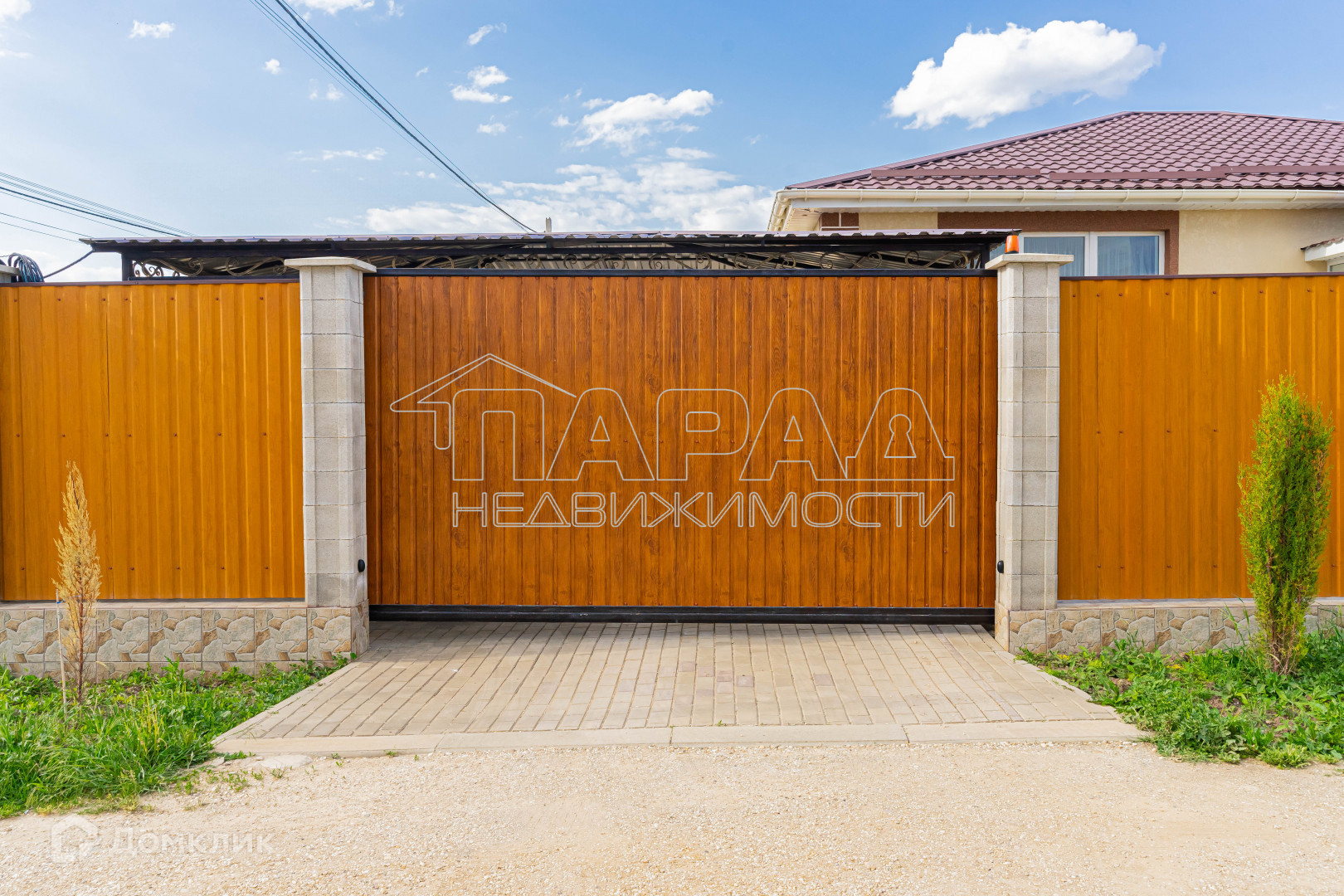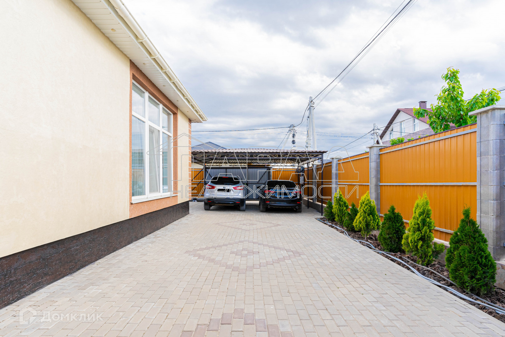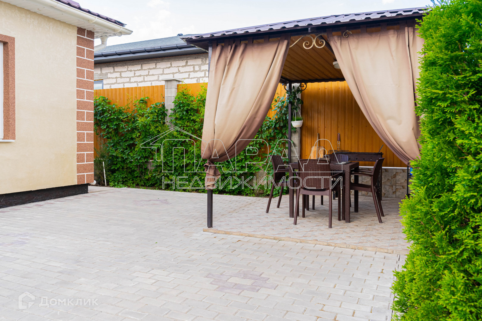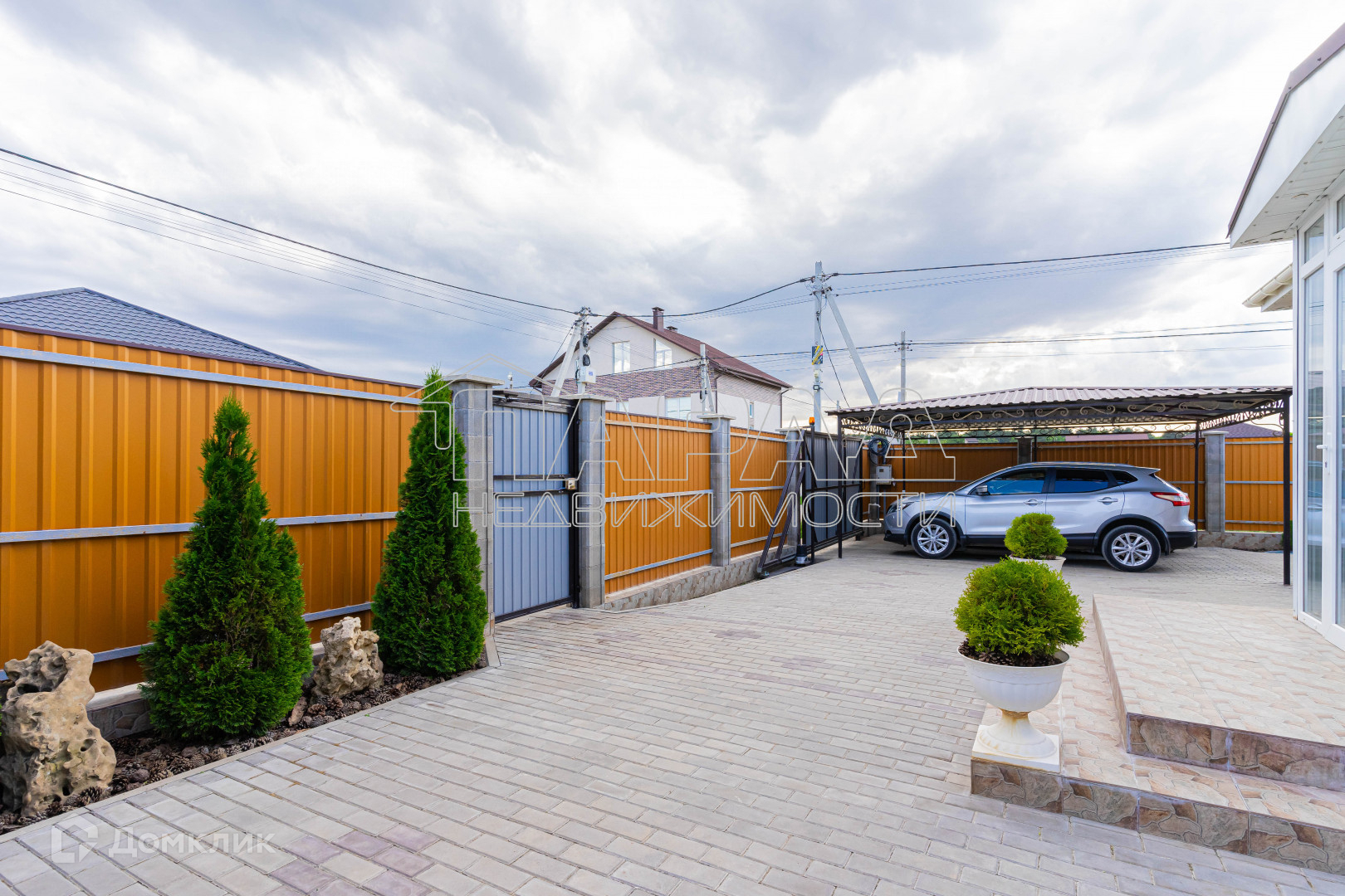 Участок угловой, ровный, квадратной формы, двор в плитке, имеется навес для машины, хозпомещения, а также зона для отдыха. Как во дворе, так и за двором высажены различные деревья и кустарники. Откатные ворота на пульте.