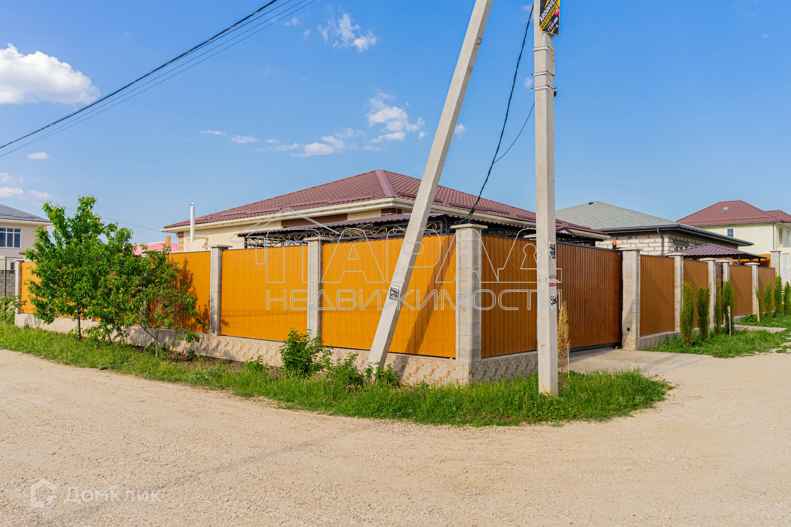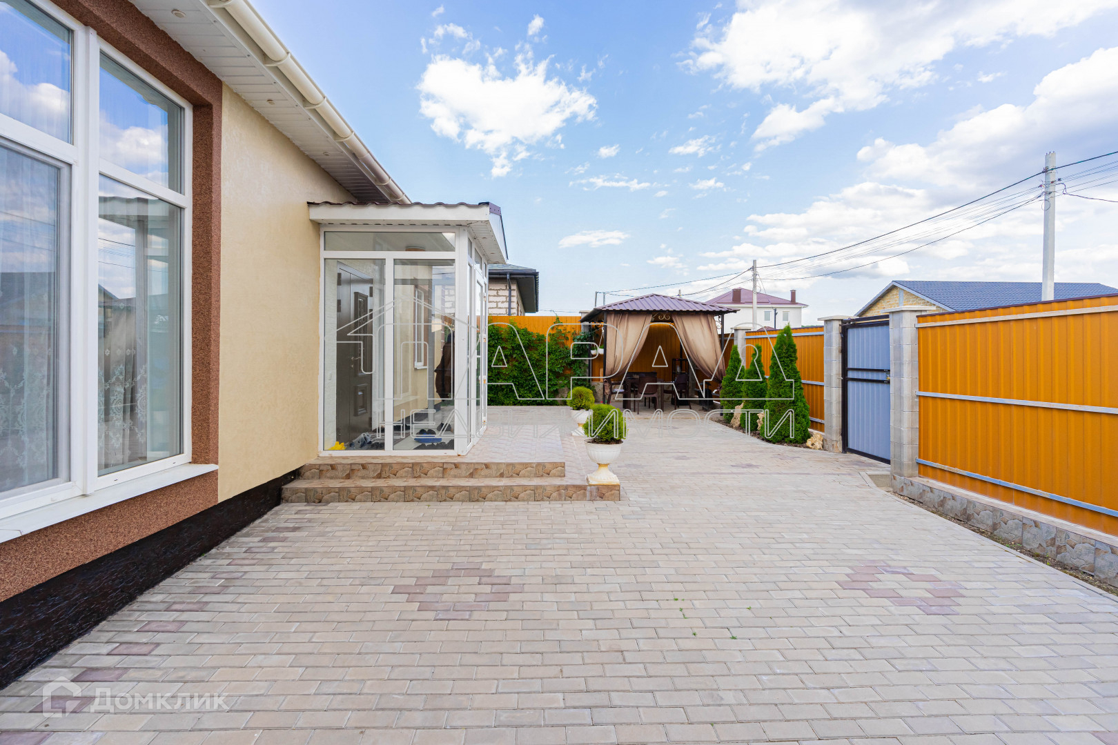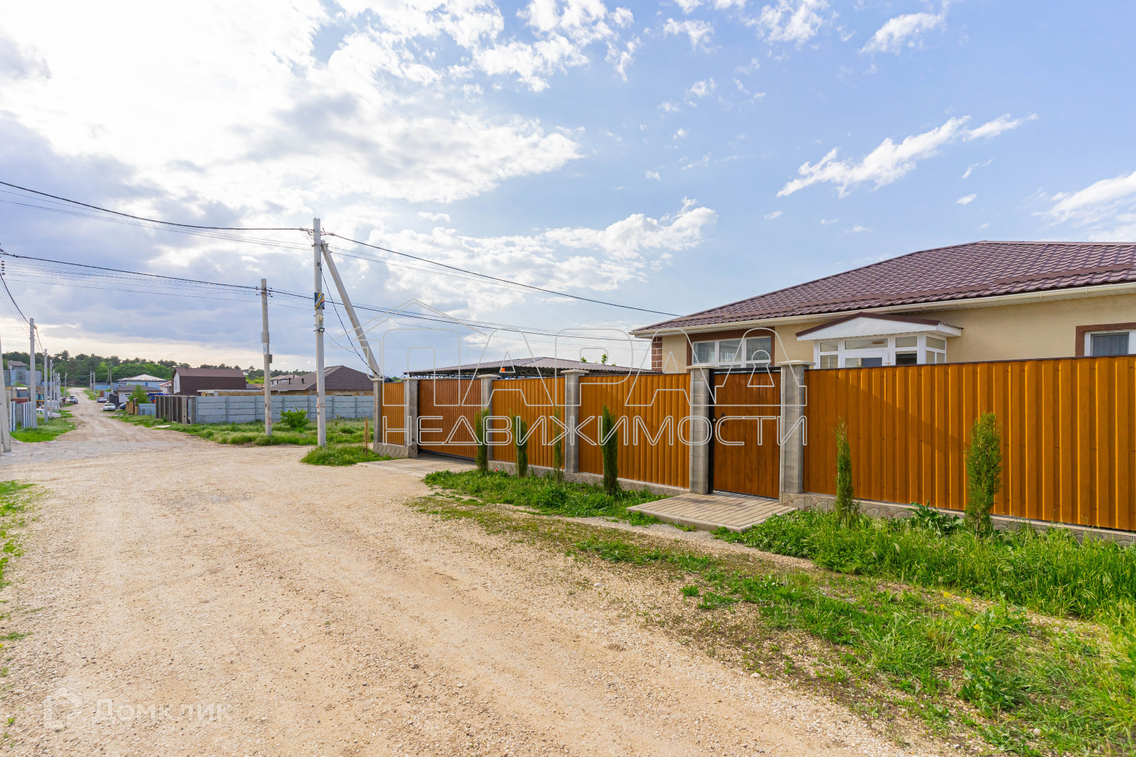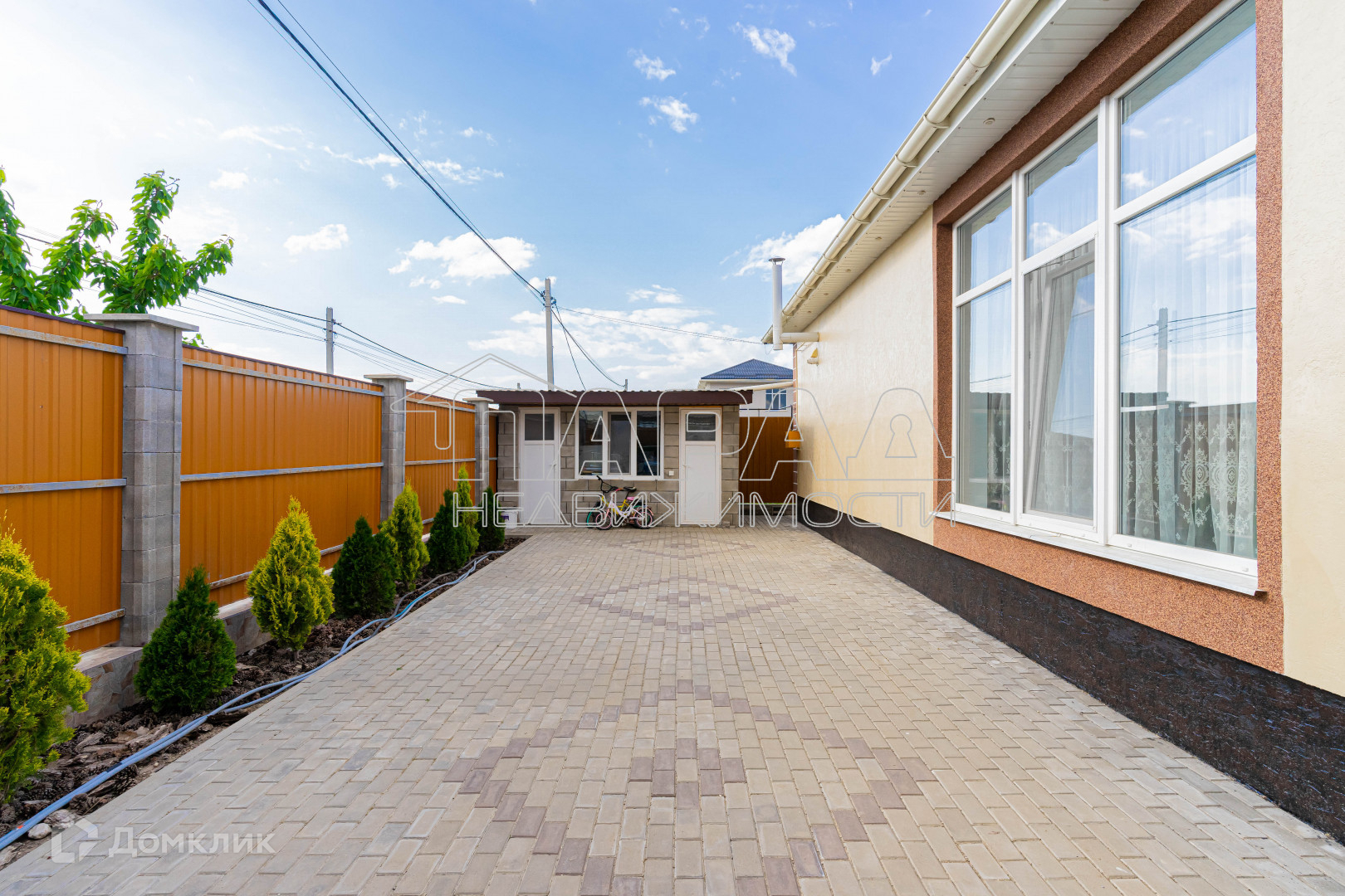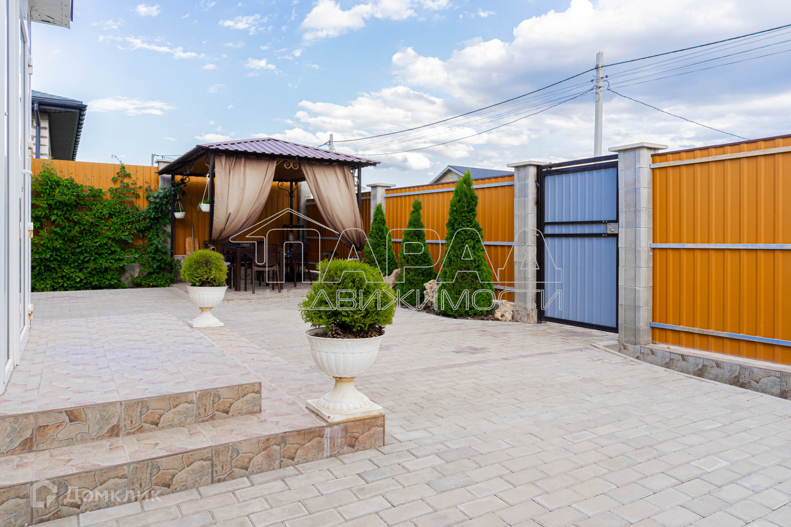 Участок угловой, ровный, квадратной формы, двор в плитке, имеется навес для машины, хозпомещения, а также зона для отдыха. Как во дворе, так и за двором высажены различные деревья и кустарники. Откатные ворота на пульте.