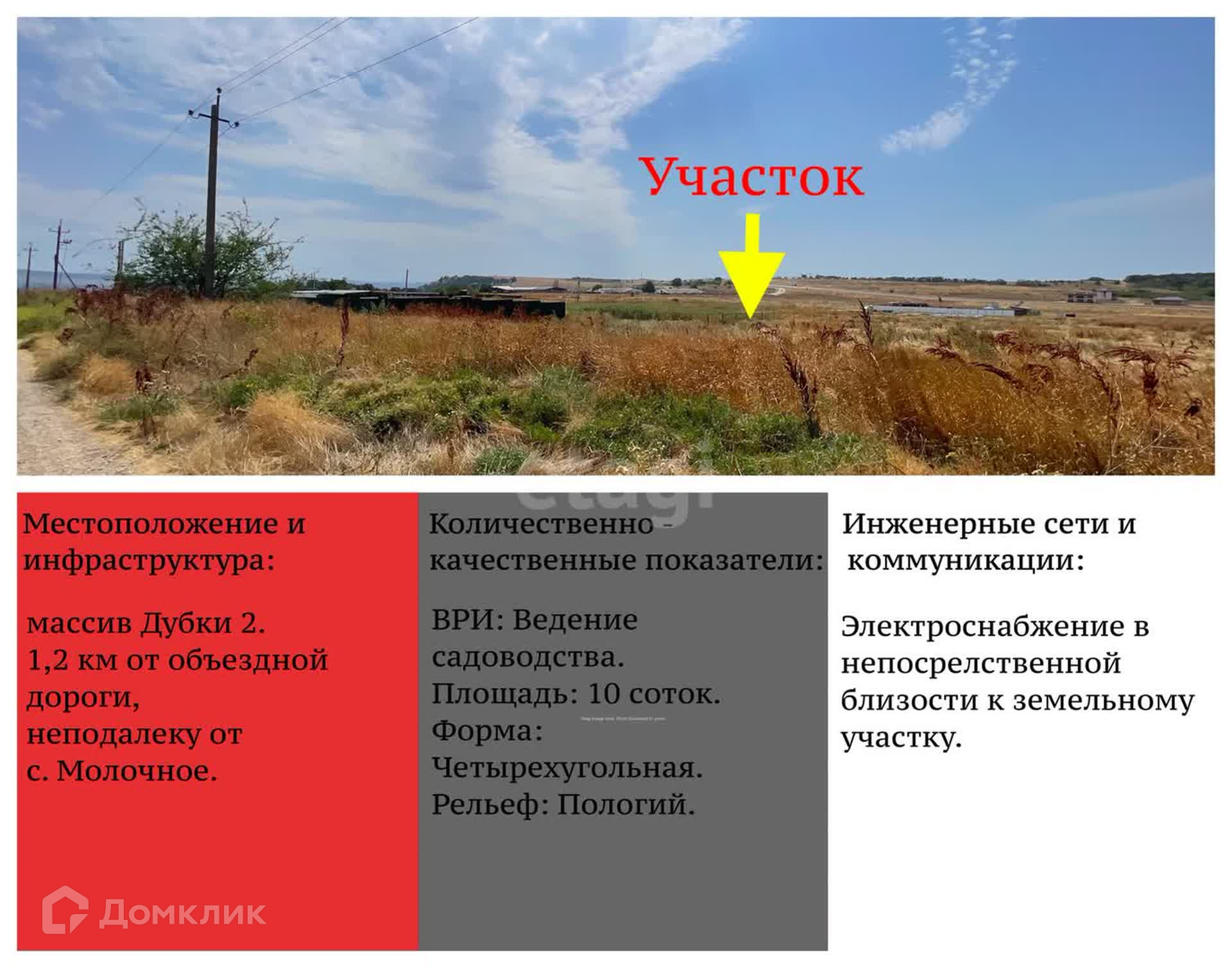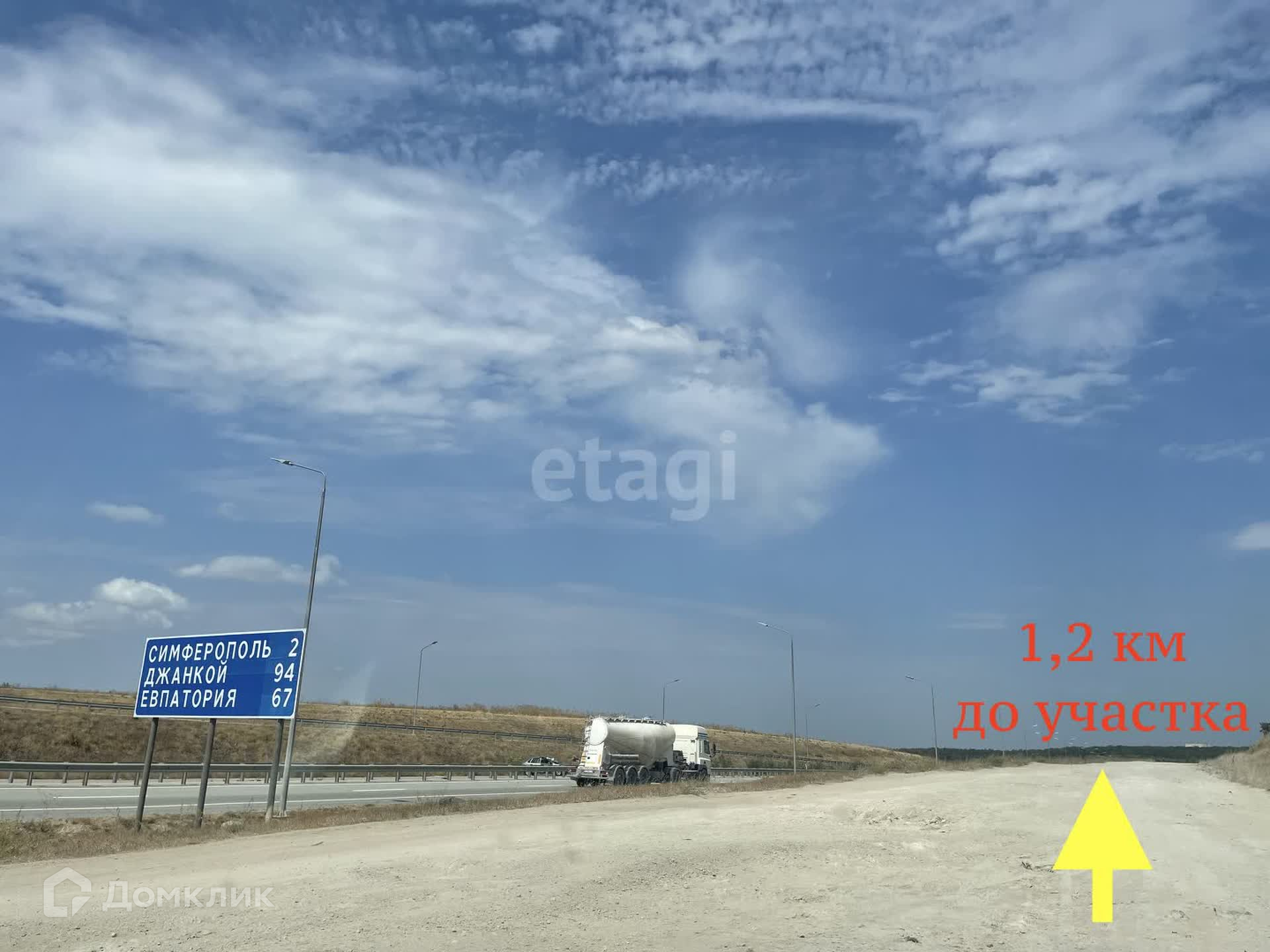 Земельный участок расположен в 1,2 км от хорошей асфальтированной дороги в с. Молочное и заезда на Объездную дорогу.