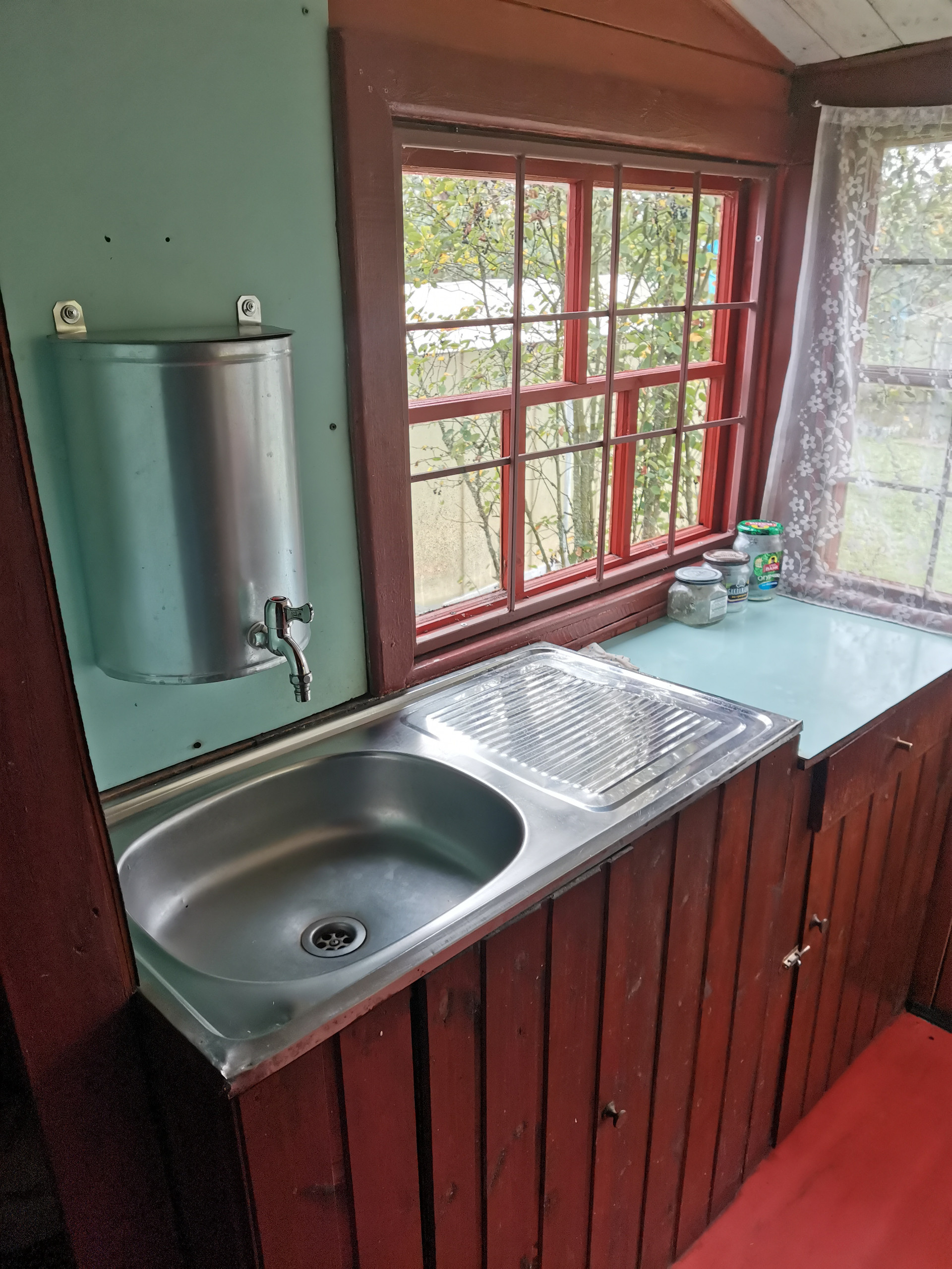 Кухня располагается при входе в дом и оборудована встроенной мойкой, газовой плитой, посудным шкафом с рабочей поверхностью и полками для хранения. Газ подается из большого баллона, расположенного в металлическом шкафу снаружи дома, в защищенном от солнца месте. Отвод воды из мойки на кухне организован в дренажное поле.