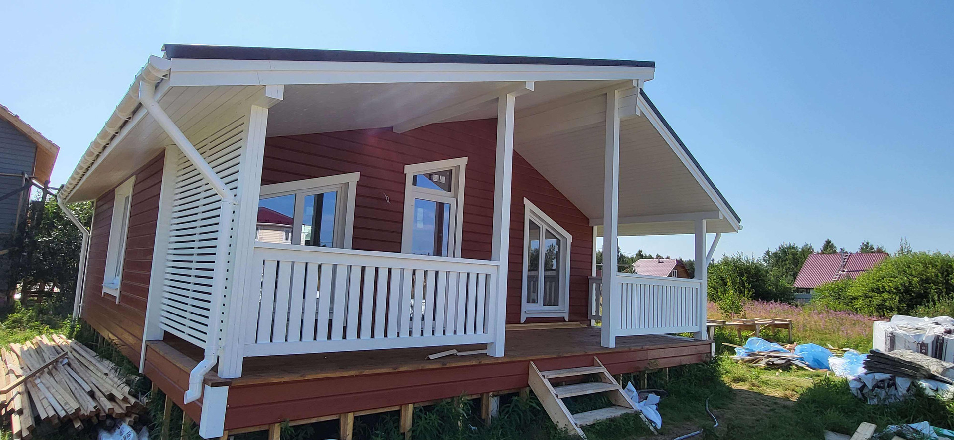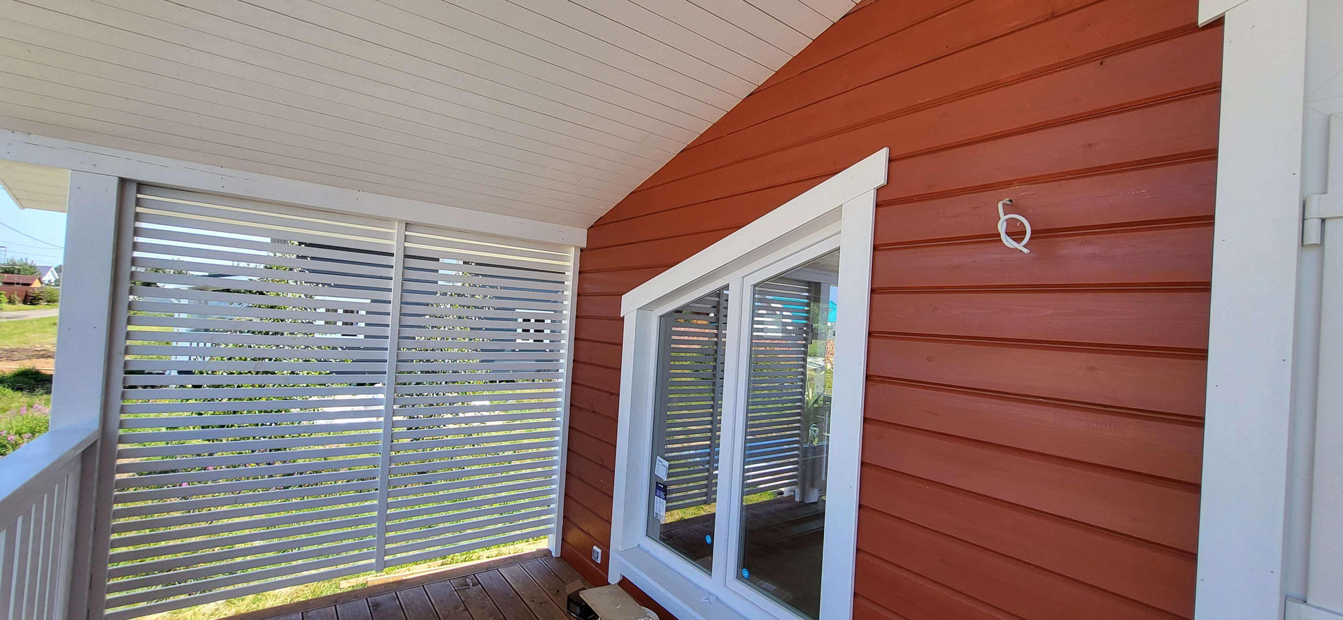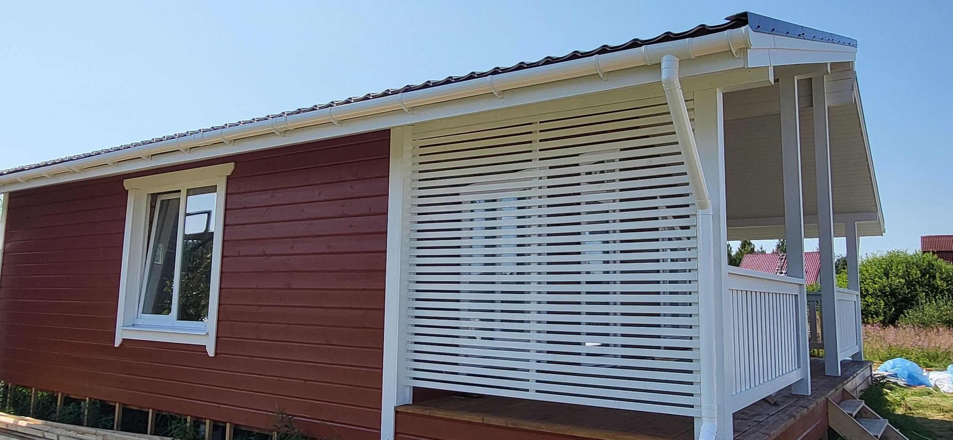 В качестве внутренней отделки имитация бруса "карельский профиль" с покраской на производстве финским лессирующим аквалаком для придания цвета и защиты от УФ