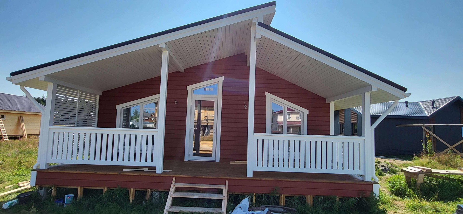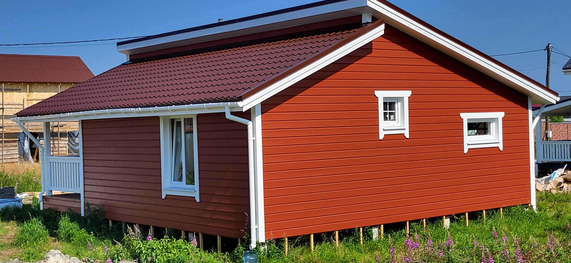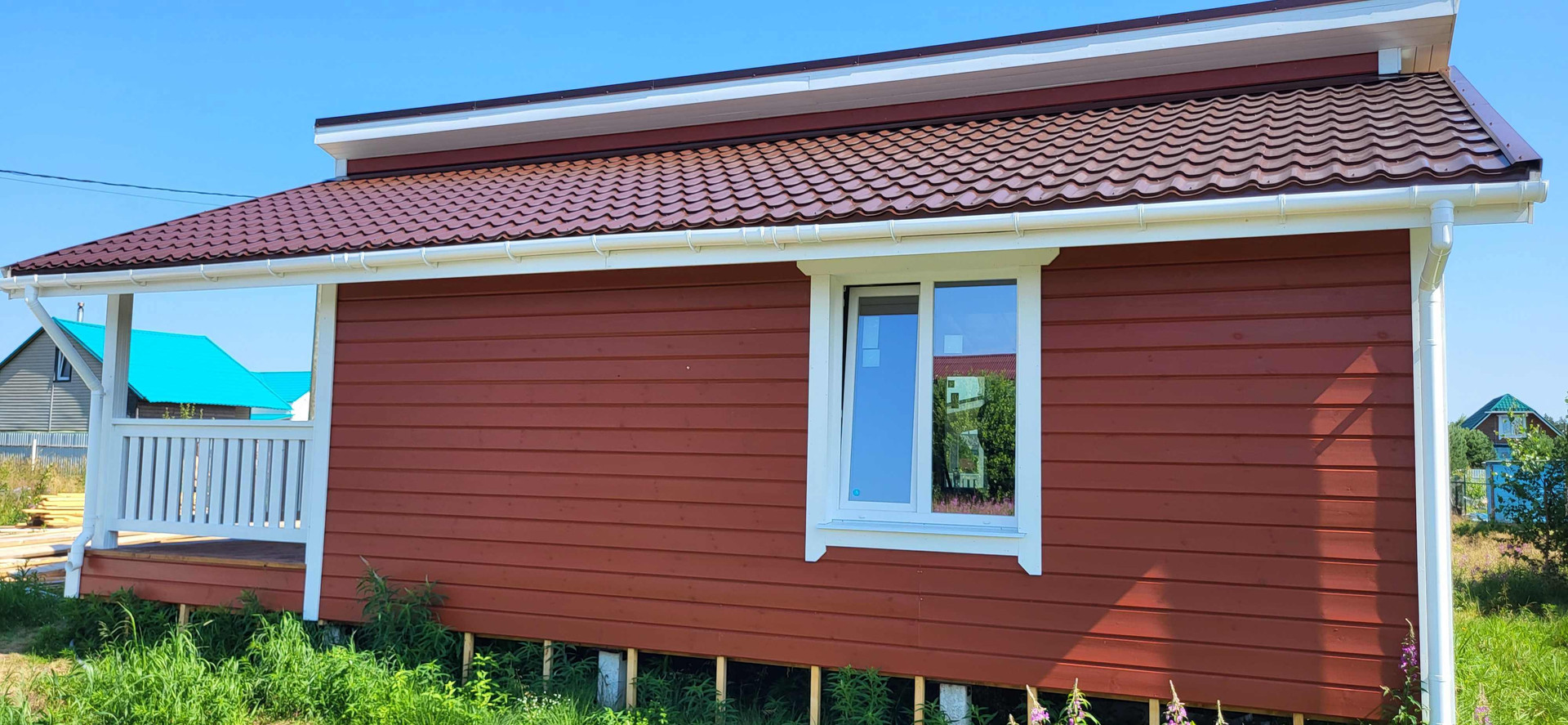 В качестве внутренней отделки имитация бруса "карельский профиль" с покраской на производстве финским лессирующим аквалаком для придания цвета и защиты от УФ