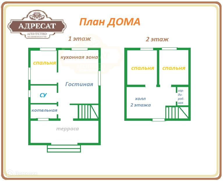 - двухэтажный дом 80м2 каркасного типа, с тремя (одна на первом и две на втором) спальнями, кухней - гостиной, санузлом и котельной;