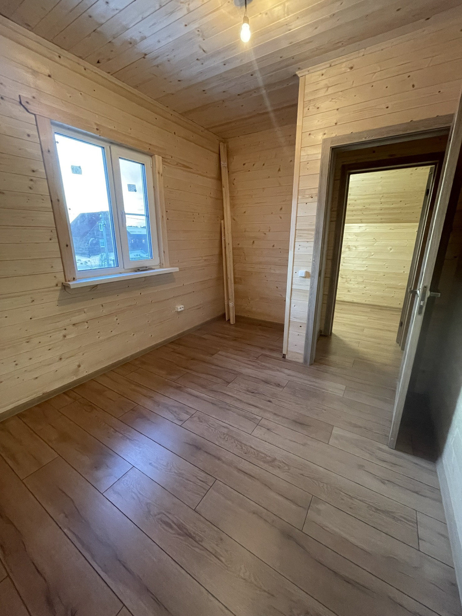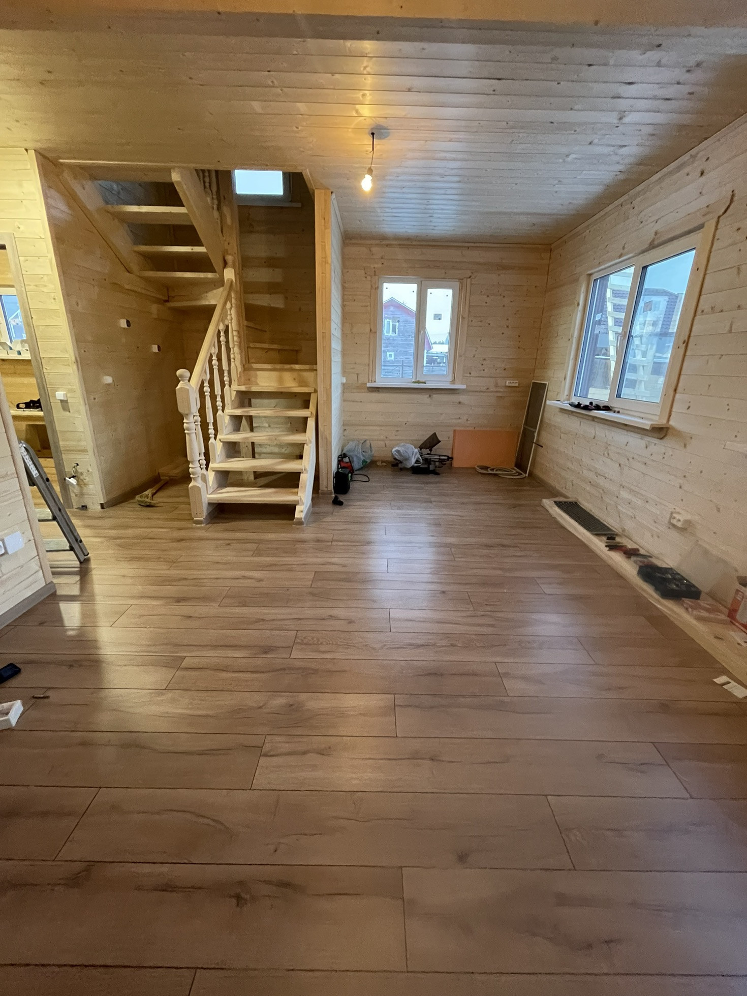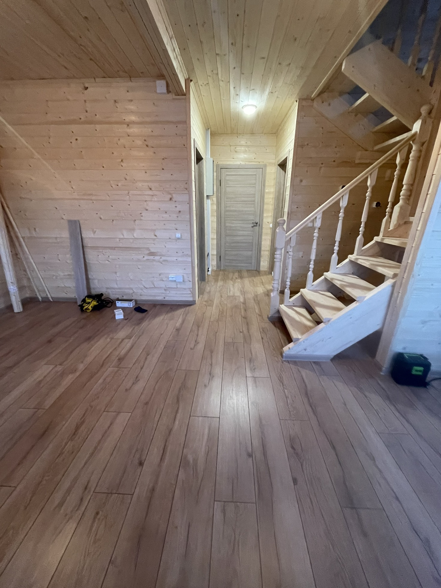 Уложен ламинат, Теплый пол весь первый этаж с системой Умный дом, установлены двери, сделана вся разводка электричества.