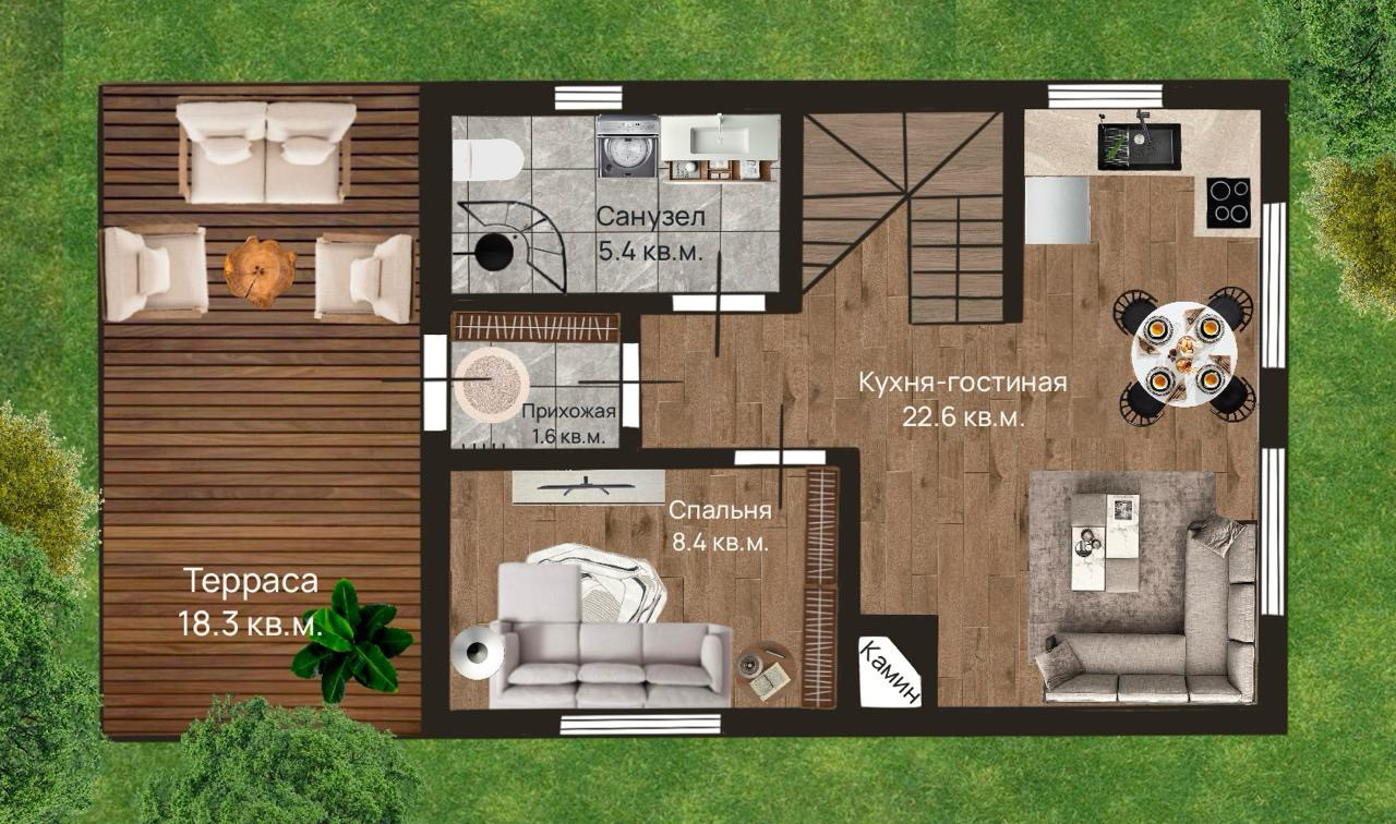 1 этаж - Кухня-гостиная, Комната, Прихожая, просторный с/у и техническое помещение под лестницей.