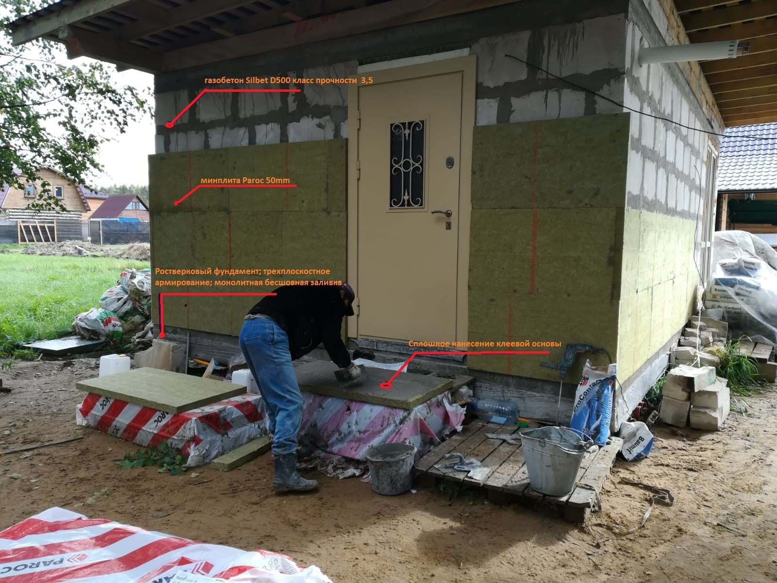 Дом построен из газобетонных блоков с последующим утеплением базальтовыми плитами по технологии Baumit