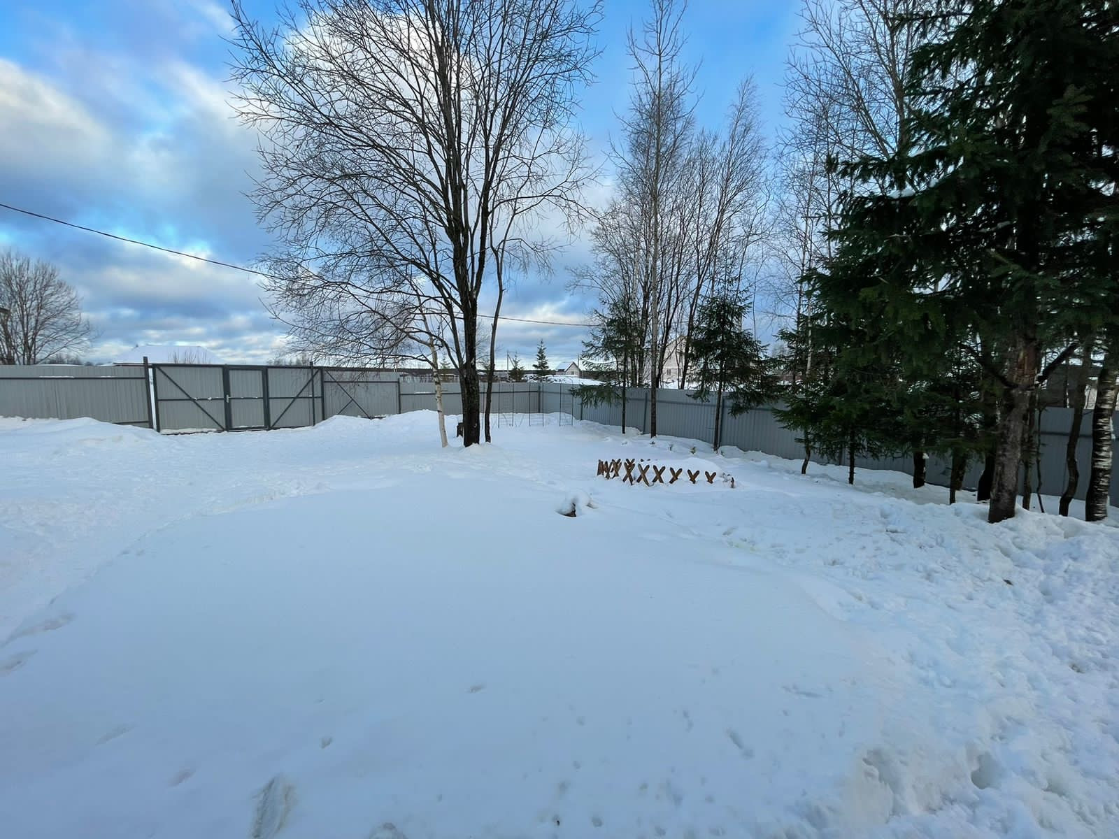 Участок огорожен забором, а за счет того, что дом удачно расположен в уголке, на нем много места.