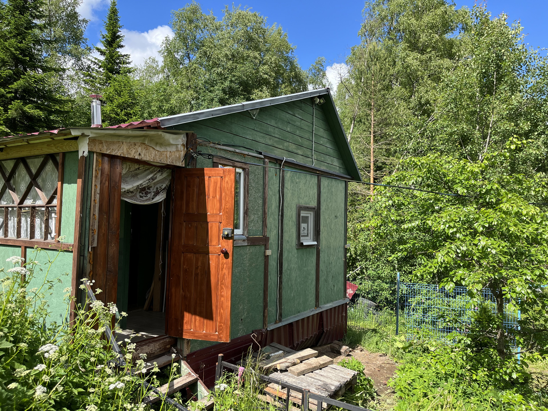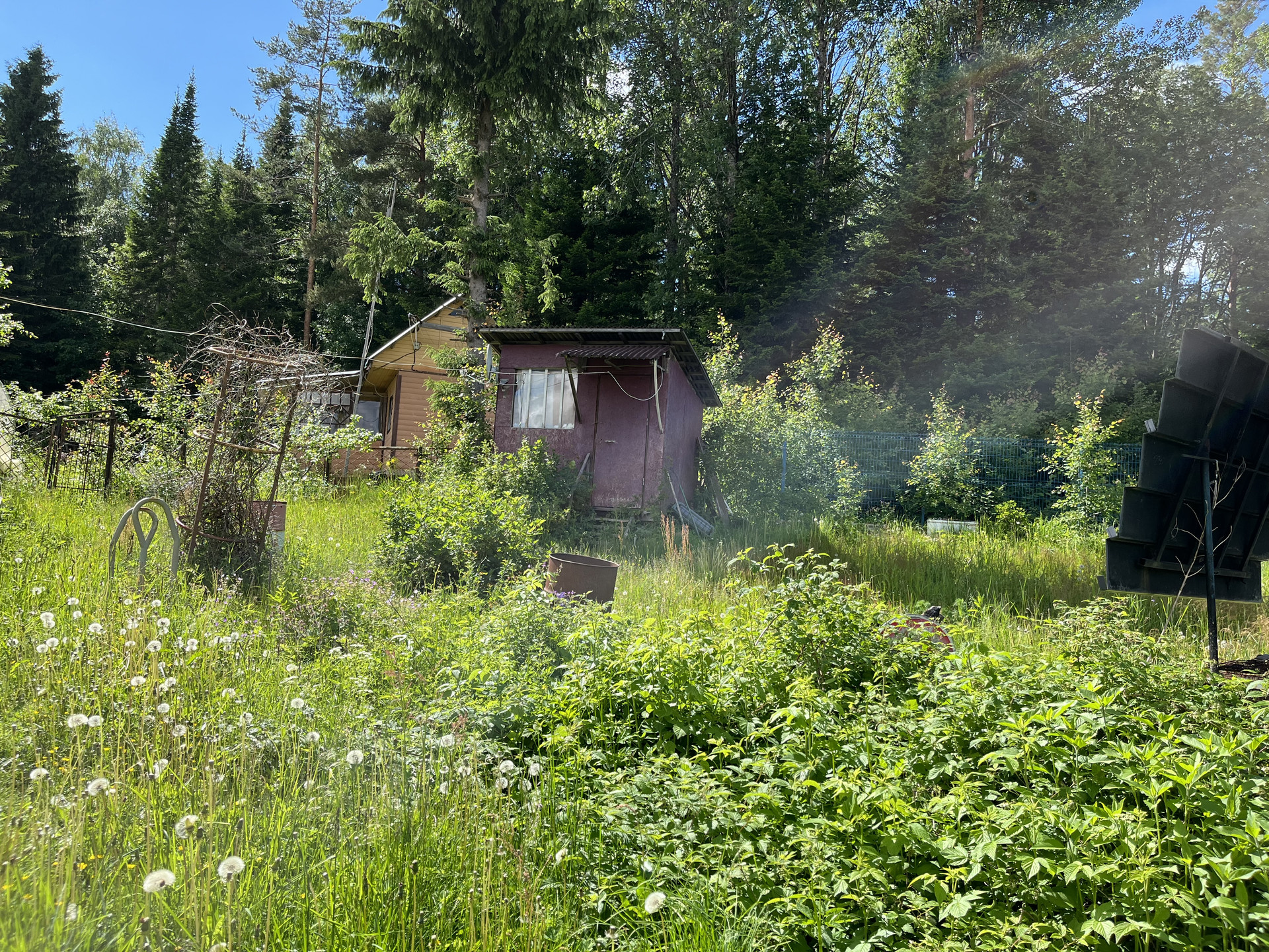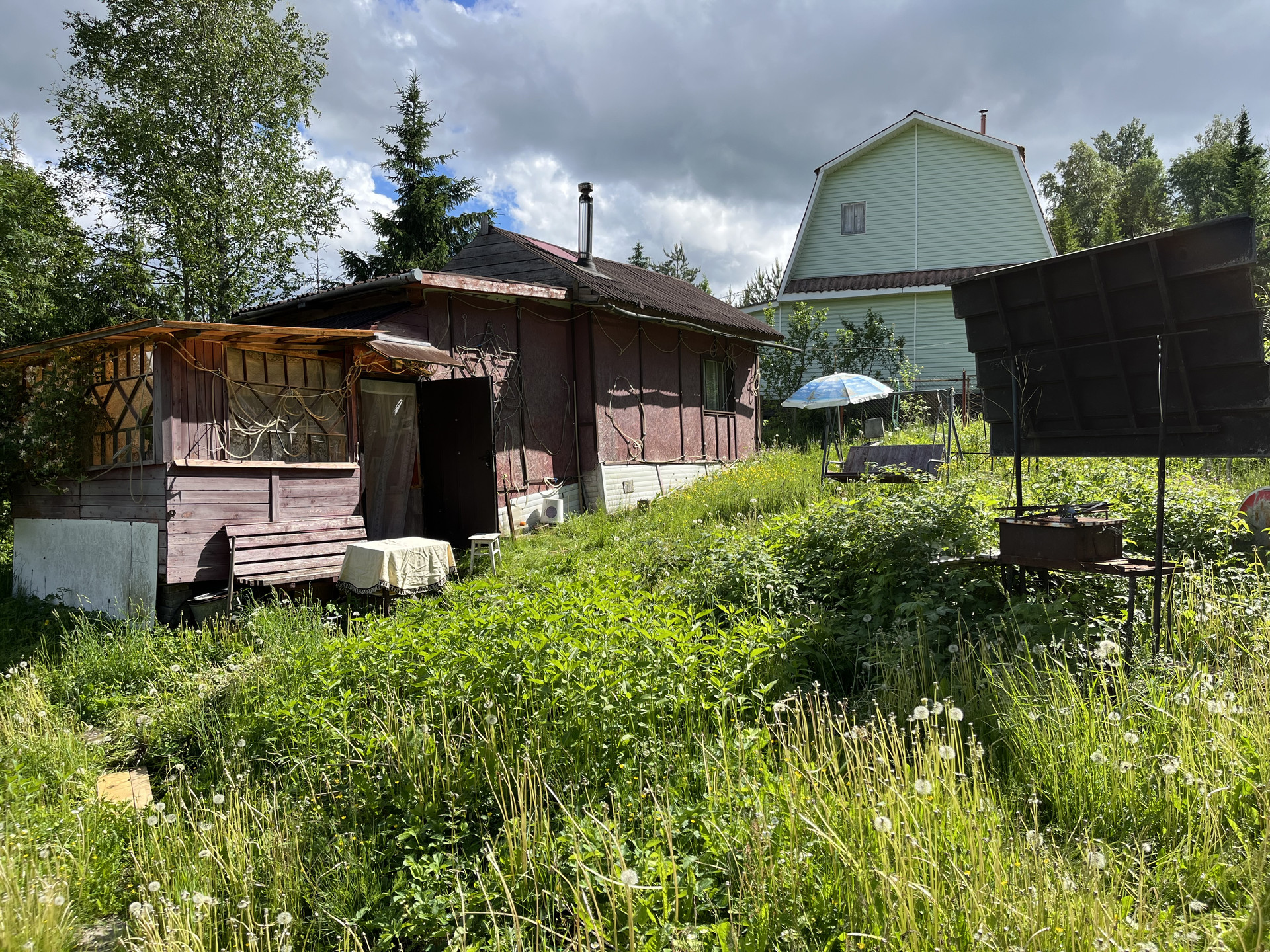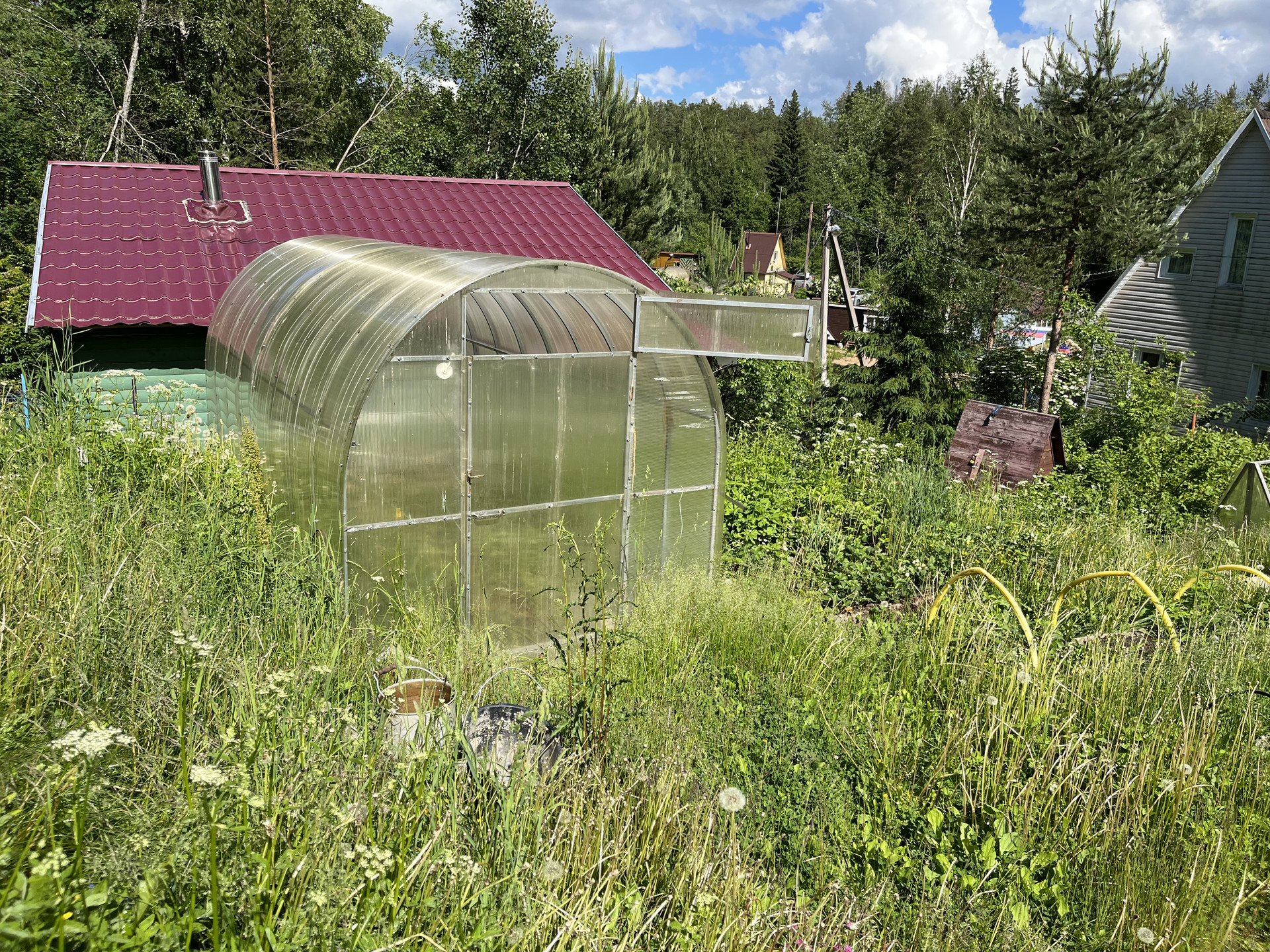 На участке утепленный садовый зимний дом 27 кв м, отопление печное. (Веранда, кухня, комната). Летний водопровод, электричество 3 фазы, 15 кв.
