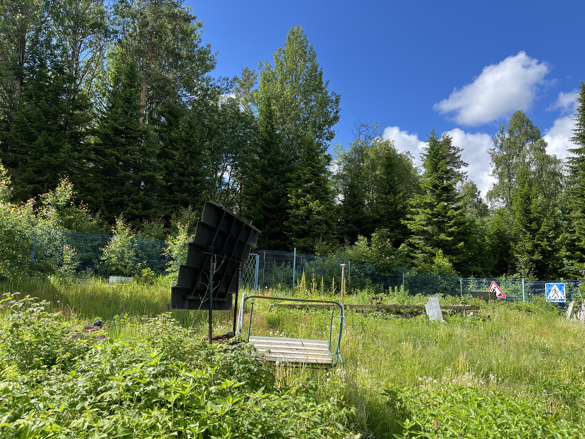 Участок на возвышенности, окружен канадскими елями, забор по периметру.