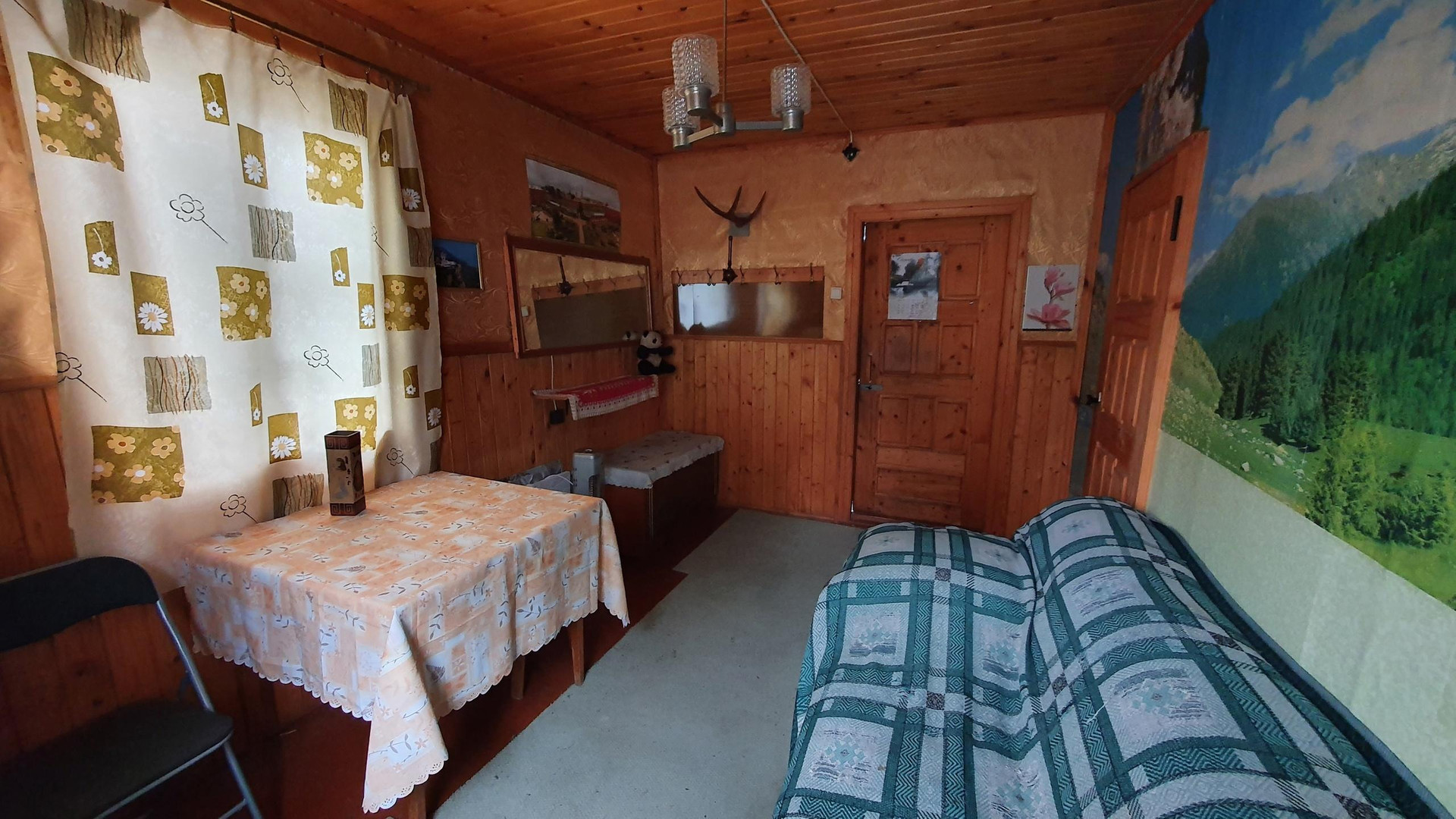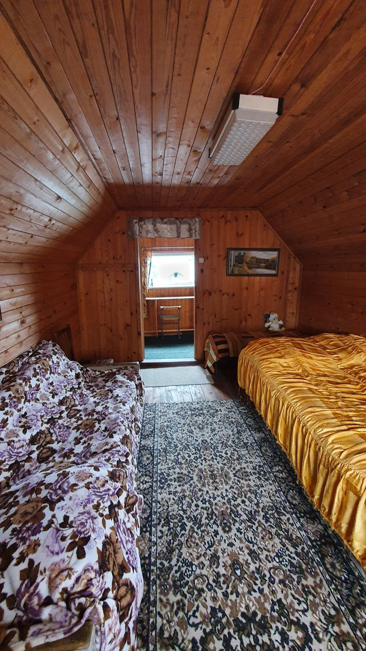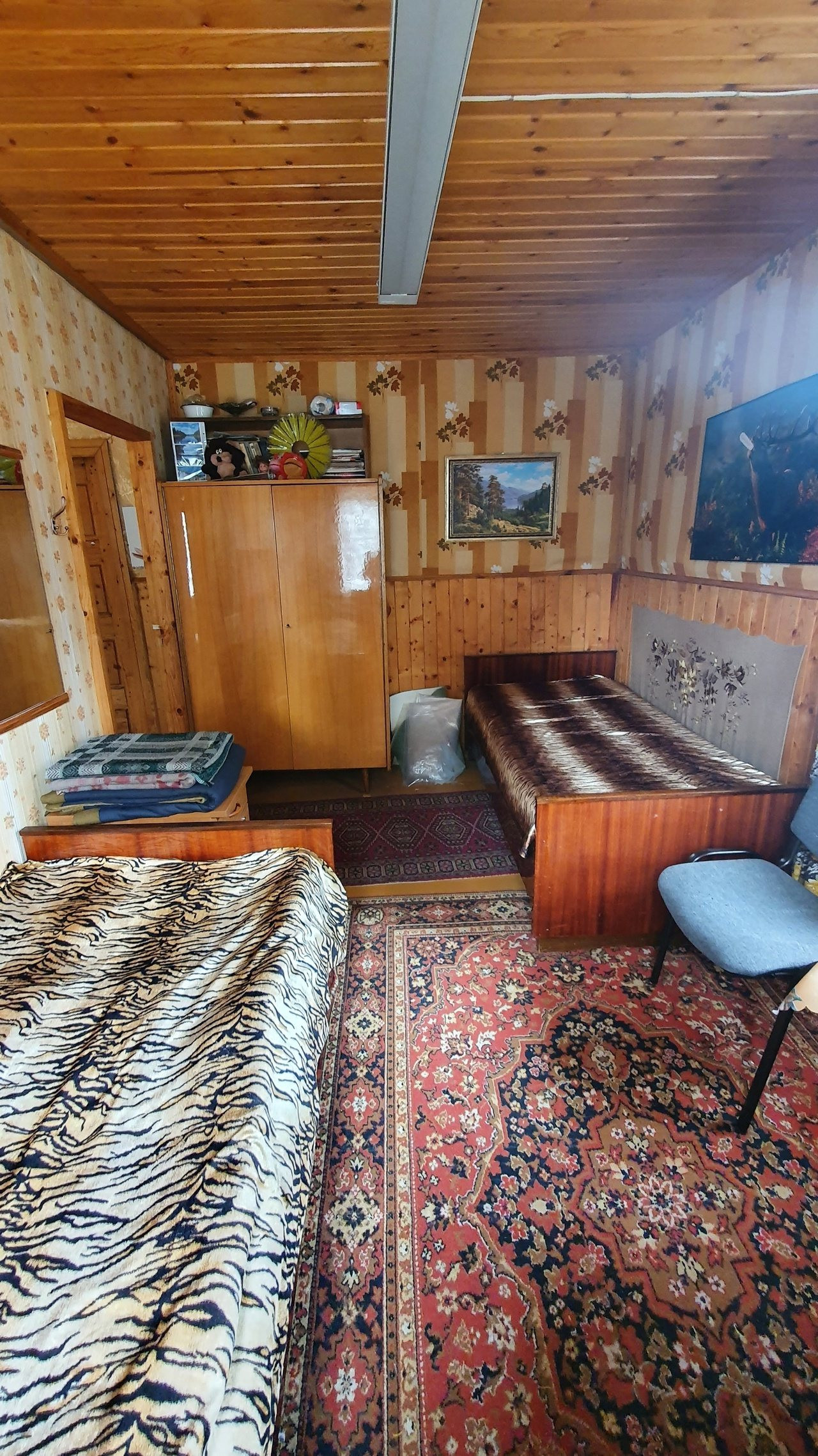 На втором этаже 1 комната: двухспальная кровать и диван, шкаф, на первом этаже кухня, 2 комнаты, в одной комнате 2 полуторные кровати, во второй - диван.
