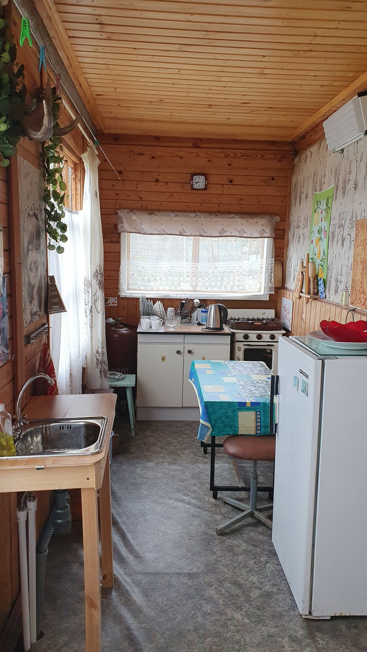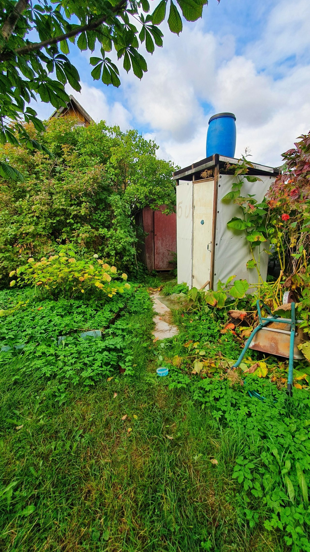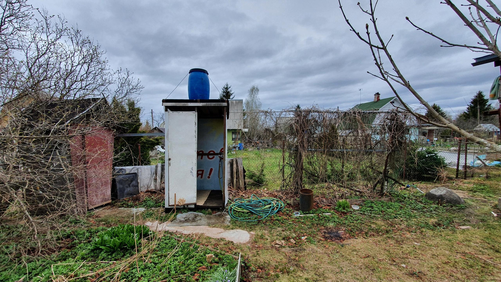 Холодная и горячая вода в душевой на улице, + бочка на крыше душевой с водой температуры воздуха.