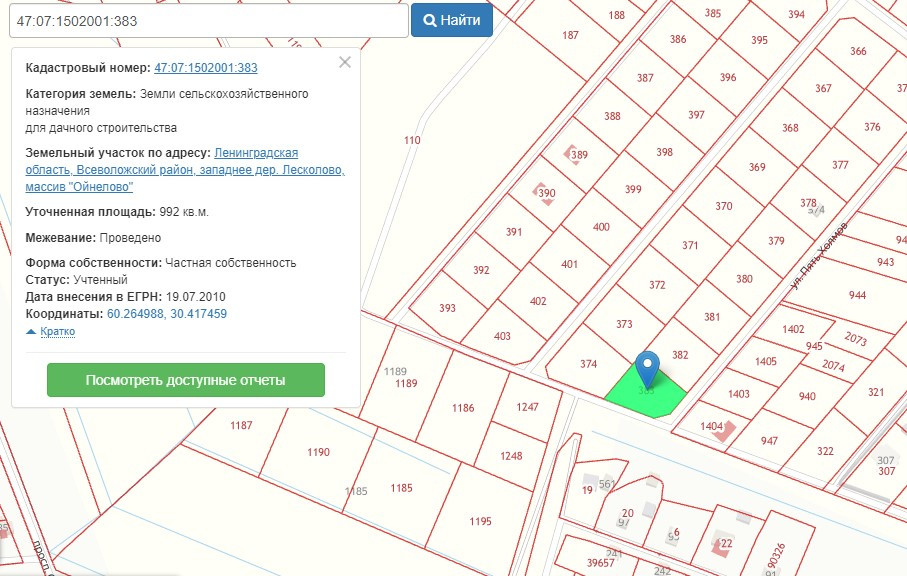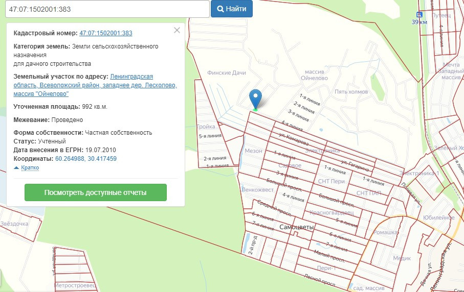 Продается участок в   дачном массиве «Ойнелово»  10 сот. Находится около массива «Пять холмов». Расположен  на холме, вокруг  лес с огромным количеством грибов и ягод. Чистейшая экология вокруг, завораживающий вид, тишина, - и все это совсем рядом от мегаполиса.  На авто 25 км до КАД, 1ч. 2 мин. на  электричке от станции «Платформа 39 км» до Финляндского вокзала.  До станции «39 км» - 1 км 300 м