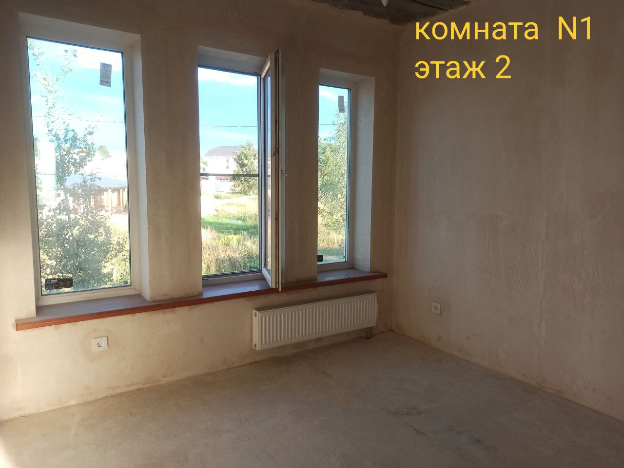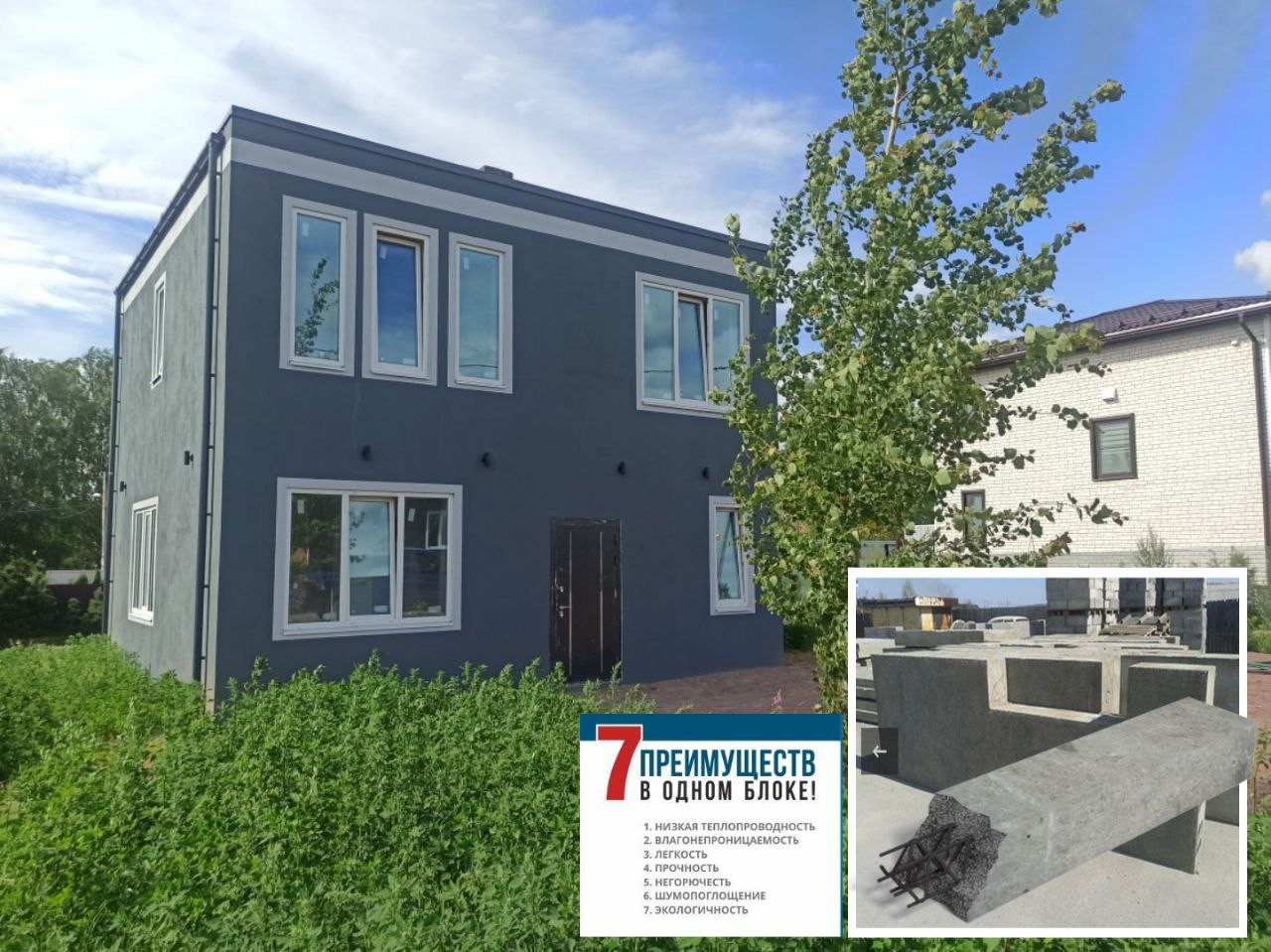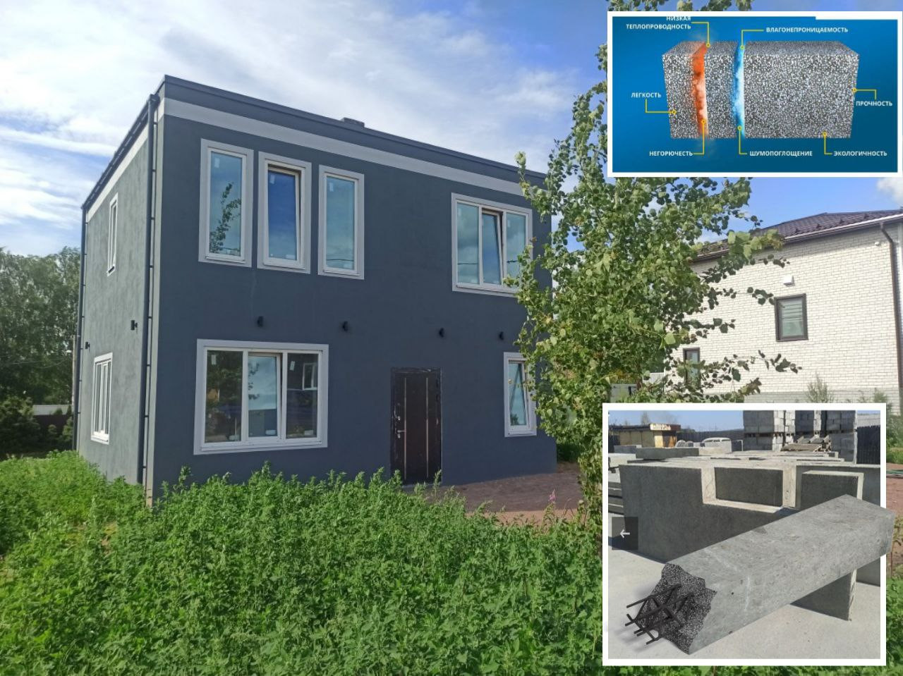 Материал стен - армированные тёплые пенополистирол бетонные панели ( внутри металлокаркас), в помещениях дома проходит вентиляционная шахта из кирпича (никакого гипсокартона), лестница - заливной монолит (никакого дерева), крыша гидроизолирована и готова к эксплуатации, отопление - радиаторы, окна выполнены из высококачественного материала с функцией энергосбережения, перекрытия - бетонные плиты перекрытия (не дерево!), толщиной 30 см, толщина внешних стен 30 см. Фундамент - монолитная плита 25 см. На участке установлен септик вместимостью 2 куба, и скважина.