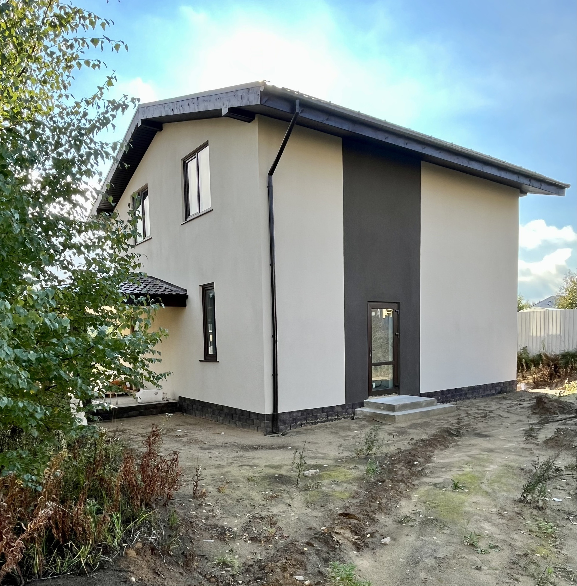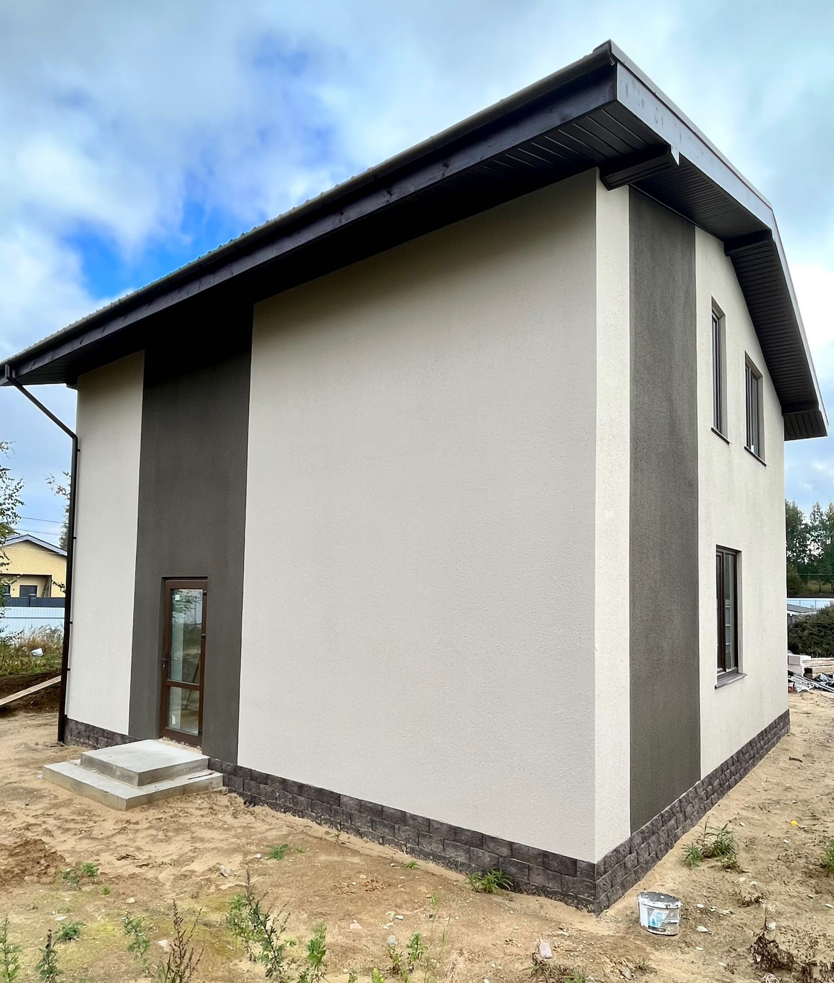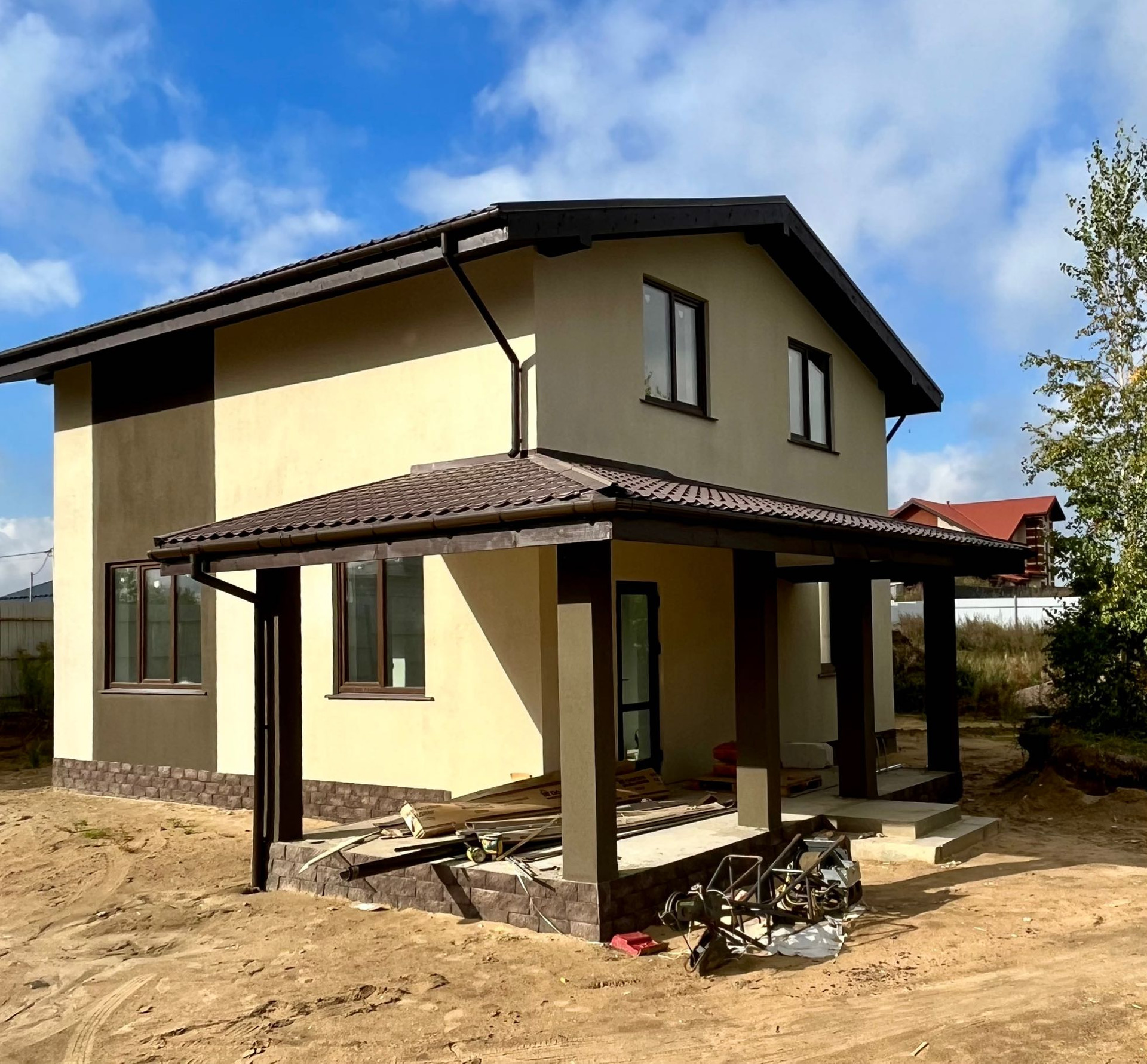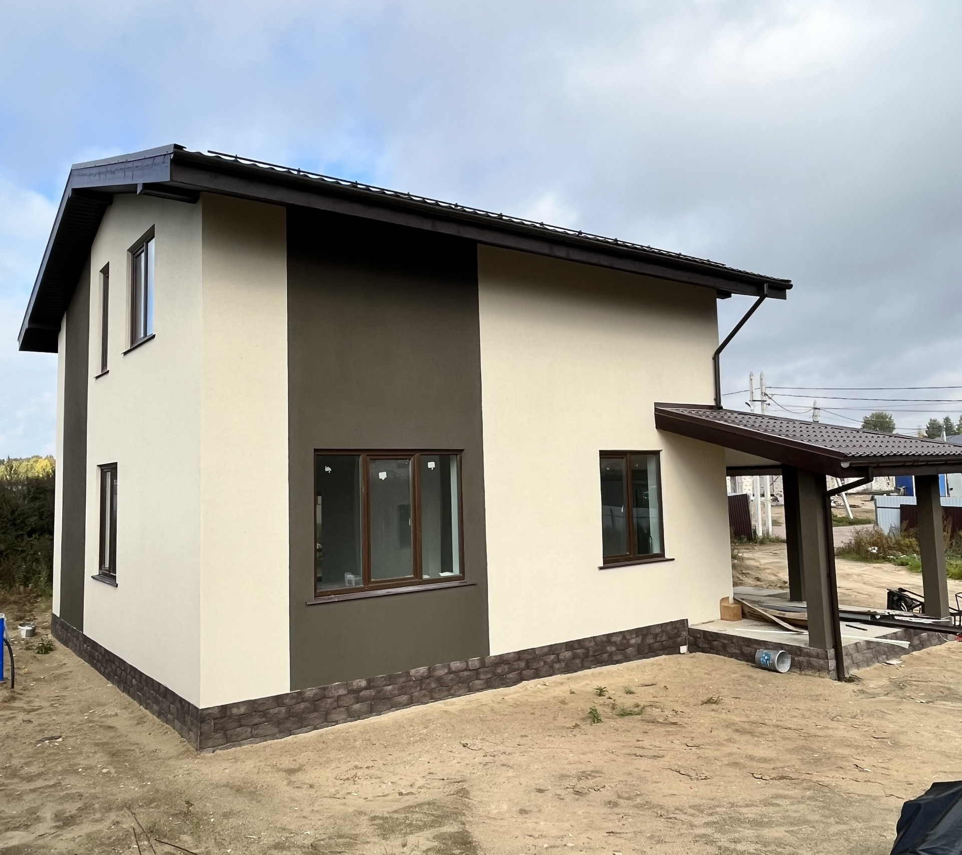 Дом возведен на монолитной железо-бетонной плите с отсыпкой песком и щебнем. Стены выложены из газоблоков, с последующим утеплением, армированием и штукатуркой. Крыша- металлочерепица.