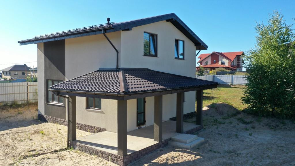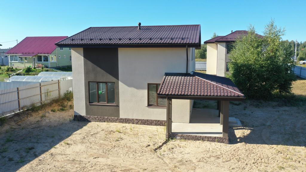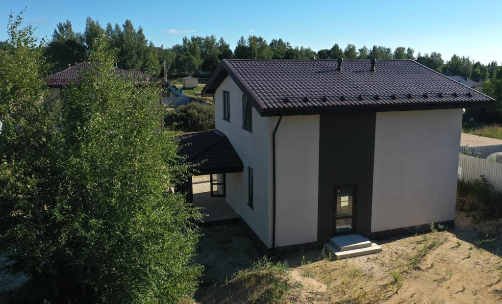 Дом возведен на монолитной железо-бетонной плите на ленточном фундаменте с отсыпкой песком и щебнем. Стены выложены из газоблоков, с последующим утеплением, армированием и штукатуркой. Крыша- металлочерепица.