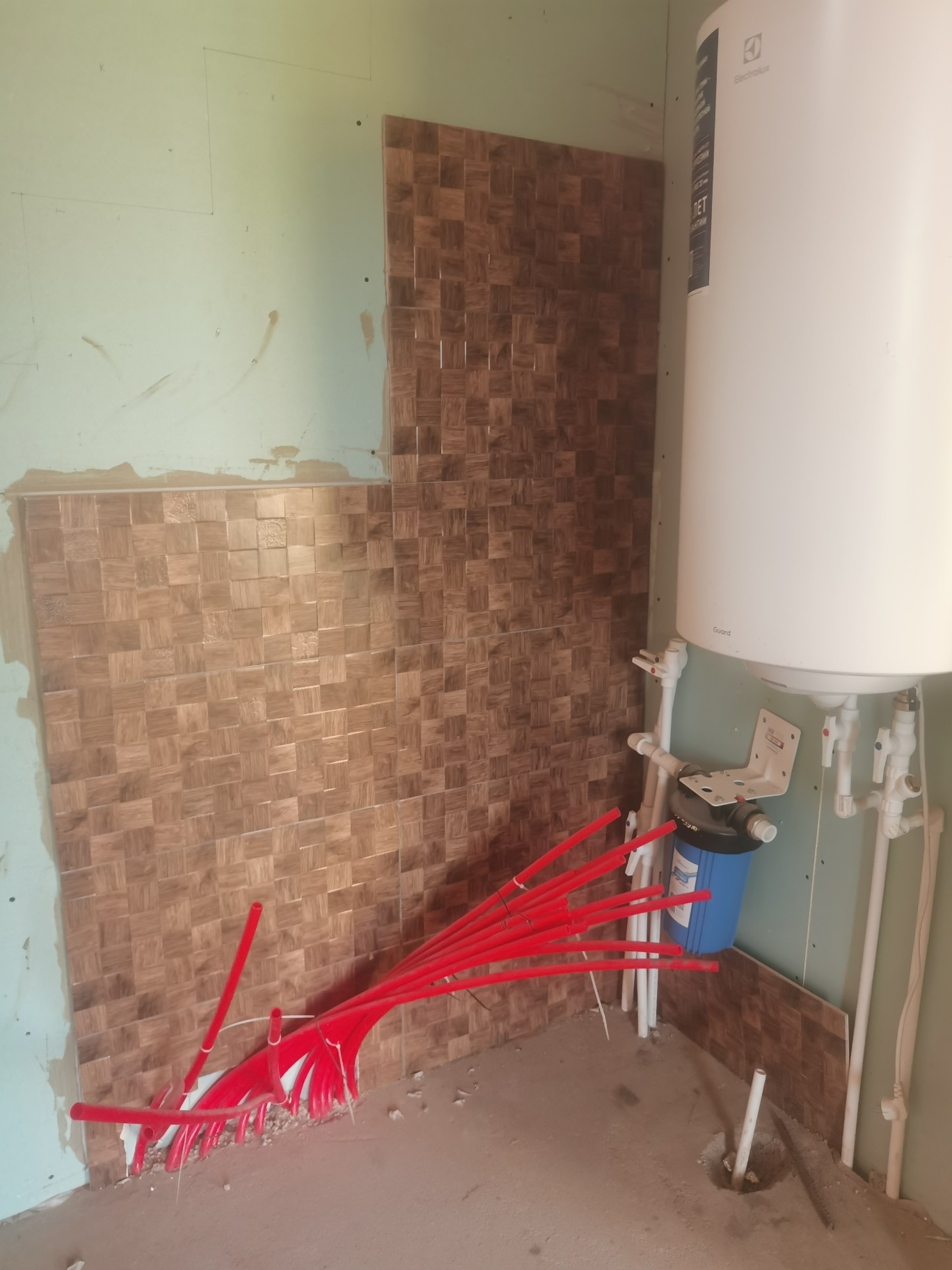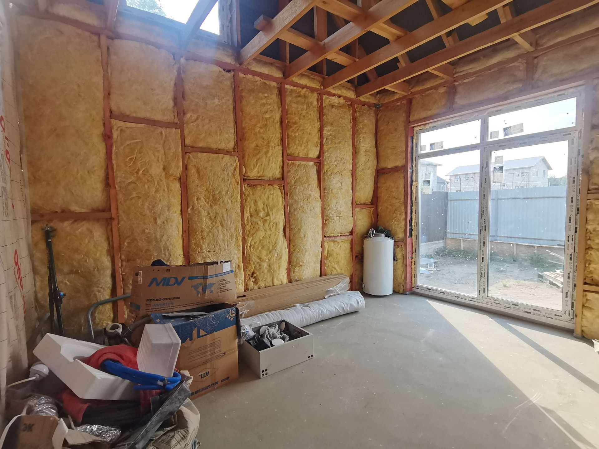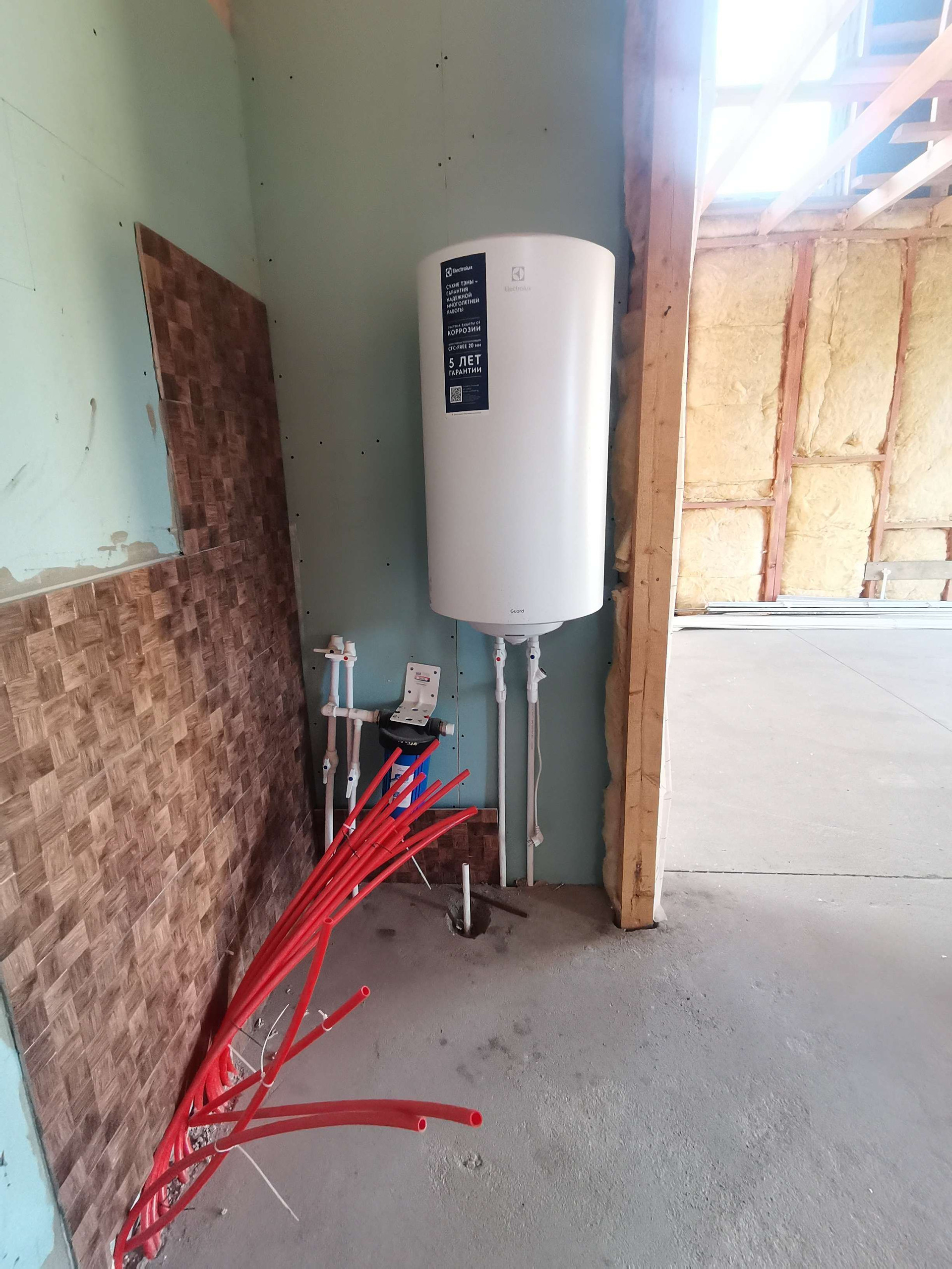 Полностью сделана сантехника - теплый пол, участок огорожен, подключено электричество.