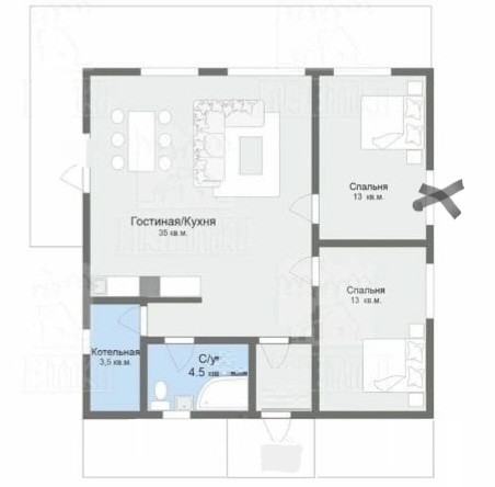 Планировка: терраса Г- образная с фасада и с правой стороны дома, терраса со стороны входа на заднем дворе, прихожая-тамбур, сан. узел, просторная кухня-гостиная, две спальни.