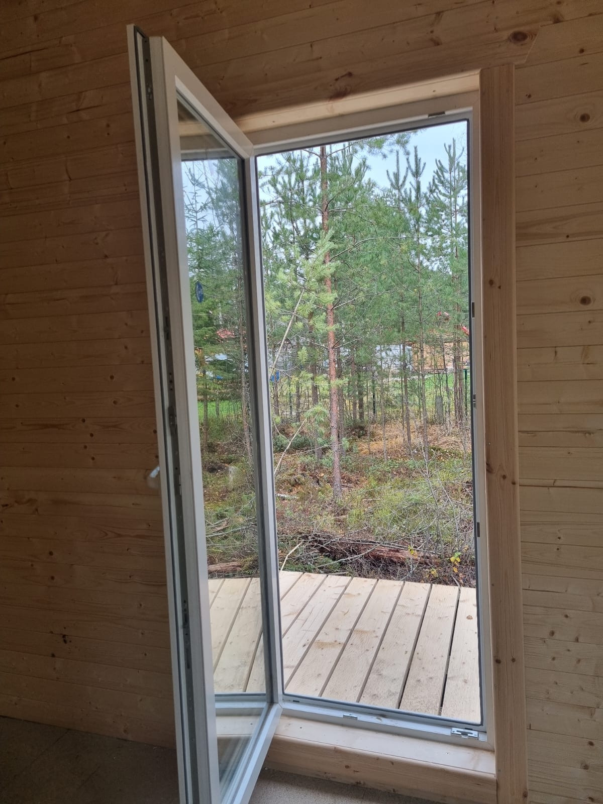 Прямо с фасада террасы с панорамных окон открывается вид на сосновый лес.