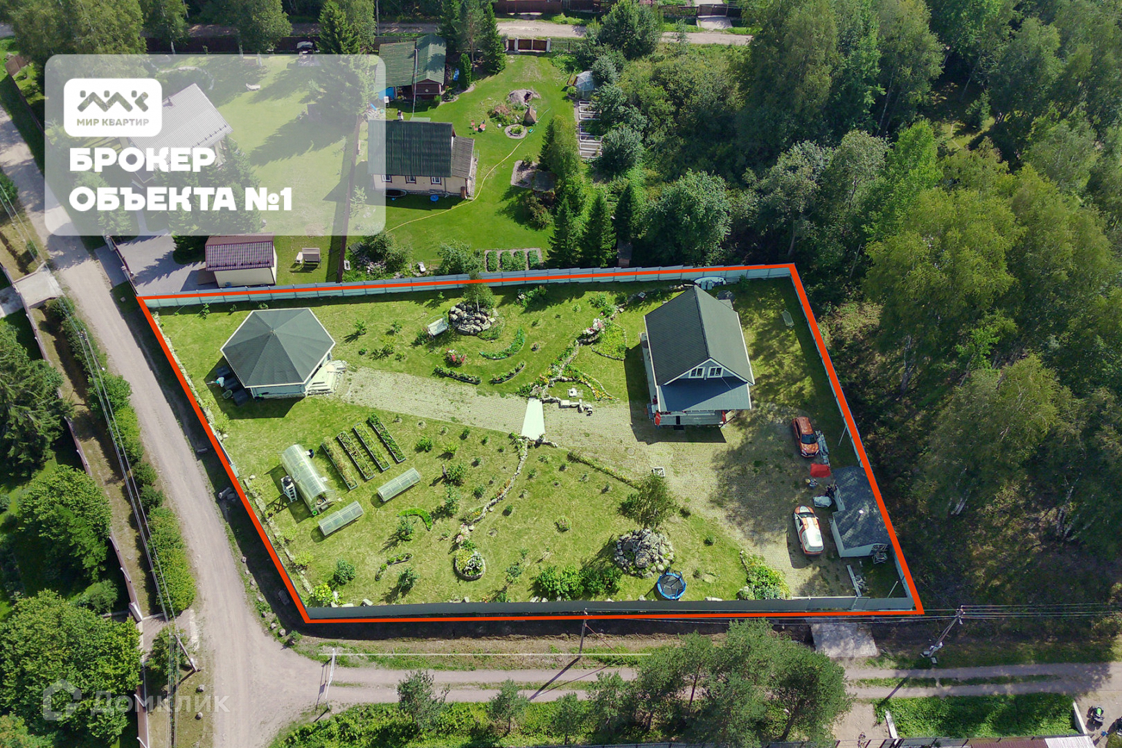 Участок огорожен качественным забором с двумя въездами с откатными воротами.