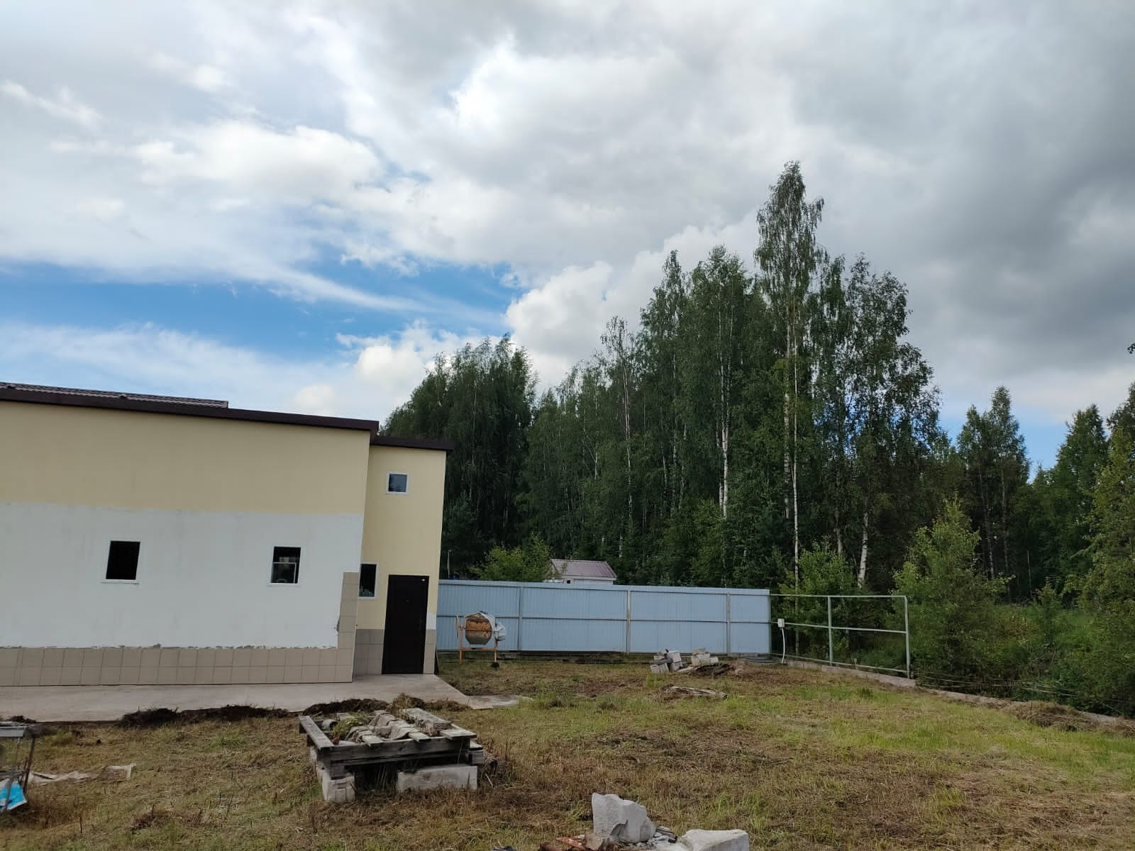 По периметру участка залита бетонная лента под забор, смонтировано 60% металлического каркаса забора, есть материал на монтаж оставшейся части.