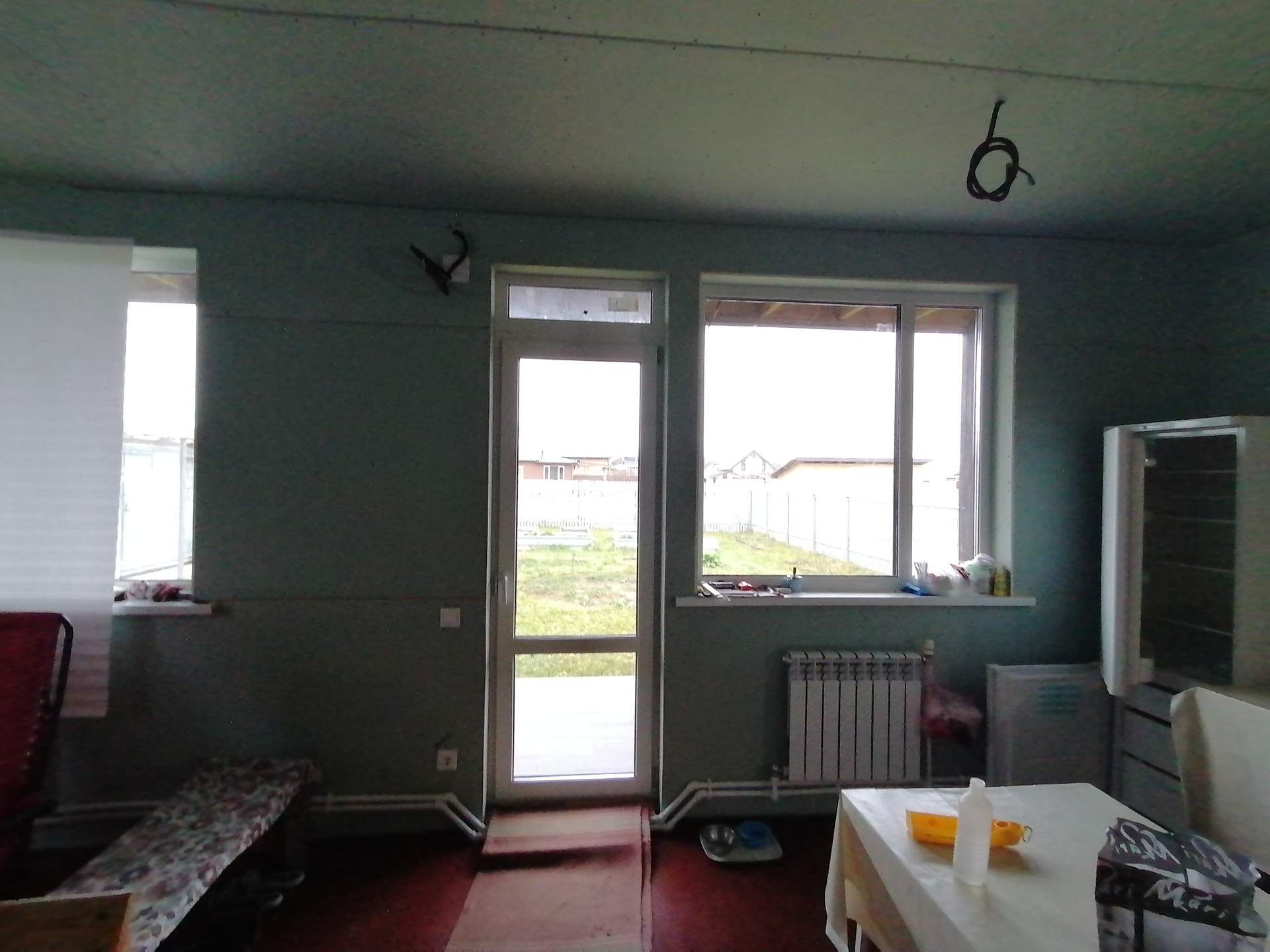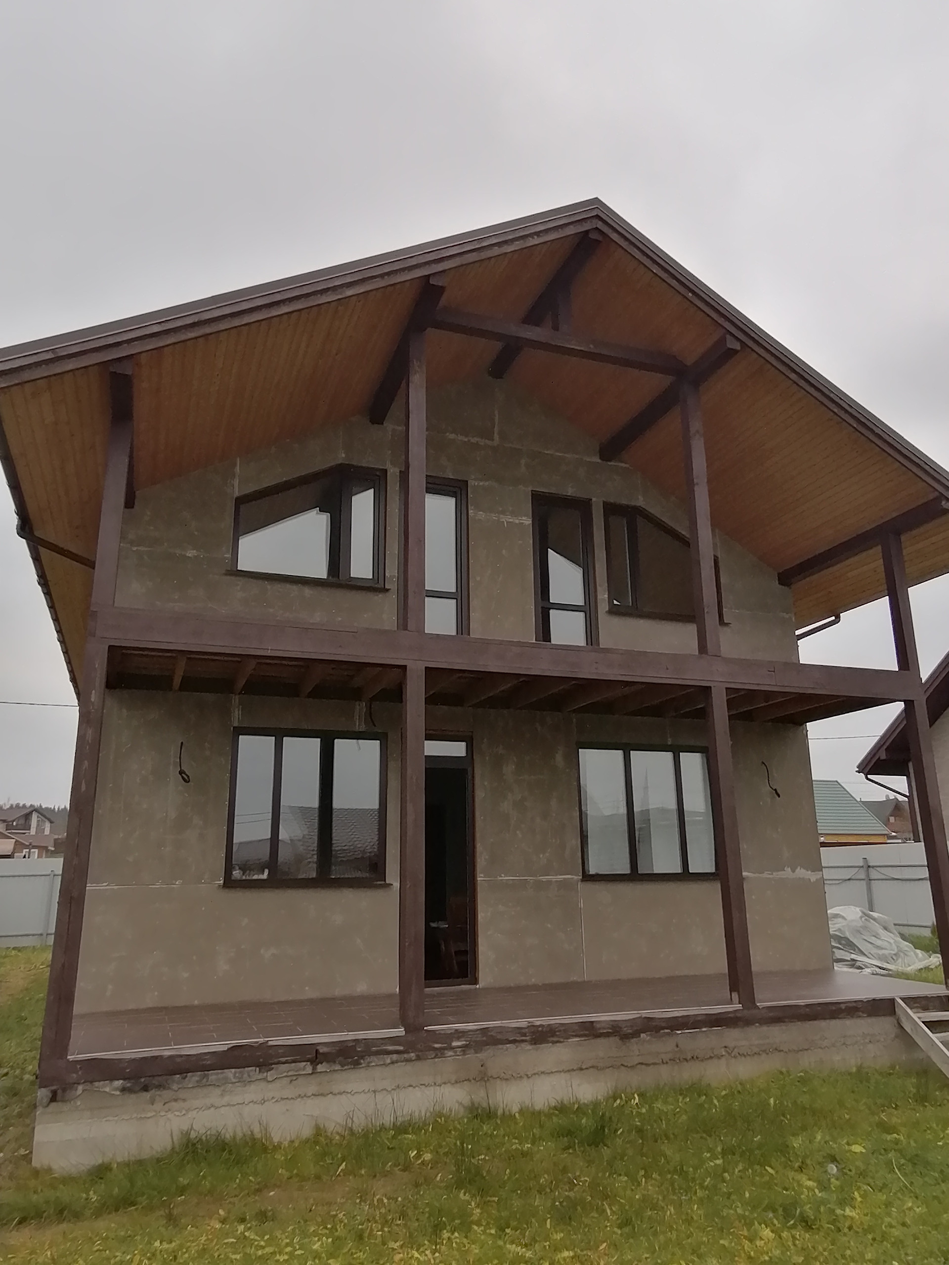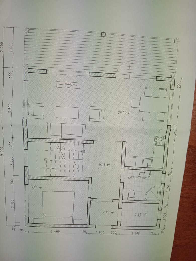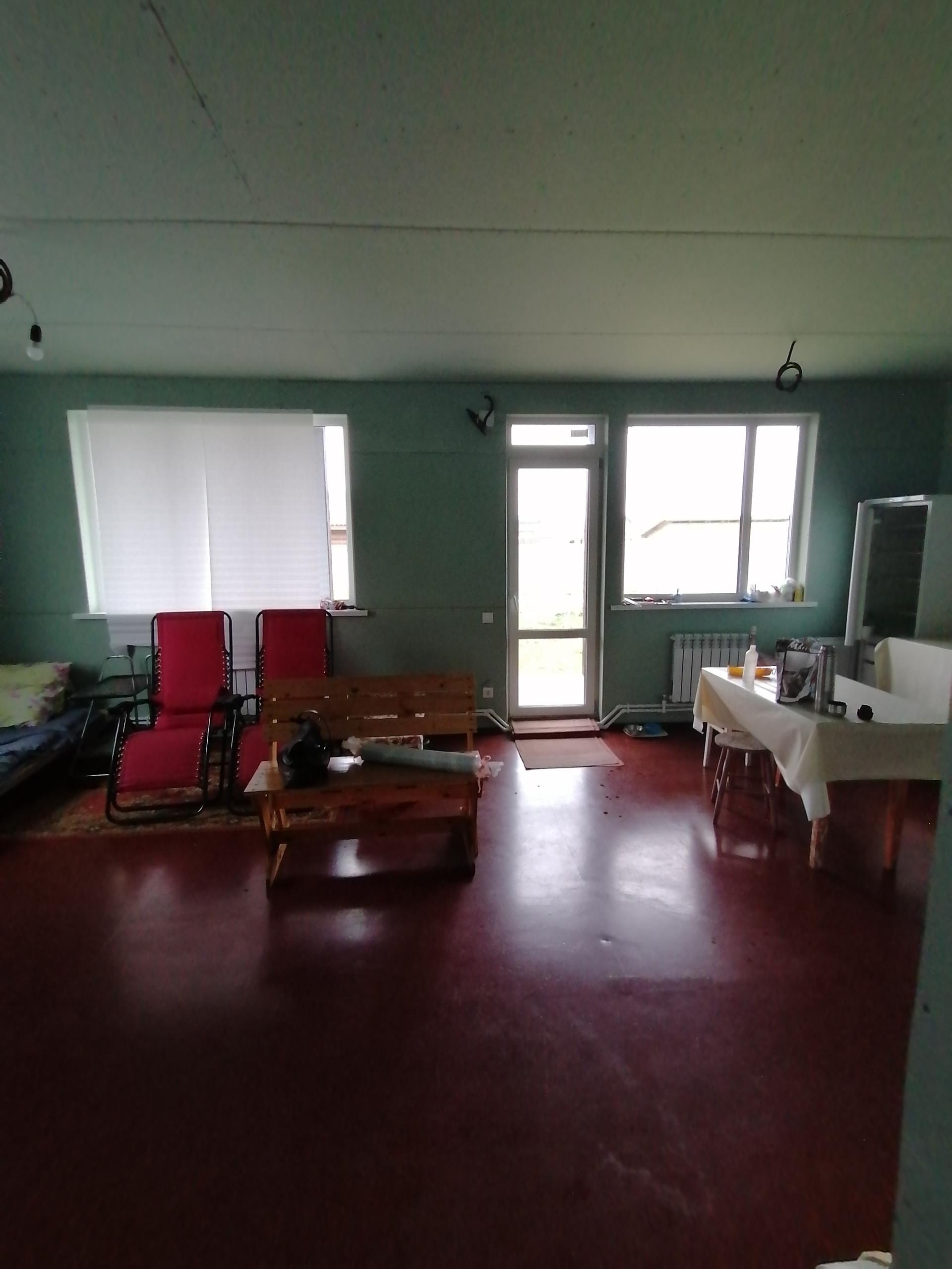 на 1 этаже -большая кухня-гостиная 30м., комната 9.2м., сан узел 6м., хоз помещение, котельная, большая веранда.