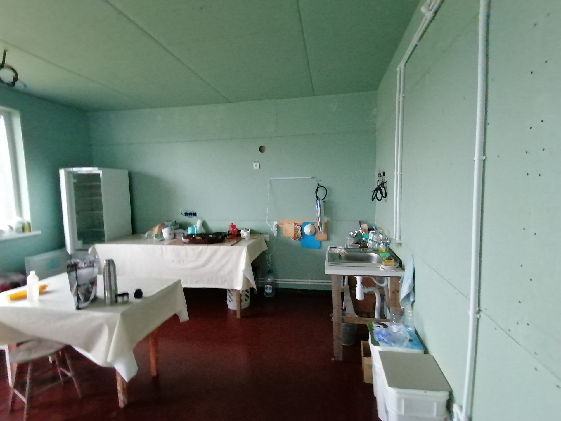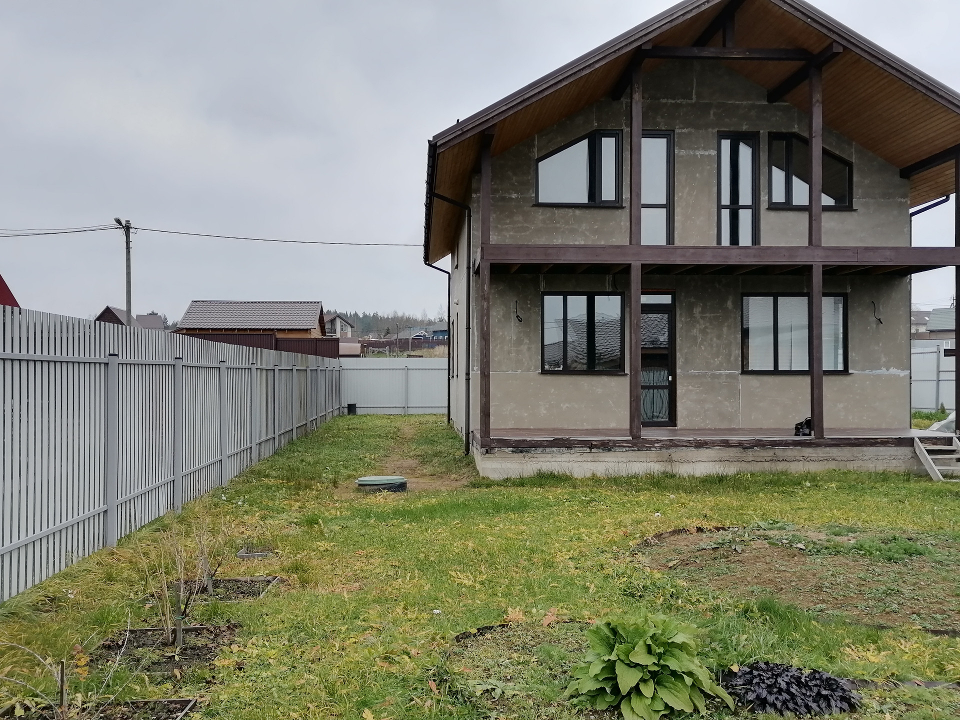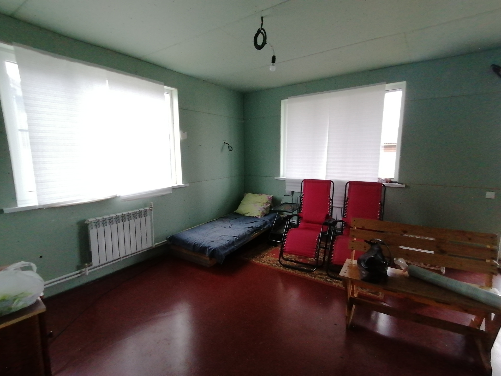 на 1 этаже -большая кухня-гостиная 30м., комната 9.2м., сан узел 6м., хоз помещение, котельная, большая веранда.