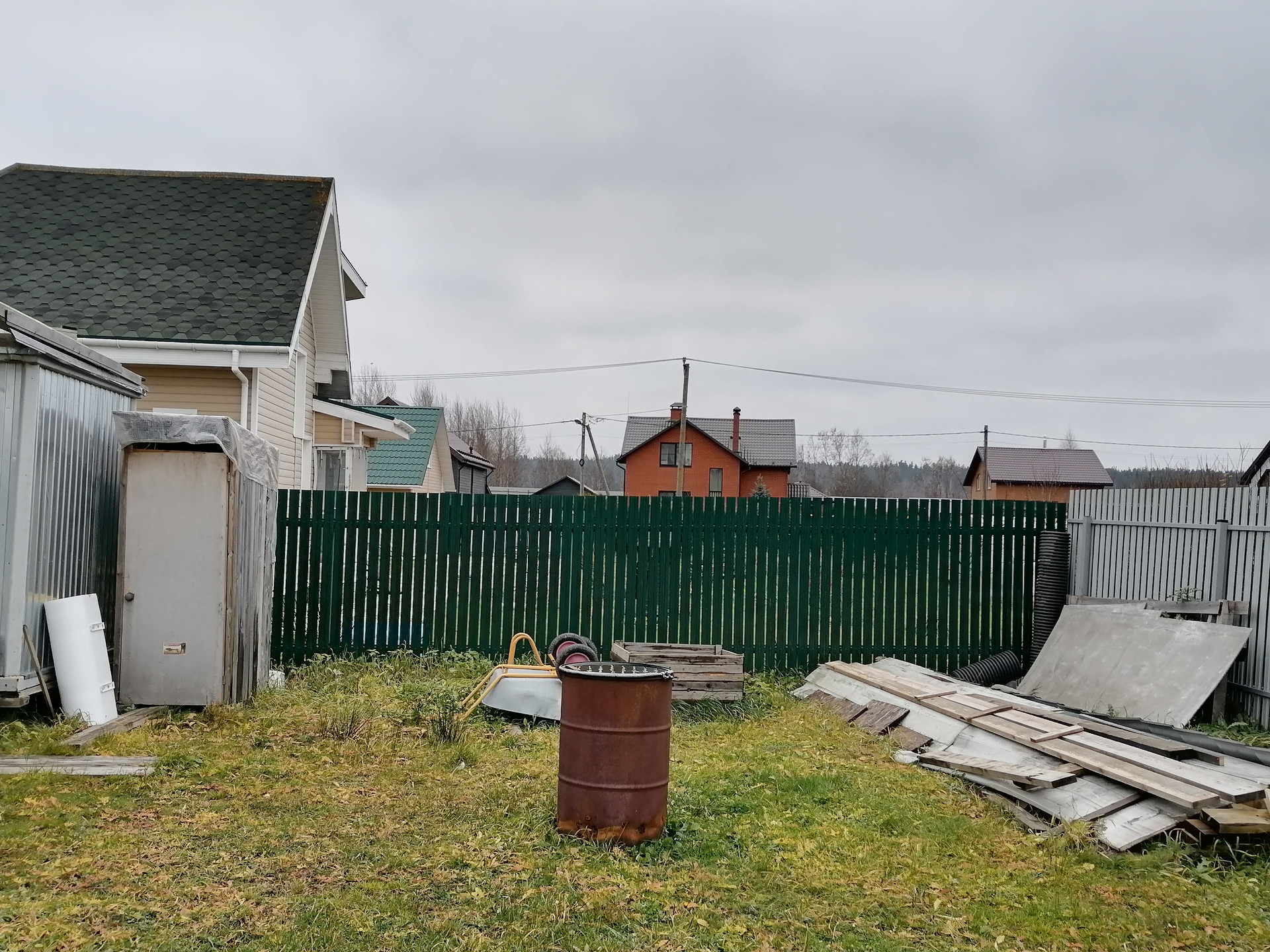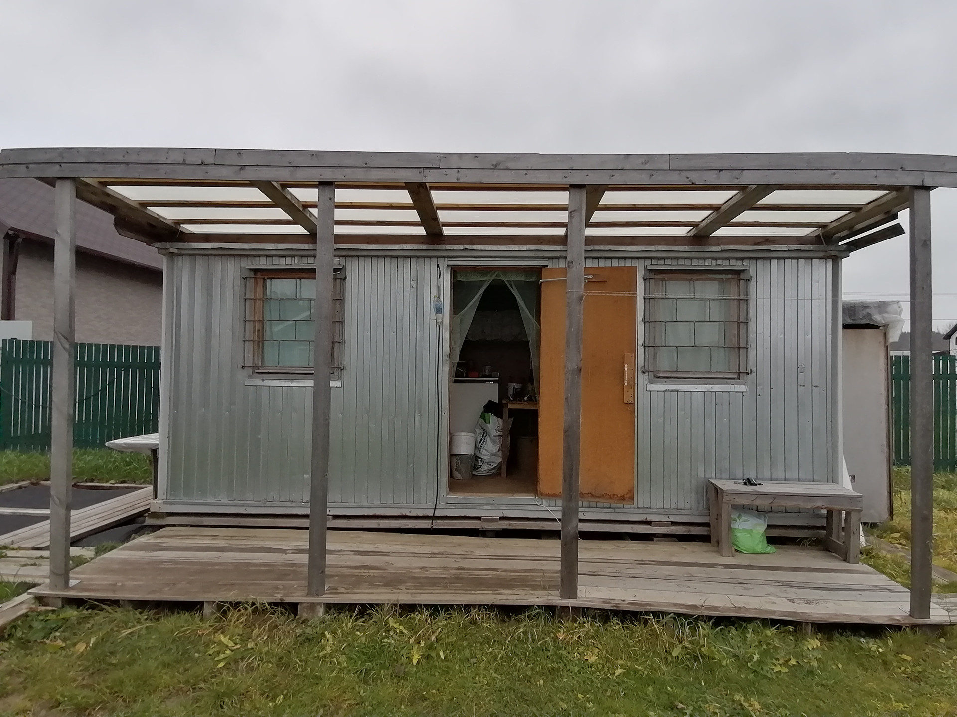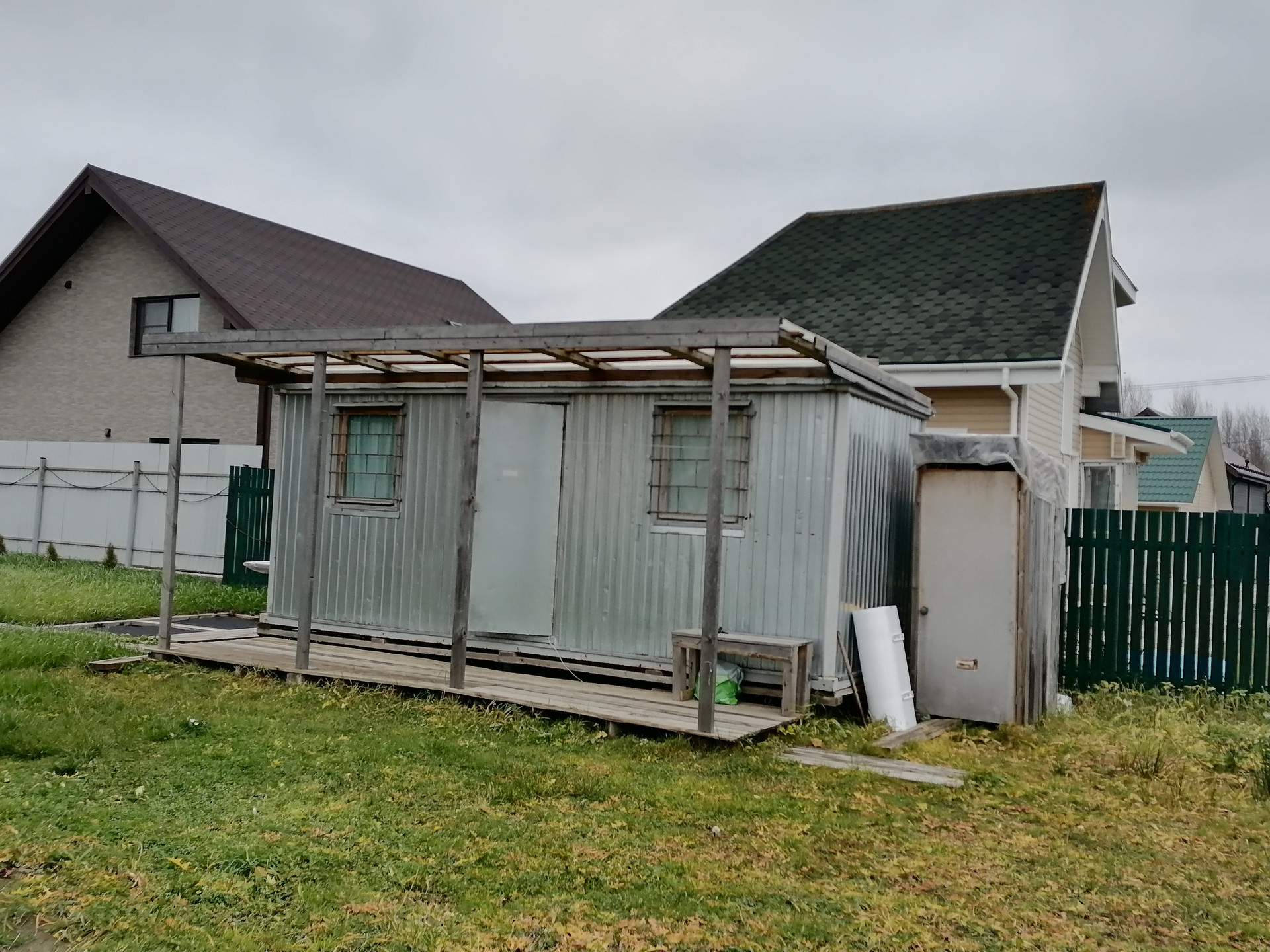Забор металлоштакетник + откатные ворота. На участке стоит вагончик (две комнаты, кухня)!