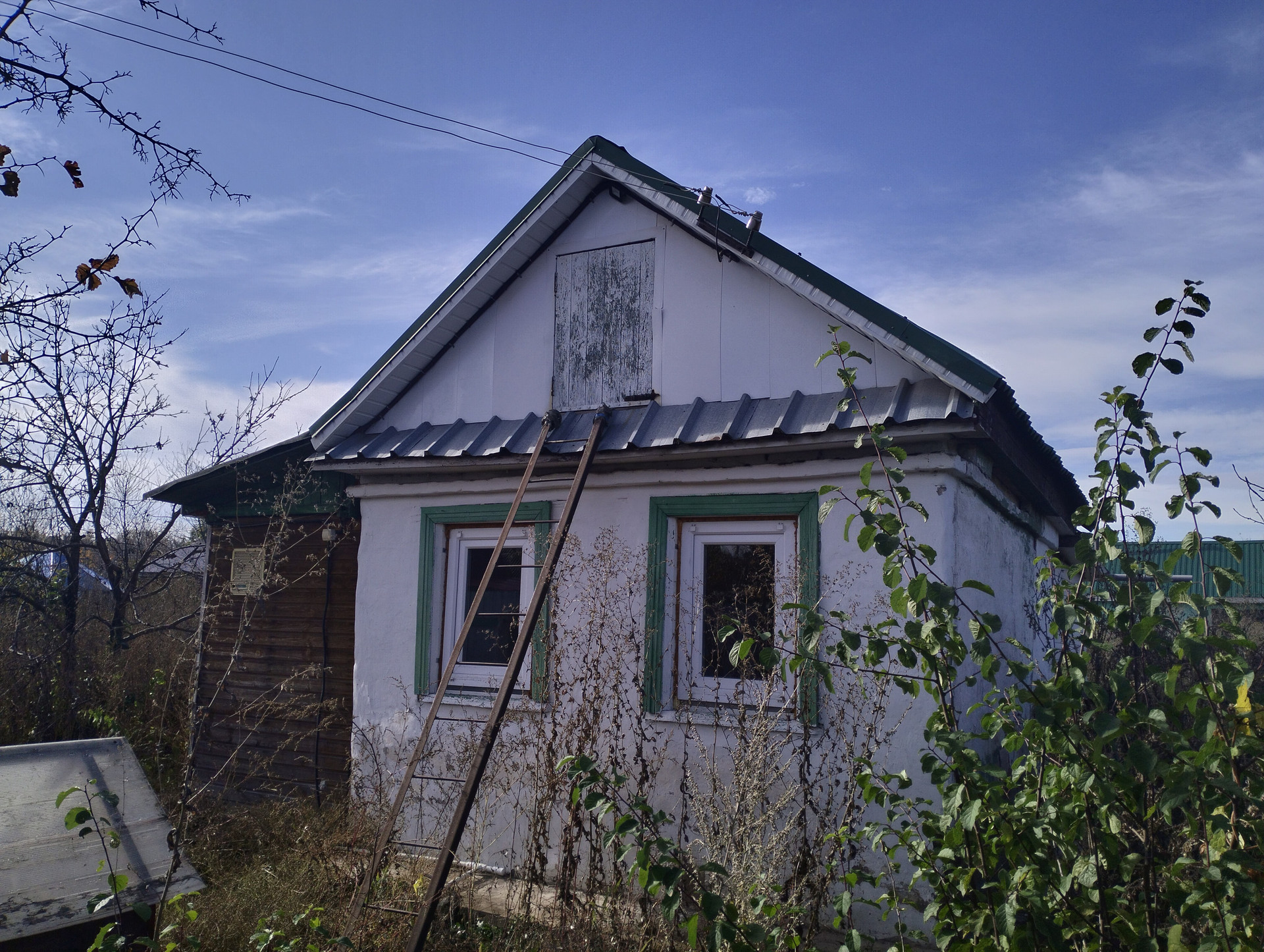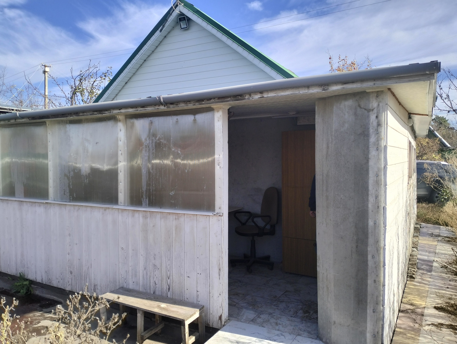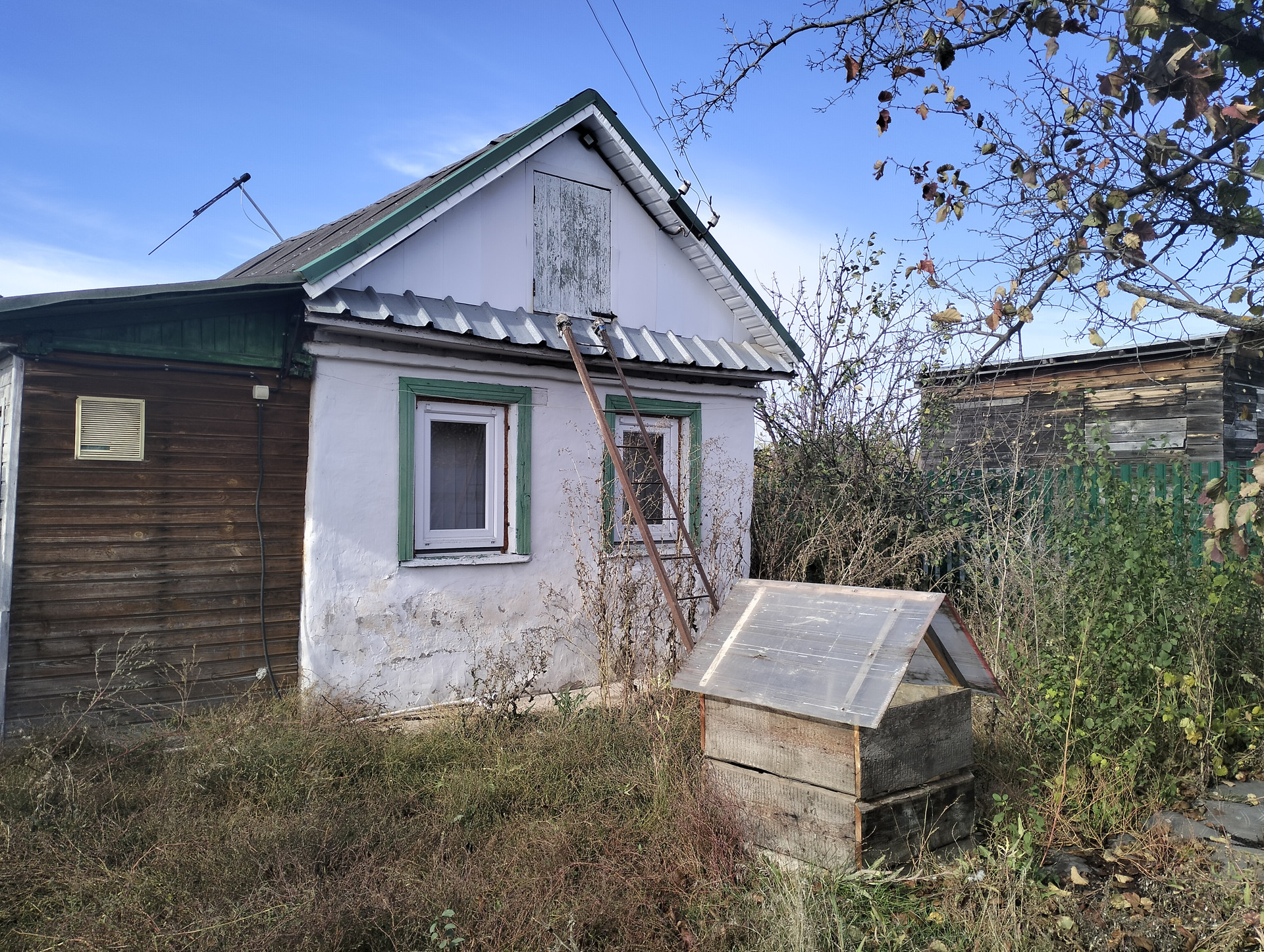 - жилой дом 35м2 (кирпичный) - жилая комната с террасой и верандой, В доме есть вода (из скважины), канализация (есть сливная яма), электричество.