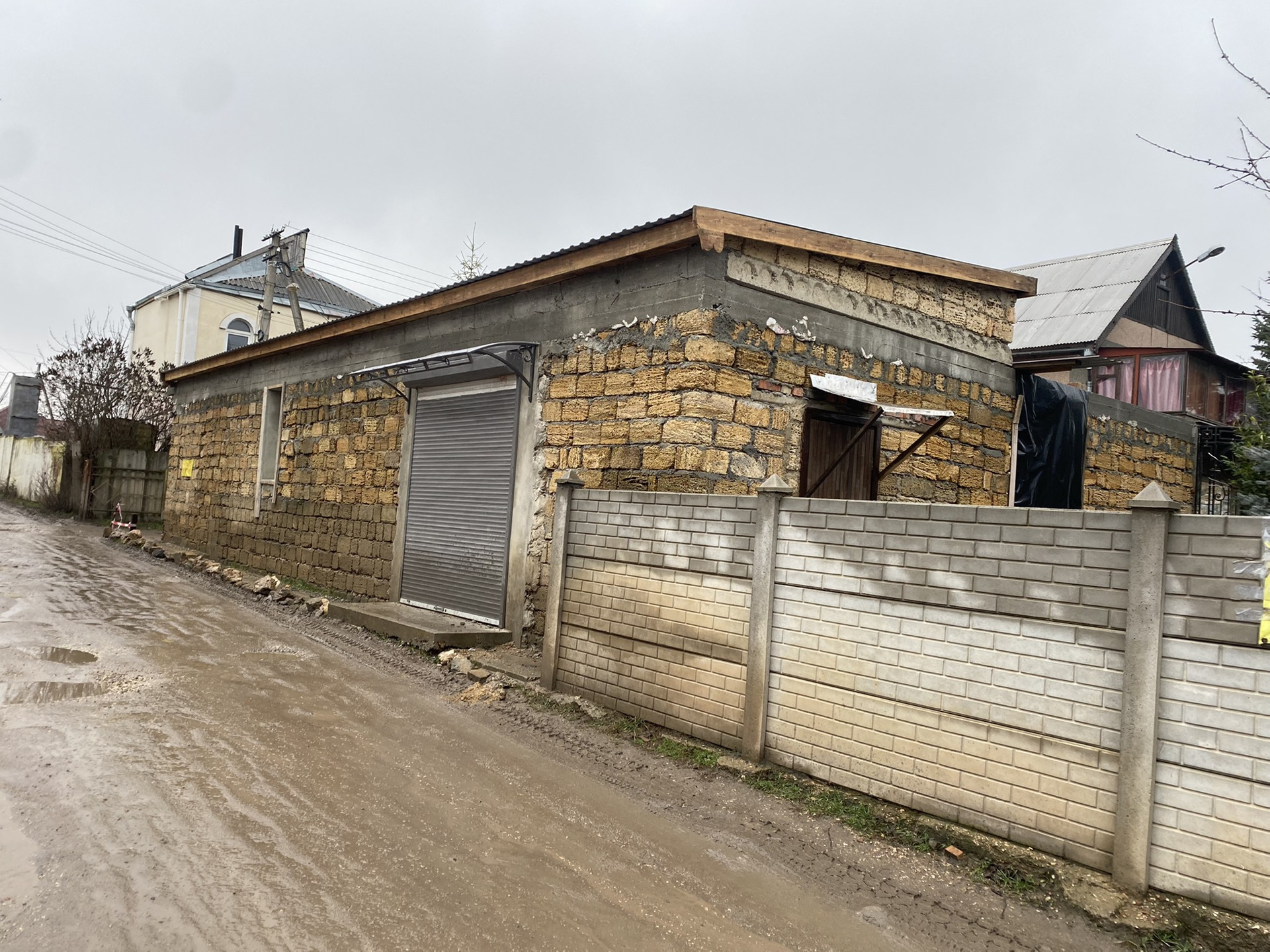 Капитальное строение в полный камень ракушка , фундамент и армапояс расчитан на два этажа (при желании) . Частично сделана крыша . Частично установлены окна и двери . Выведена вентиляция из подвала. Залита отмостка .