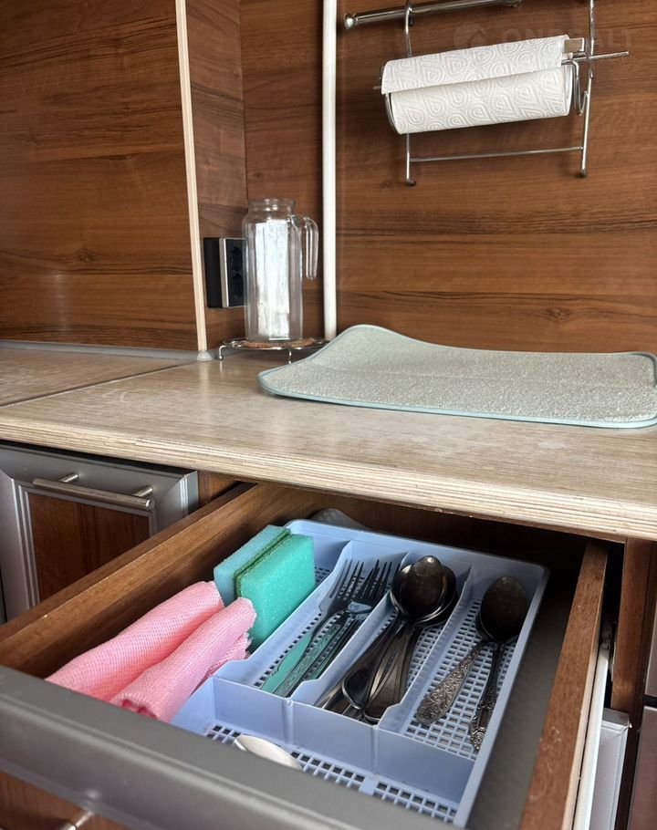 Кухонная зона имеет всю необходимую посуду и бытовую технику