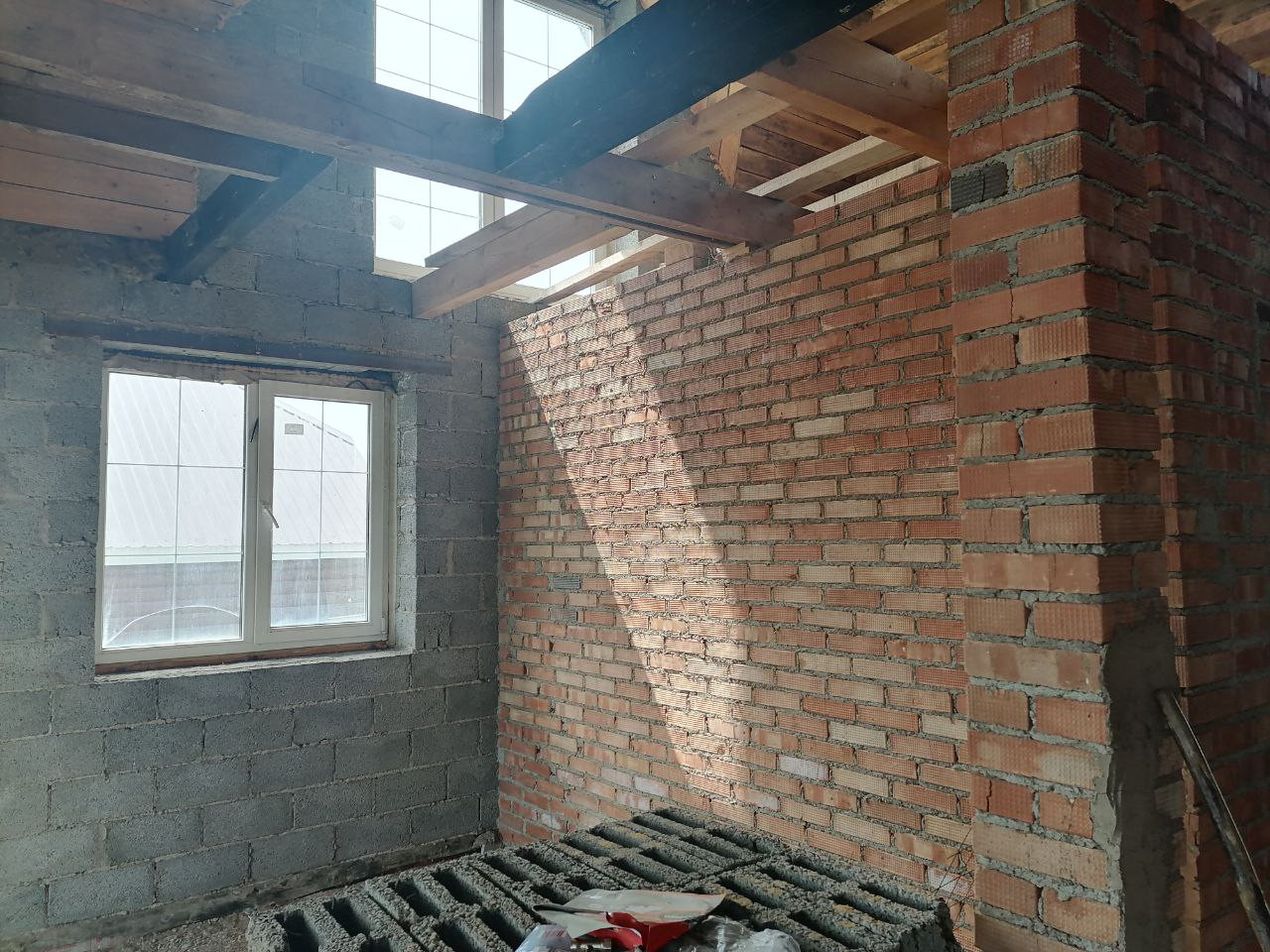 Дом построен из газоблоков, внутренние перегородки кирпич, основательный фундамент  ленточный ,  сваи на глубине  6 метров.