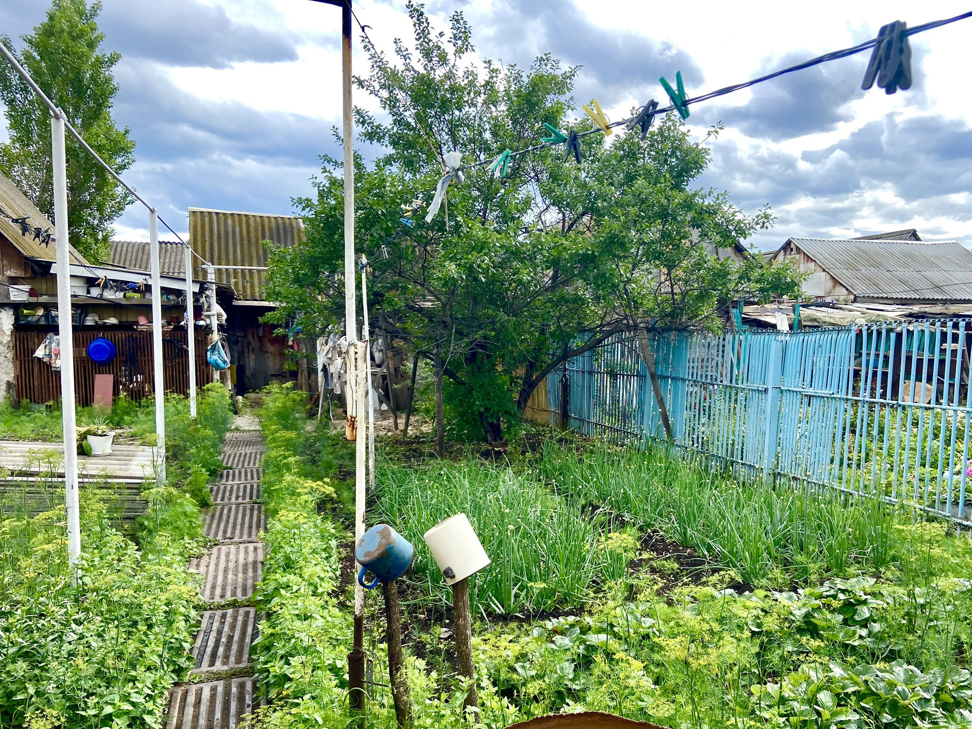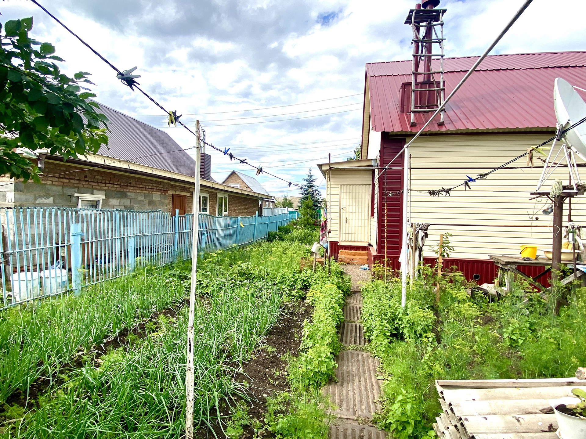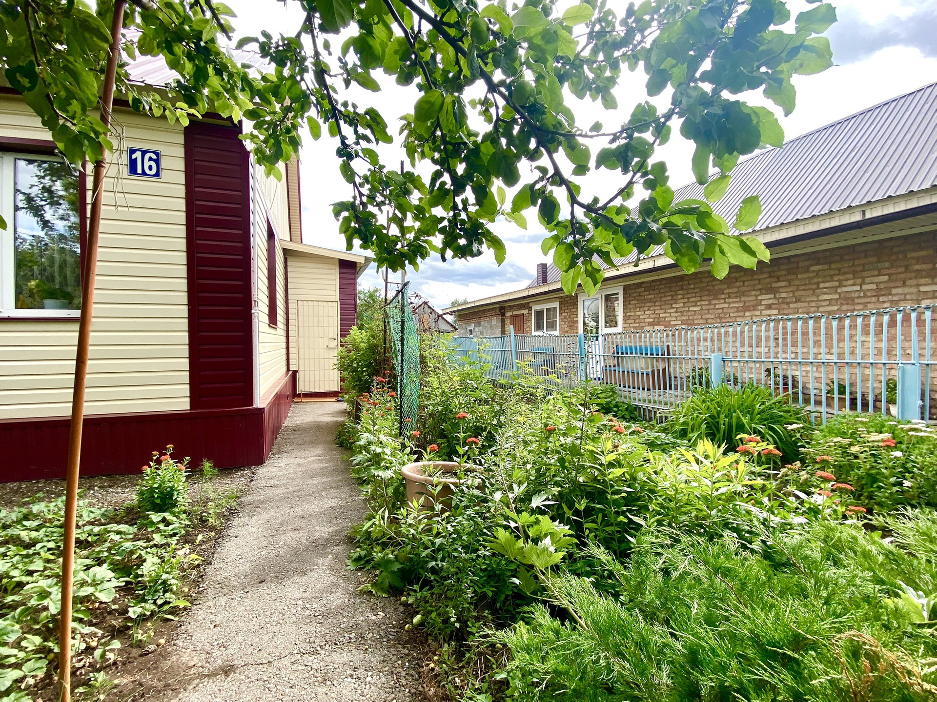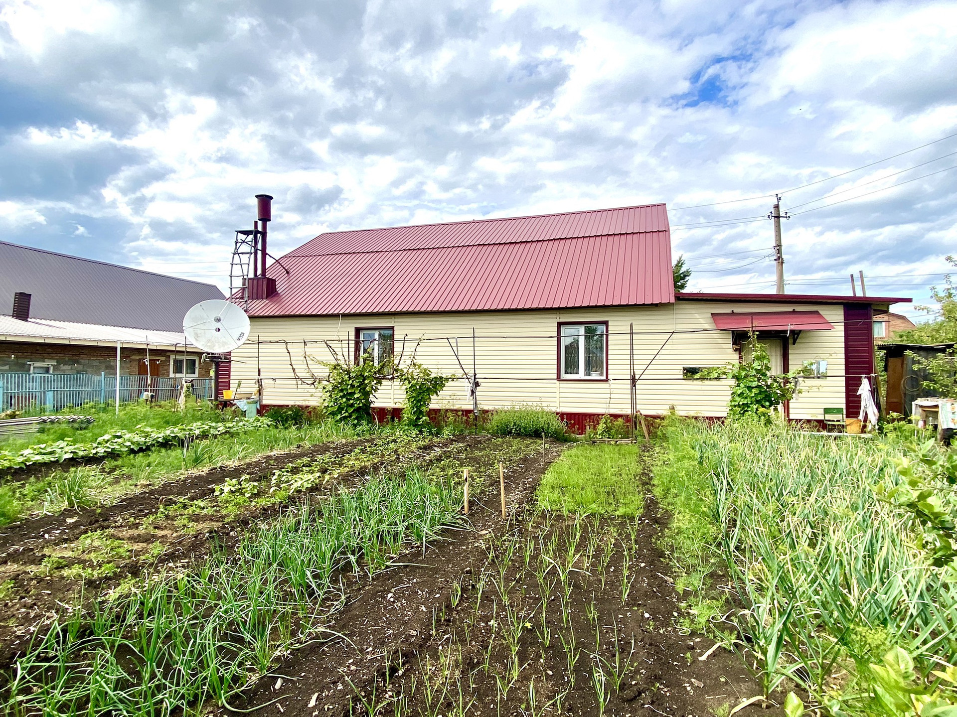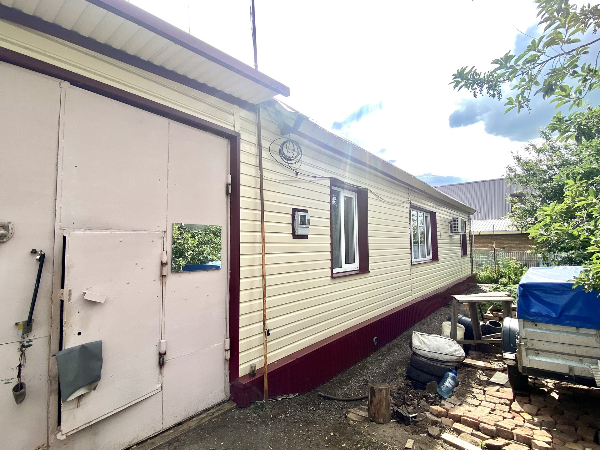 Дом построен в 2000 году и арбалитовых панелей, утеплен минватой и обшит железным сайдингом. Дом очень теплый зимой, летом нежарко. К дому пристроен гараж и также есть летняя кухня. На участке также построена хорошая бревенчатая баня и сарай.
