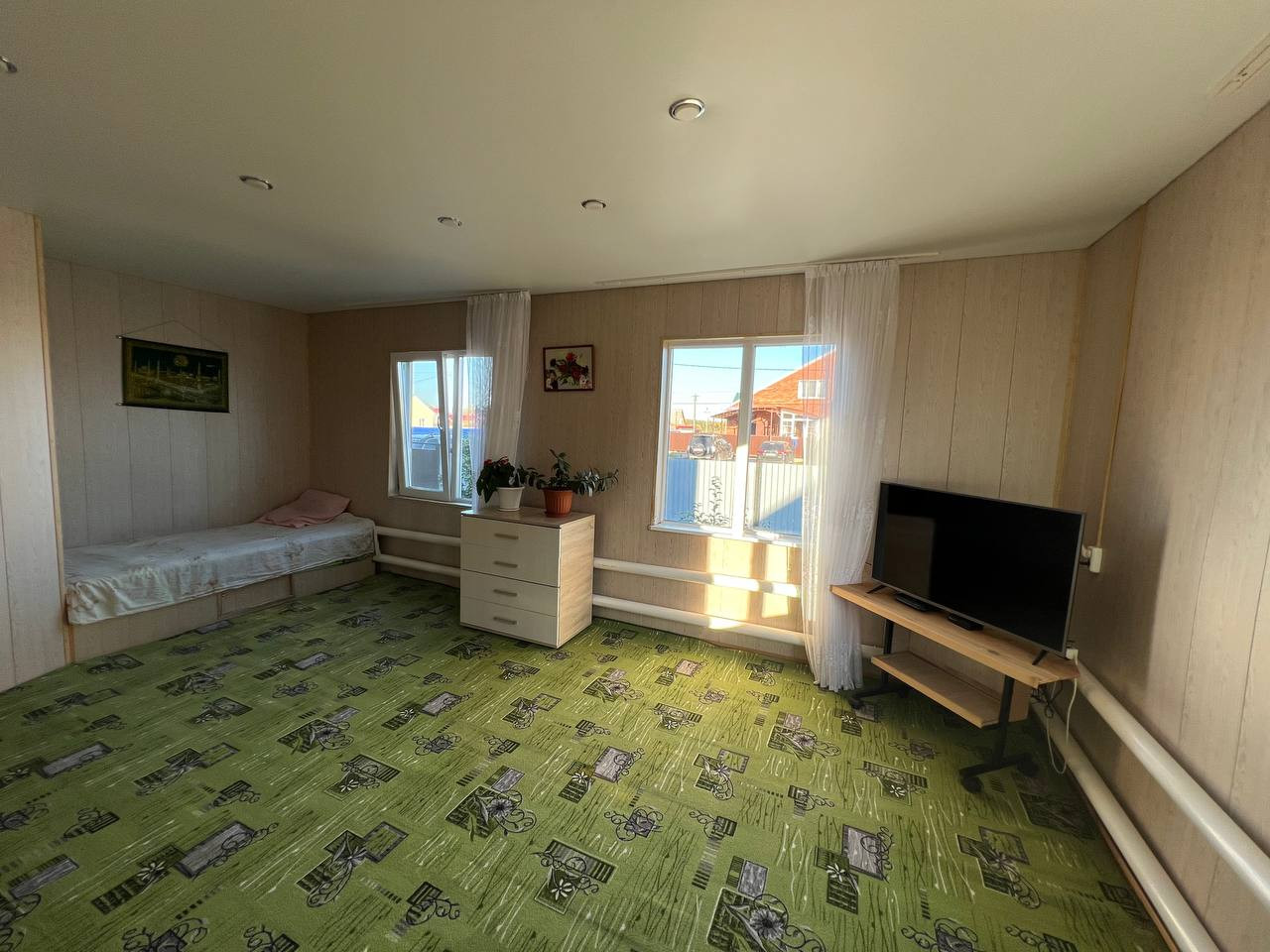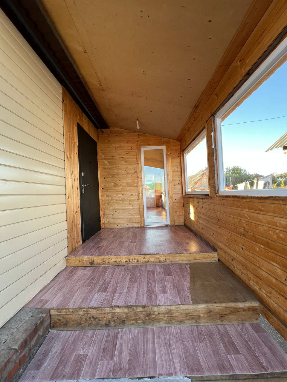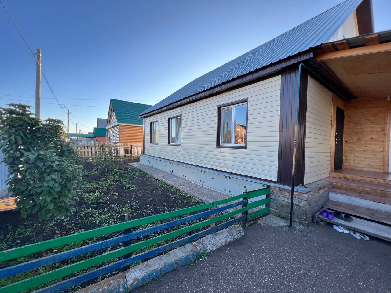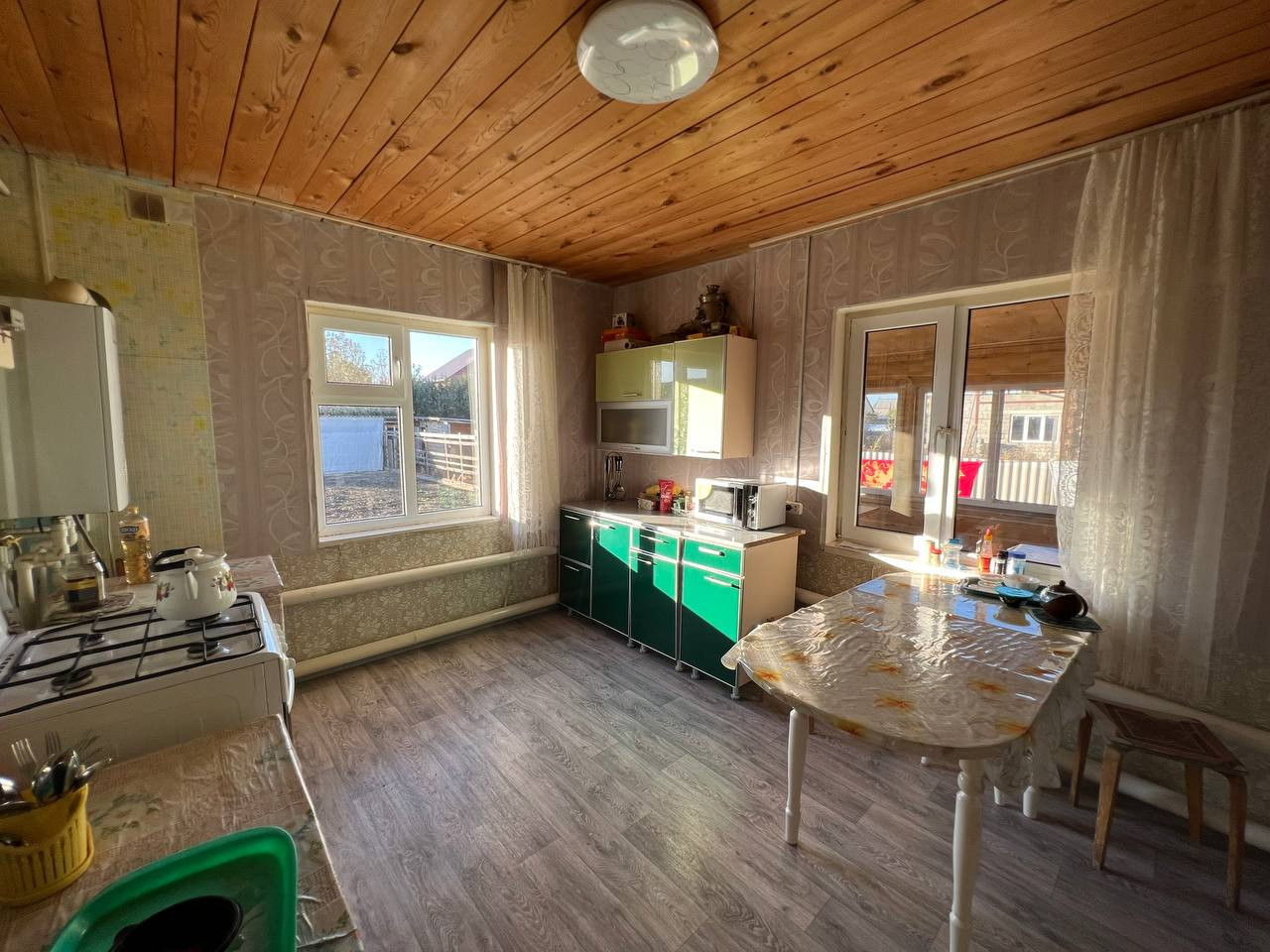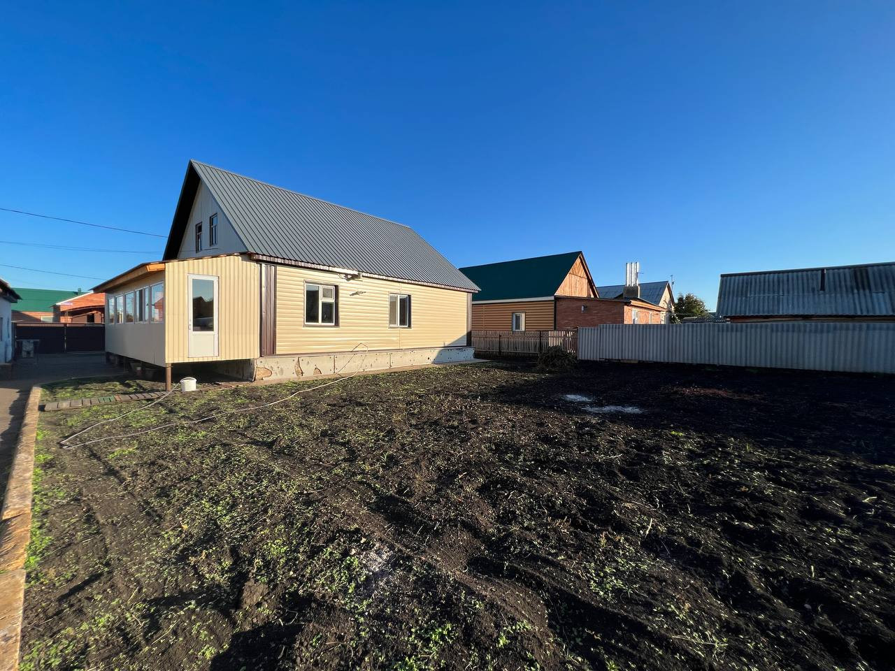 - Дом построен из бруса, установлены окна ПВХ. Имеются надворные постройки: баня, гараж, сарай.
