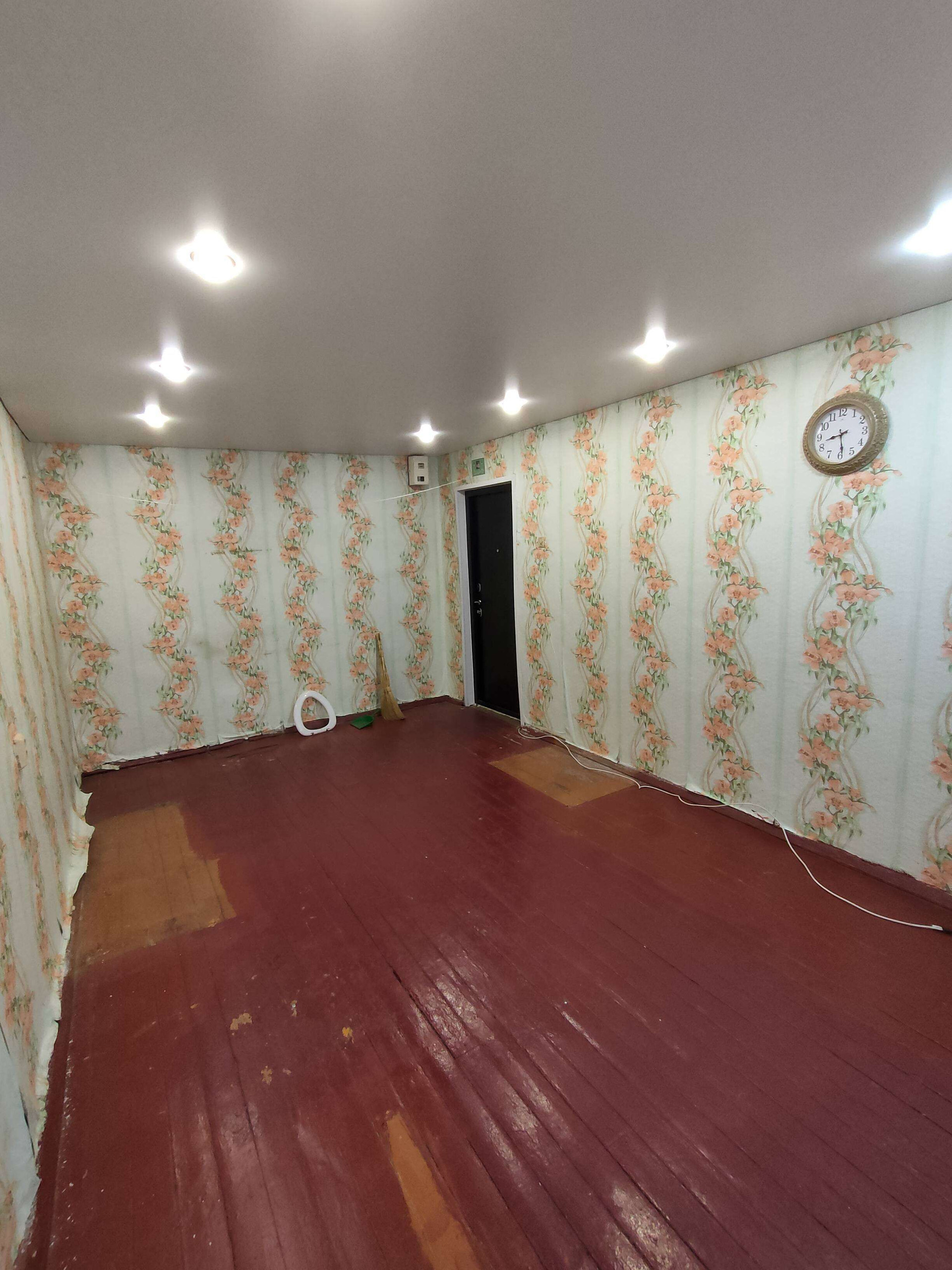 В комнате сделать косметический ремонт:потолки натяжные,окна пластиковые .