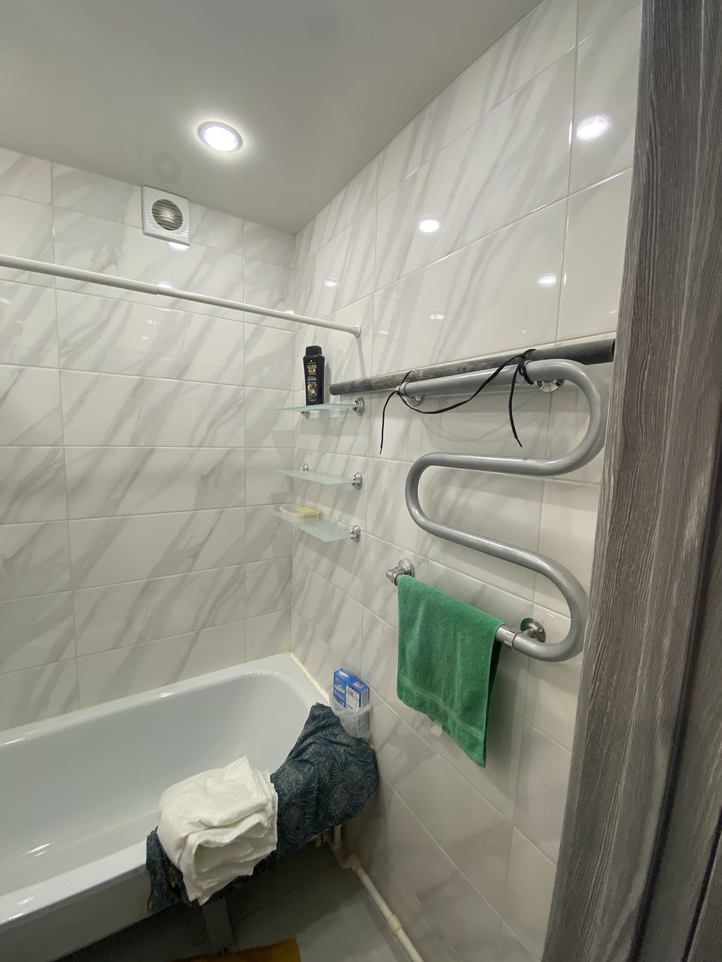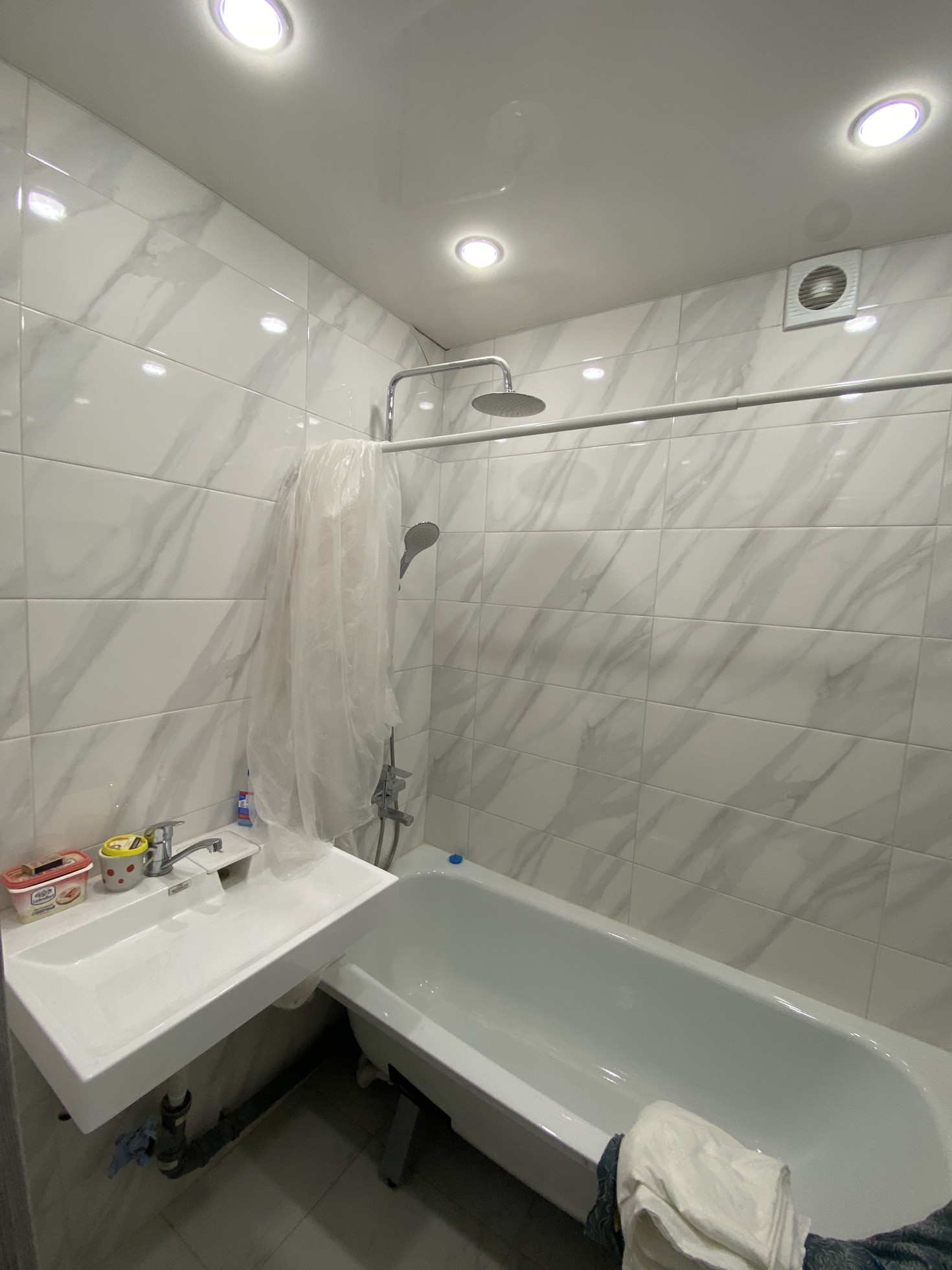 - в туалете и ванной, на стенах положена плитка, установлен новый унитаз и ванная, сменены трубы на пластиковые, установлено освещение, натяжные потолки. Санузел раздельный.