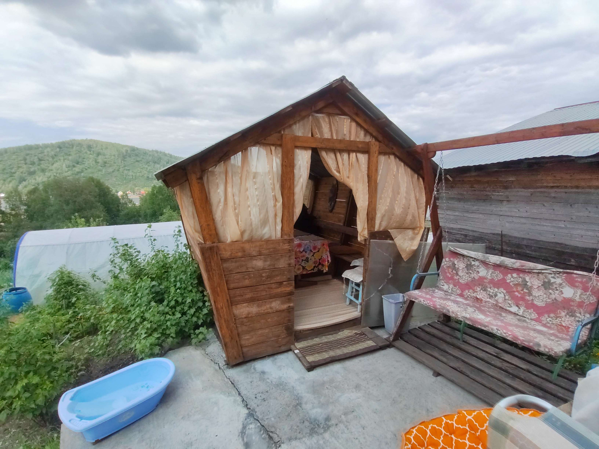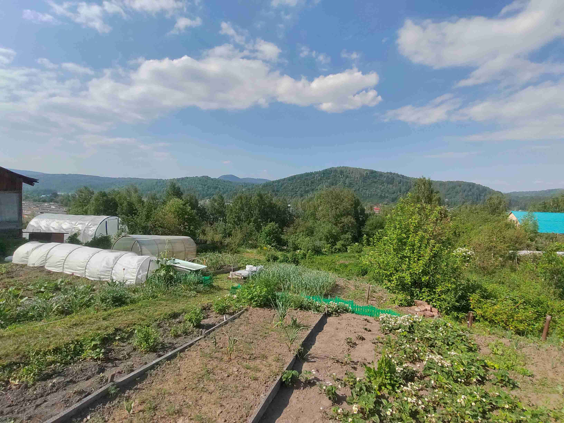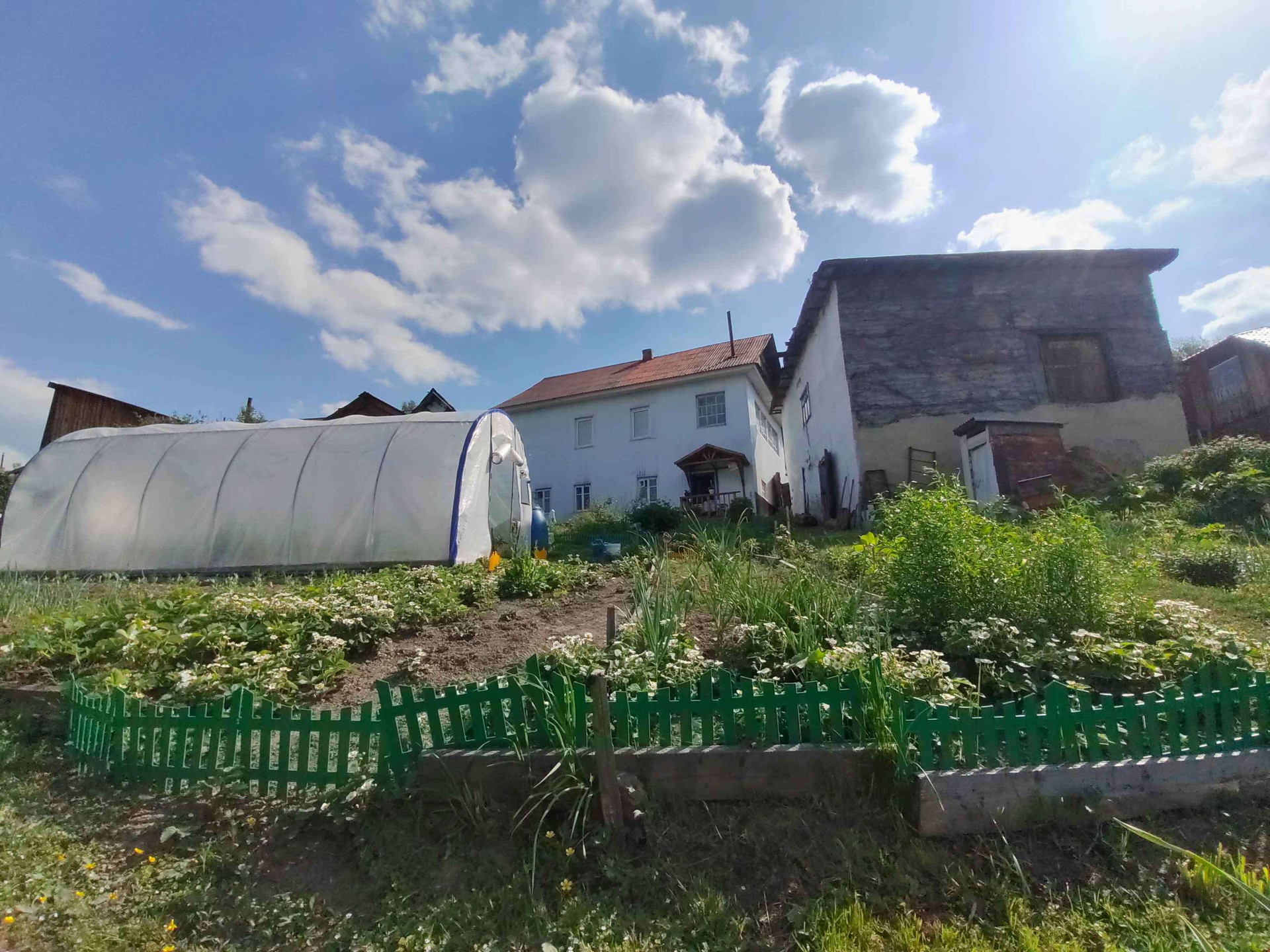 На территории построены баня, беседка, гараж 8*10 под грузовой автомобиль. Теплицы , уличный туалет.