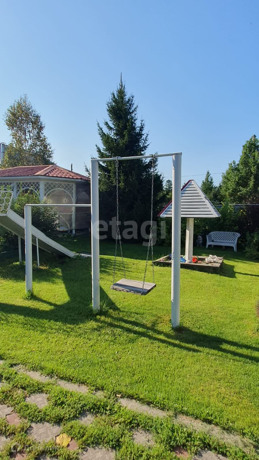 На участке также имеются дополнительные постройки, такие как баня, гостевой дом (который можно использовать как летнюю кухню), беседка с обеденной зоной, мангалом и садовой качелей, два гаража, детская площадка с турниками, горкой и качелями, а также бассейн.