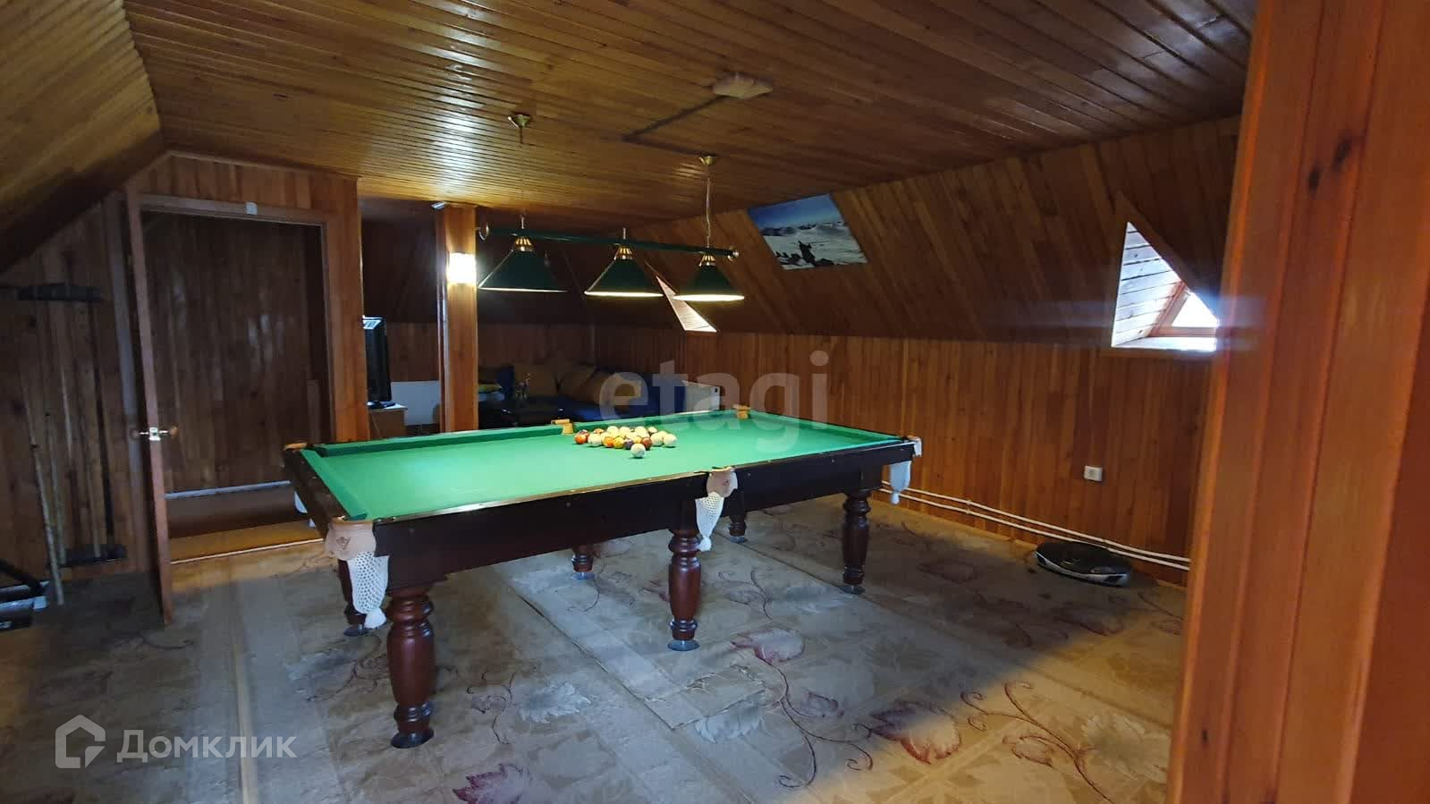 На первом этаже расположена входная зона, кухня, гостиная и раздельный санузел. На втором этаже находятся три спальни и санузел. Третий этаж представляет собой бильярдную и зону отдыха.