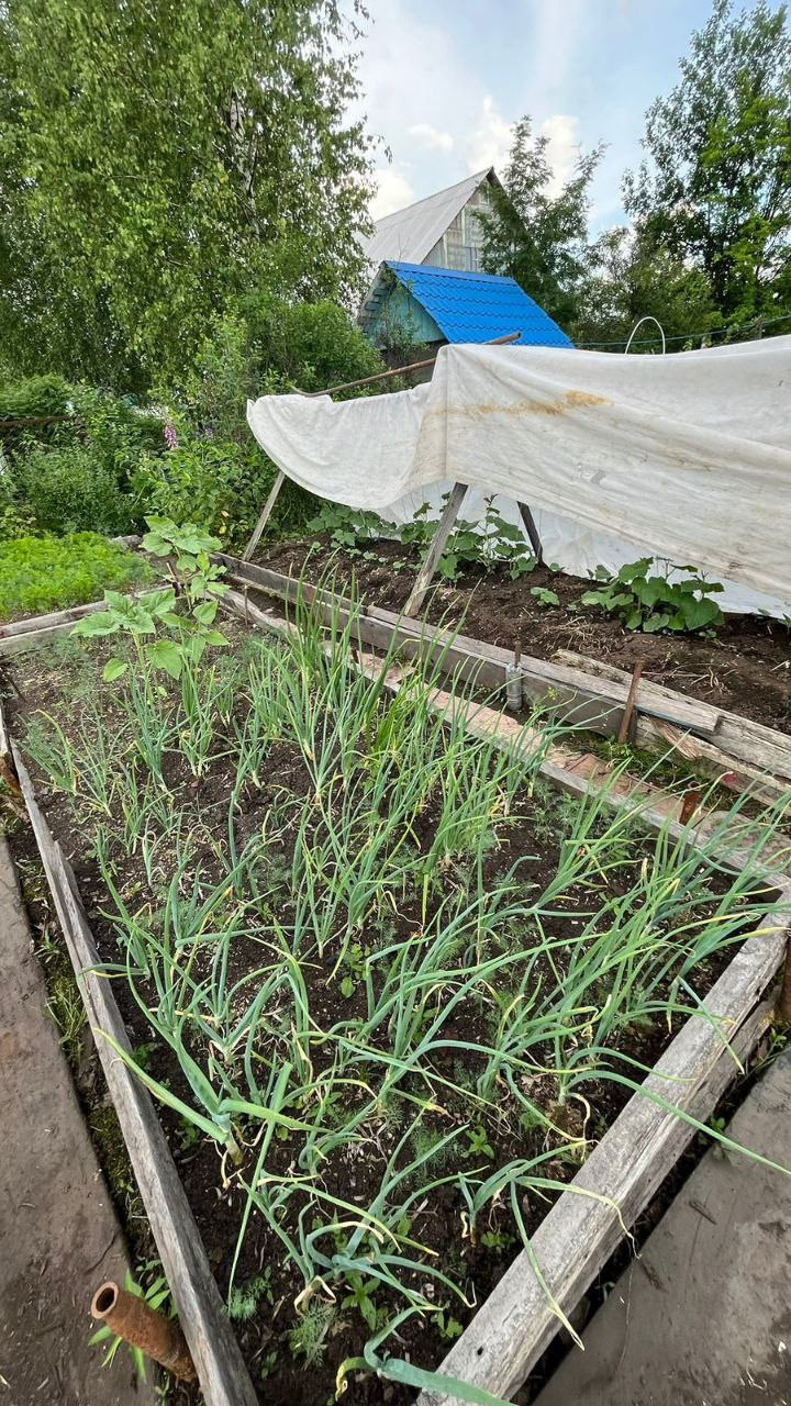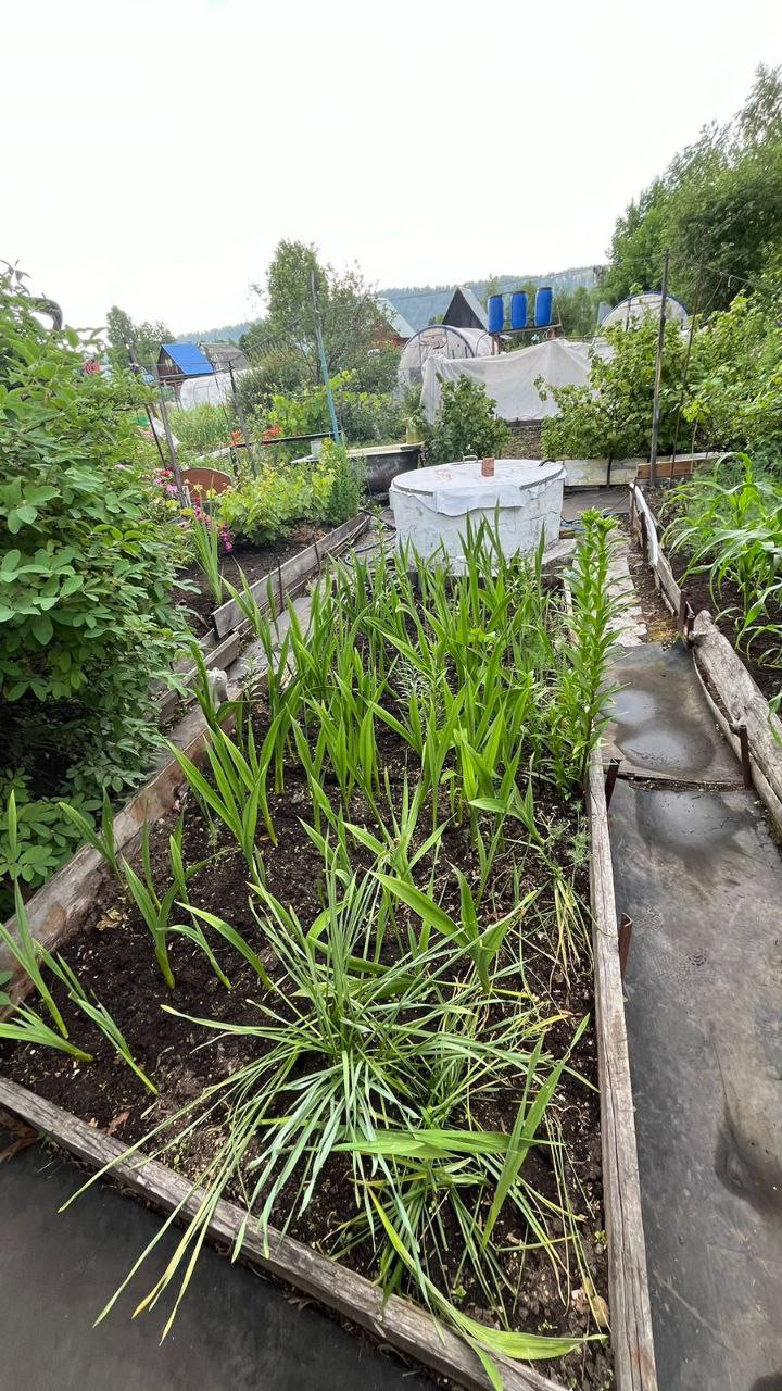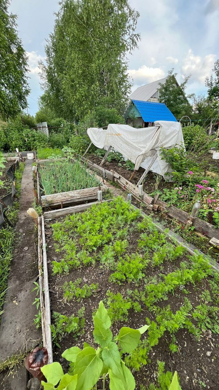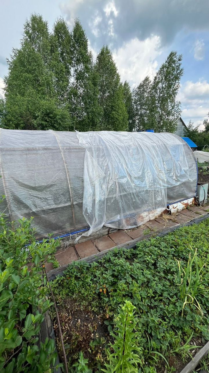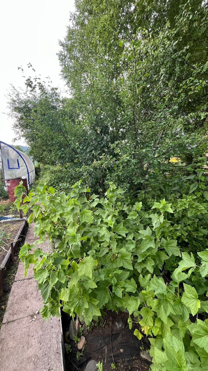 две теплицы на огороде, много грядок, уже все засажено - морковь, огурцы, зелень, помидоры, картошка, кукуруза, различные цветы, малины много, 3 грядки виктории, чеснок, баклажаны, кабачки, земляника, ирга, жимолость, яблоня, череаишня, слива, черноплодка, рябина, сирень, много винограда плодоносного на участке. Все обработано, растет отлично, покупайте сейчас - в сентябре будете с урожаем