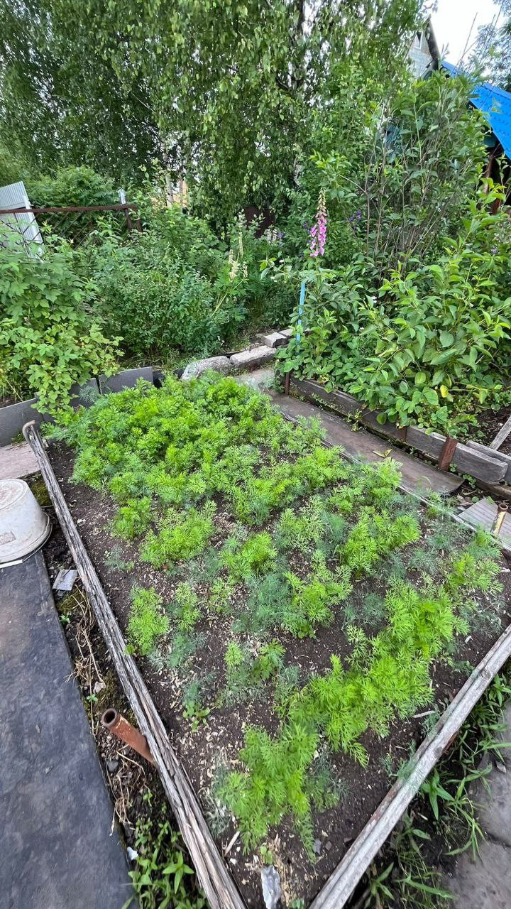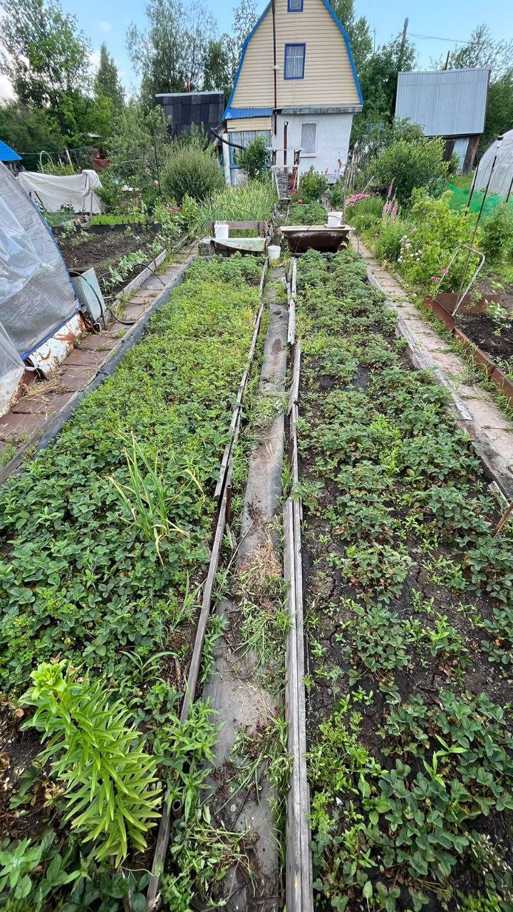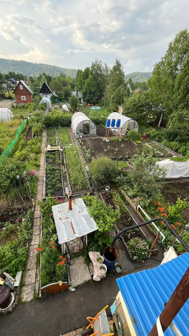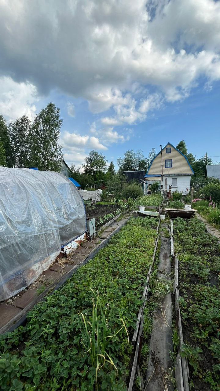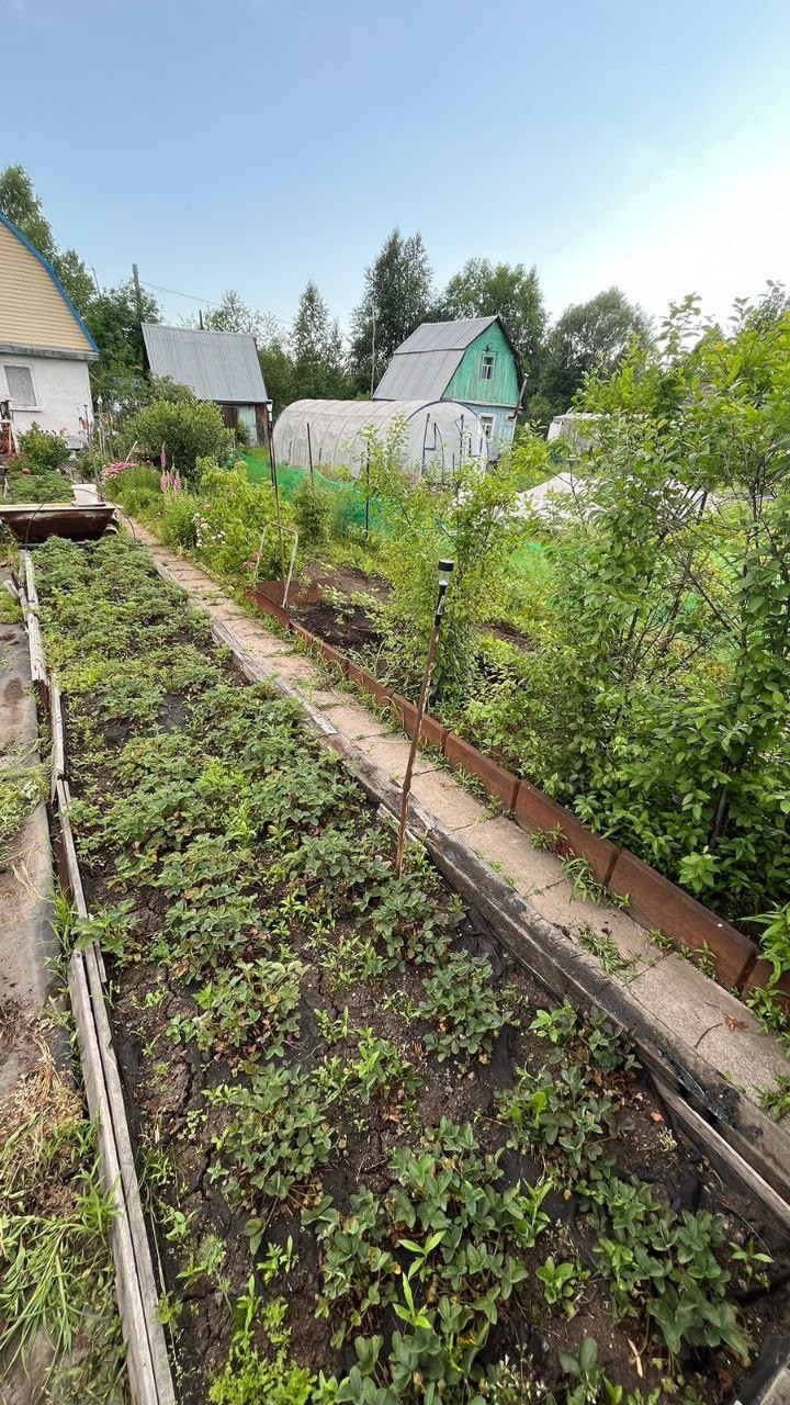две теплицы на огороде, много грядок, уже все засажено - морковь, огурцы, зелень, помидоры, картошка, кукуруза, различные цветы, малины много, 3 грядки виктории, чеснок, баклажаны, кабачки, земляника, ирга, жимолость, яблоня, череаишня, слива, черноплодка, рябина, сирень, много винограда плодоносного на участке. Все обработано, растет отлично, покупайте сейчас - в сентябре будете с урожаем